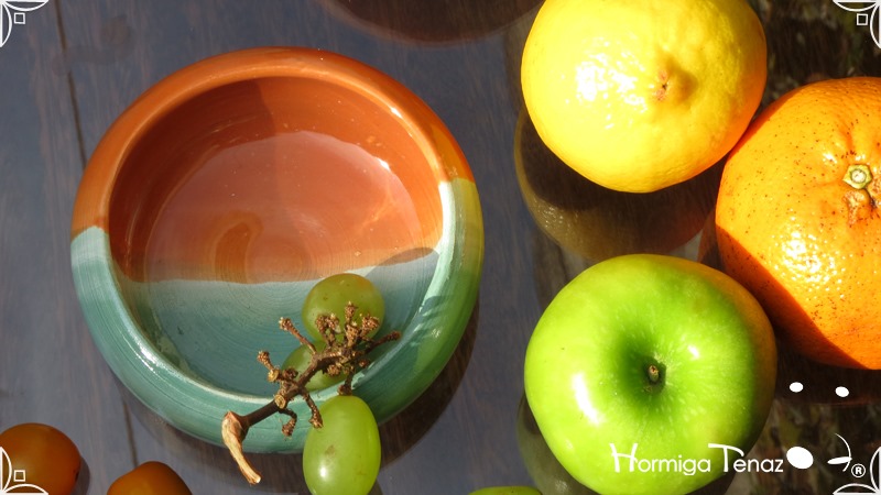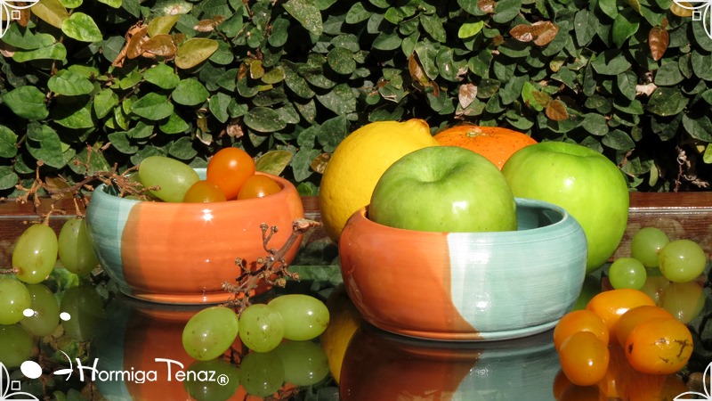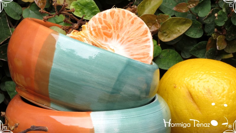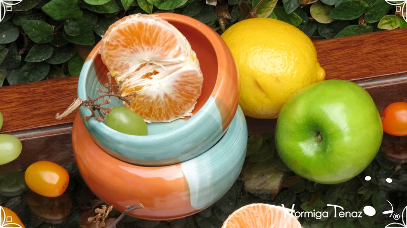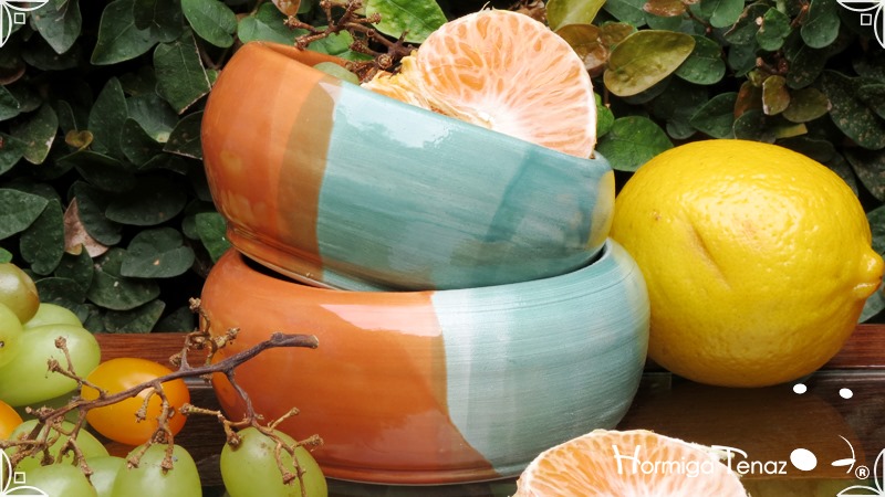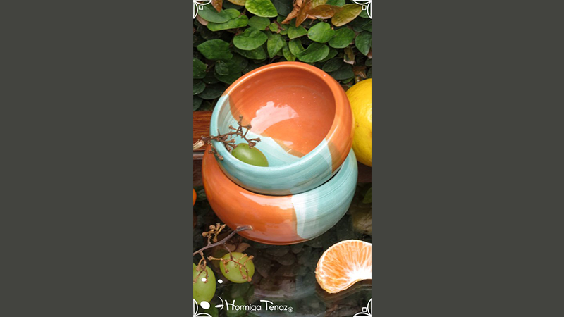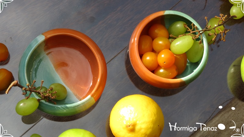 Cuencos pequeños de cerámica realizados en dos colores diferentes fusionados, verde pastel y naranja.