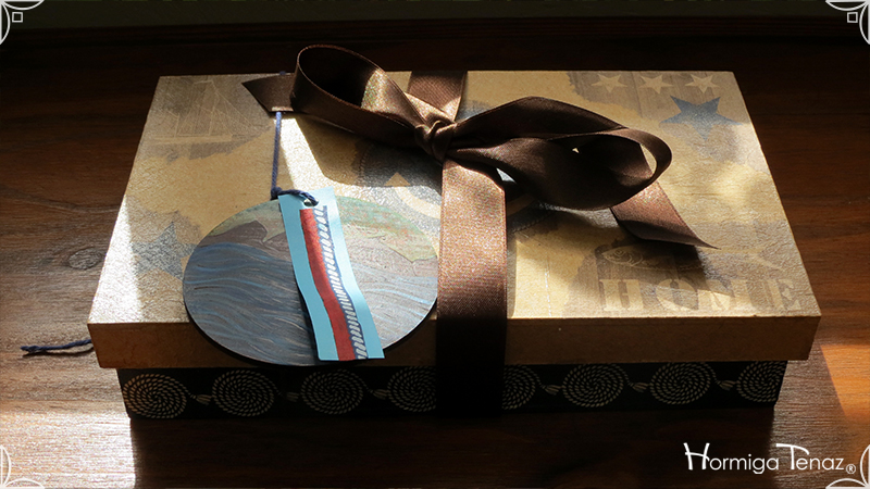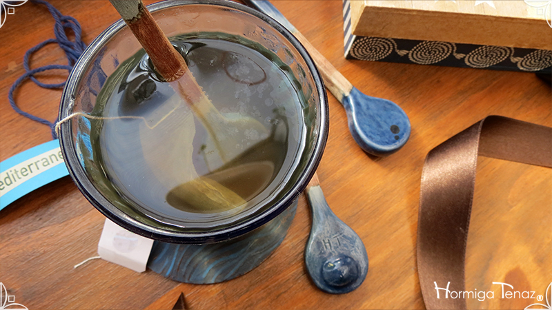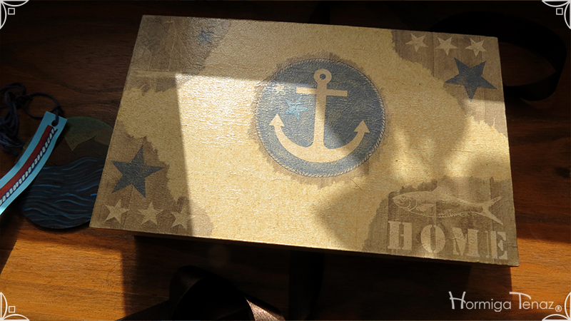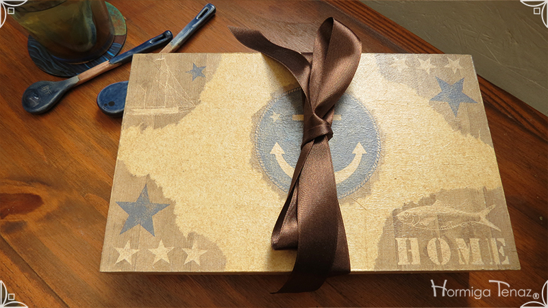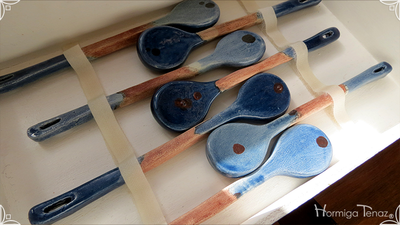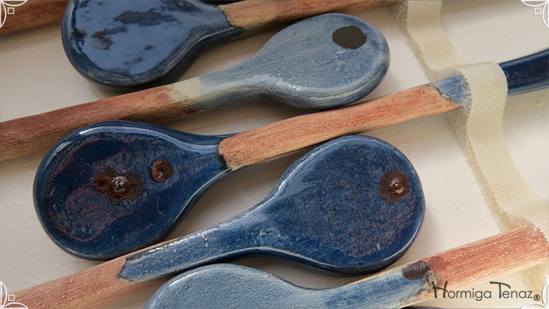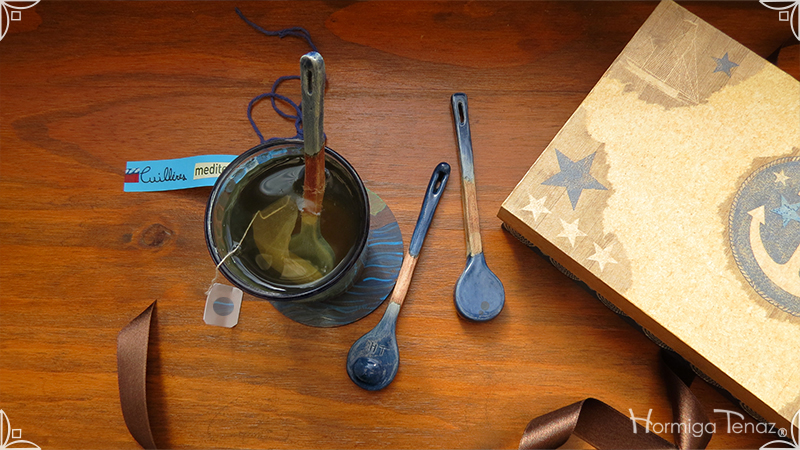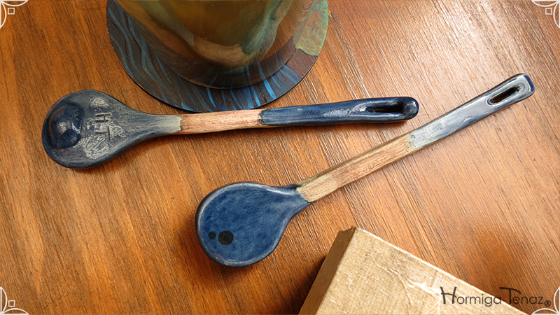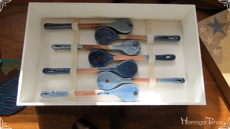 Siete cucharas realizadas en cerámica, en un diseño de formas orgánicas con colores combinados en distintos tonos de azul mediterráneo y marrón. Preservadas en su caja de madera con cordones de velcro en el interior para sujetar las cucharas, decorada además, con la técnica de decoupage en una temática marítima y ornamentada con un cierre de cinta de raso chocolate.