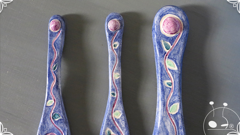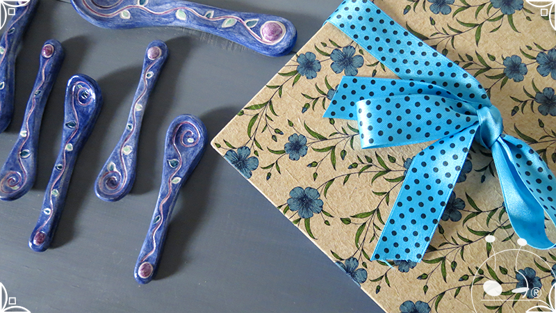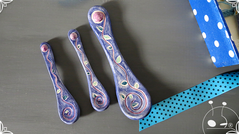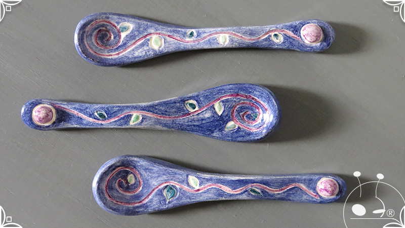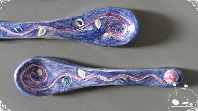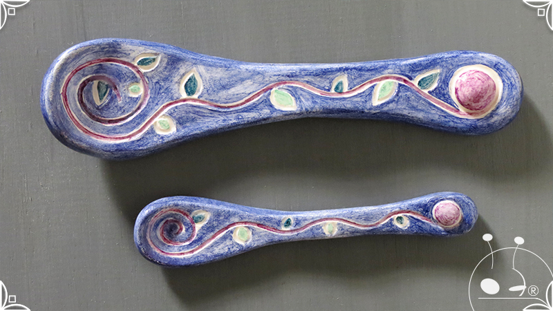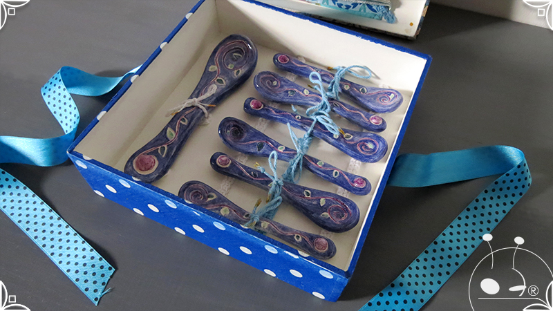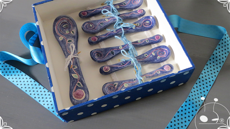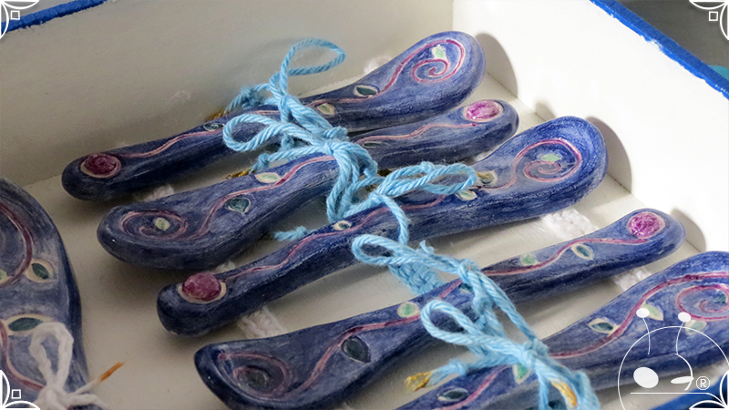Seis cucharas pequeñas y una cuchara grande, realizadas en cerámica artesanal y esgrafiadas con motivos vegetales en colores azul, violeta y verde. Preservadas en su caja de madera con cordones de crochet para sujetar las cucharas, decorada además, con la técnica de decoupage y ornamentada con un cierre de cinta de raso a lunares.