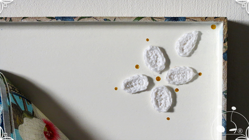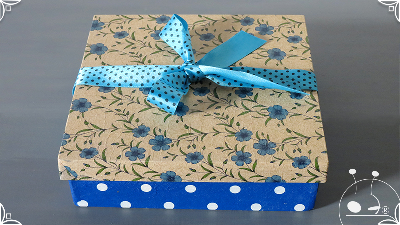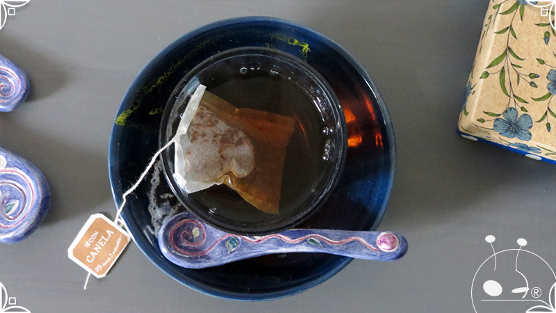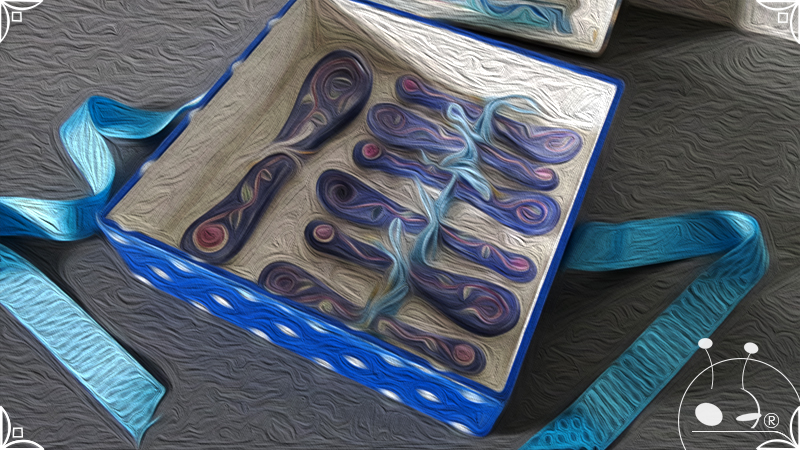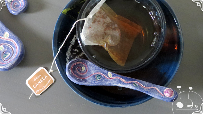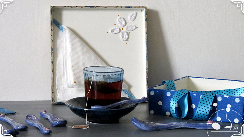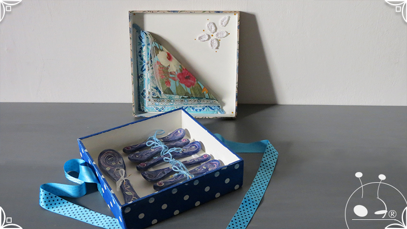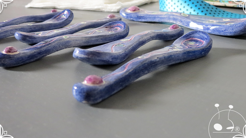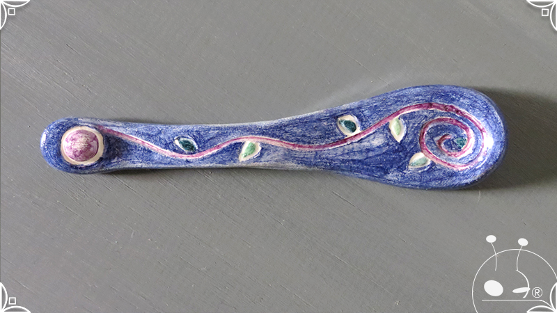 Seis cucharas pequeñas y una cuchara grande, realizadas en cerámica artesanal y esgrafiadas con motivos vegetales en colores azul, violeta y verde. Preservadas en su caja de madera con cordones de crochet para sujetar las cucharas, decorada además, con la técnica de decoupage y ornamentada con un cierre de cinta de raso a lunares.