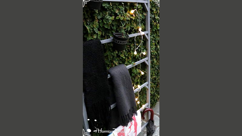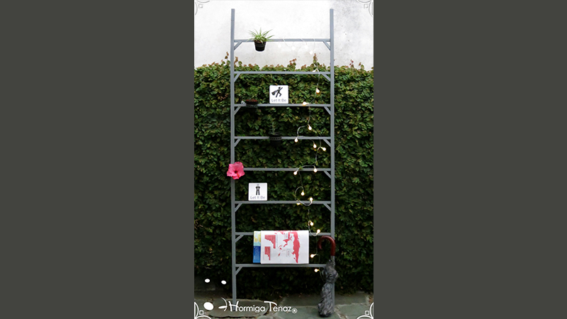 Escalera de madera pintada en color gris y barnizada con barniz mate, con 8 peldaños reforzados. Ideal para organizar y decorar el hogar ocupando poco espacio. Medidas: 60 cm de ancho x 1,80 m de alto. Escalera presentada en las fotos junto con los Imanes Let It Be.