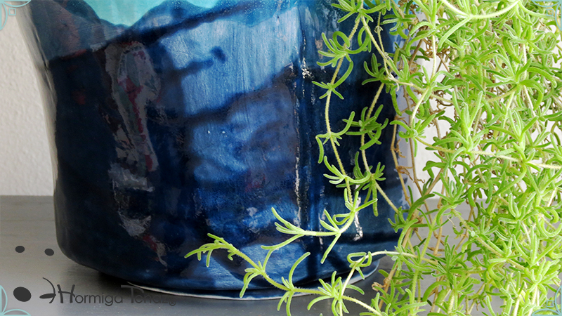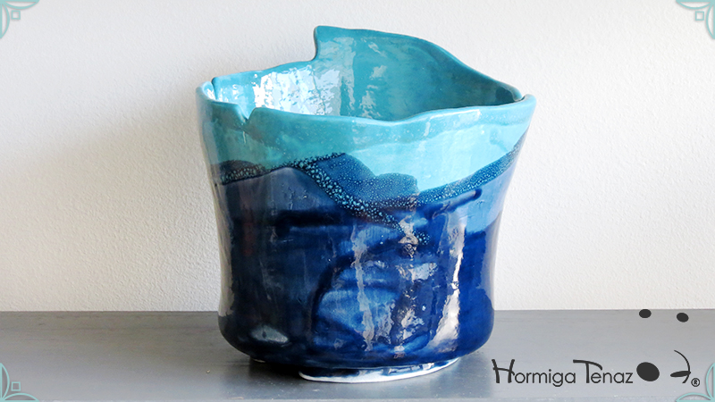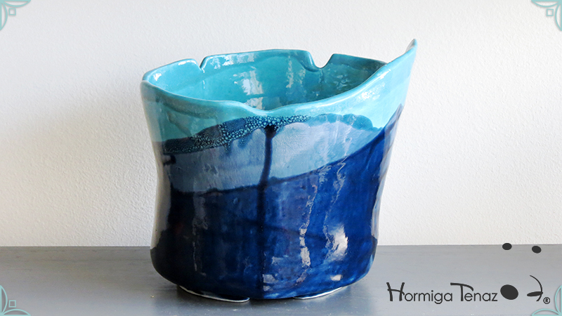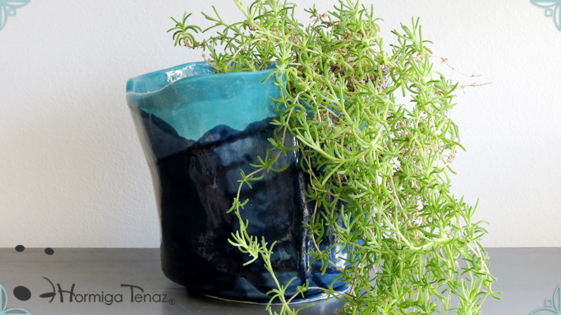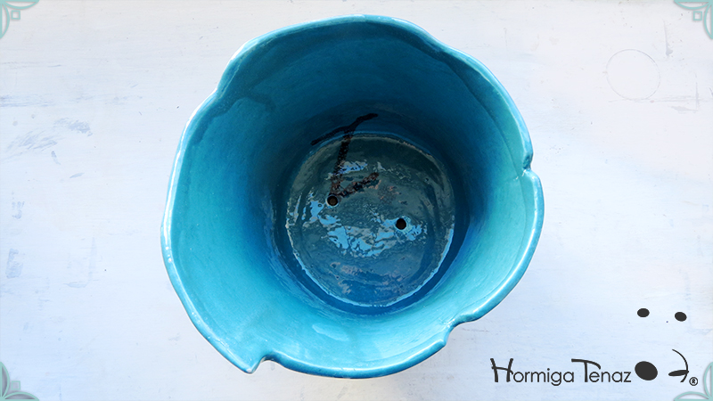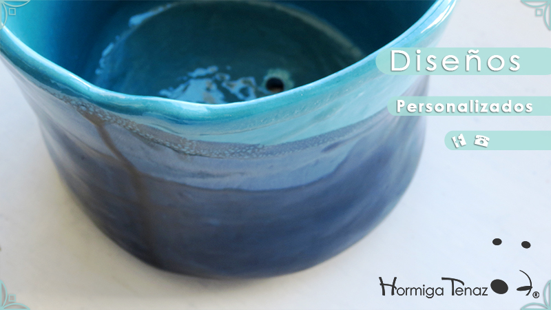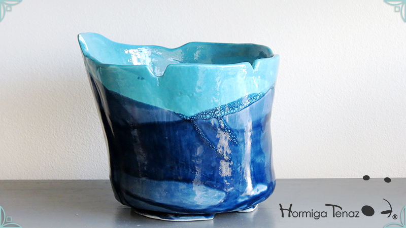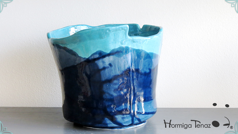 Diseño personalizado de Macetas Borrachitas, realizada en cerámica artesanal y esmaltada con una fusión de dos colores, azul chino y turquesa.
