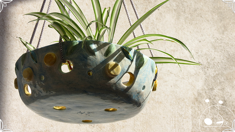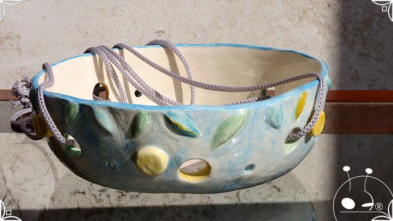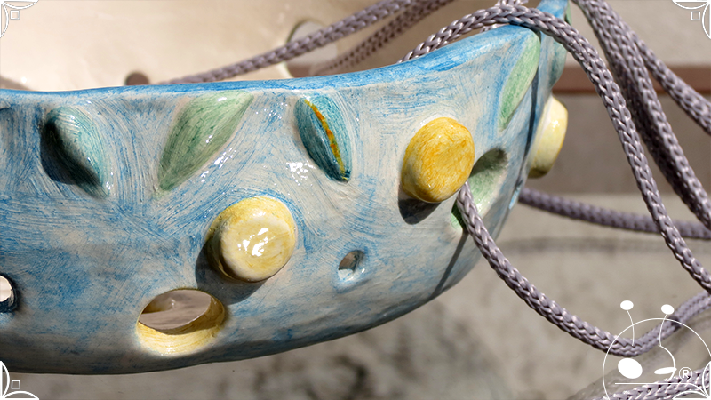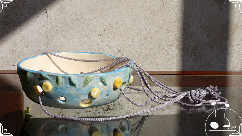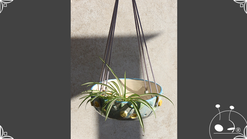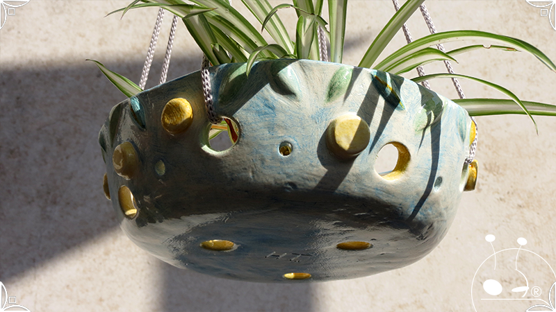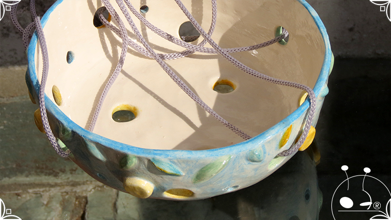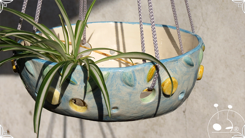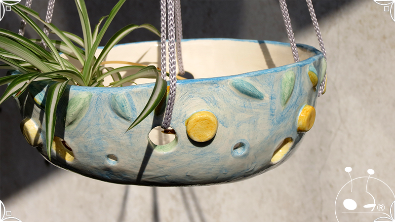Maceta colgante calada para orquídeas epífitas, realizada en cerámica artesanal en bajorrelieves abstractos y vegetales en tonos celestes, amarillos y verdes. Complementada, además, con cordones de nylon gris para su colgado.