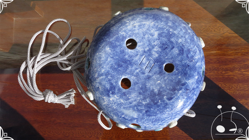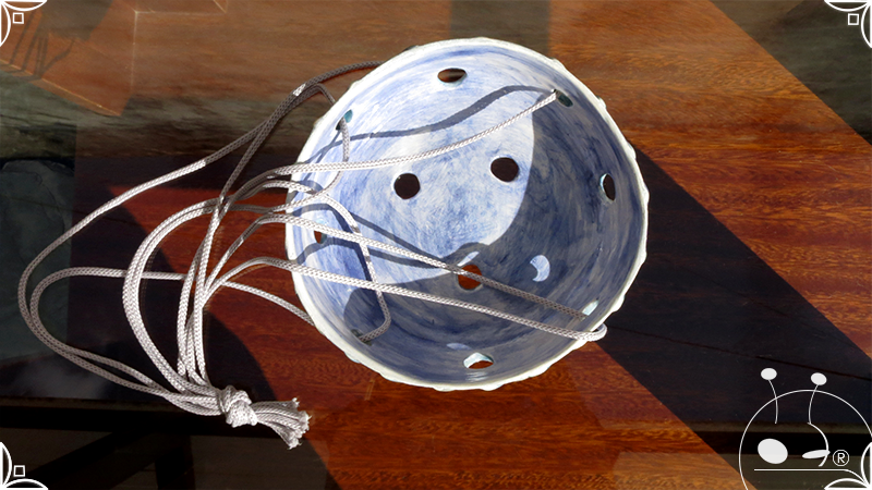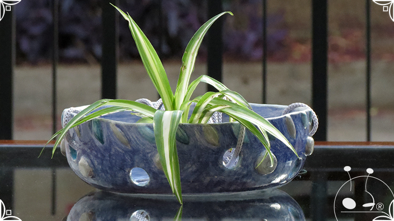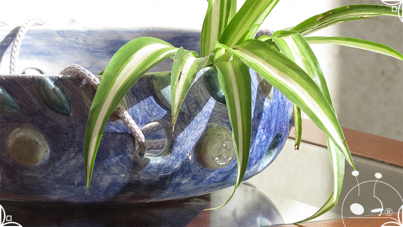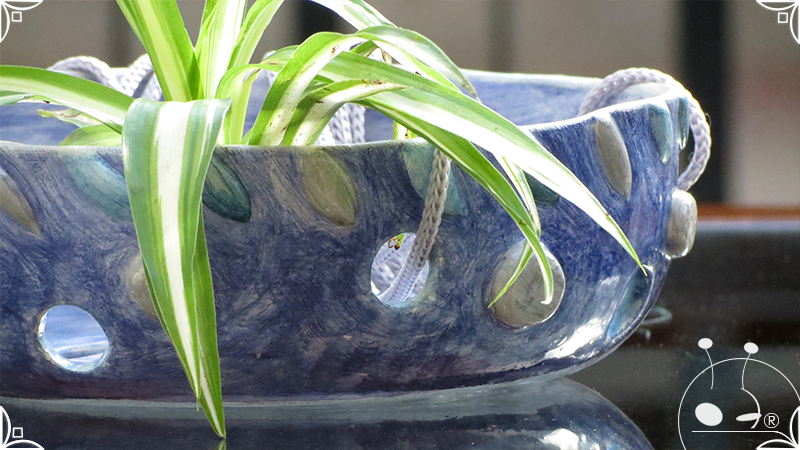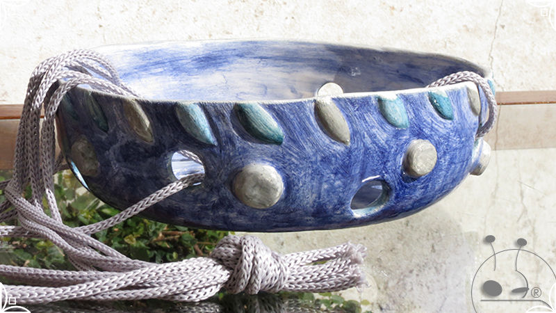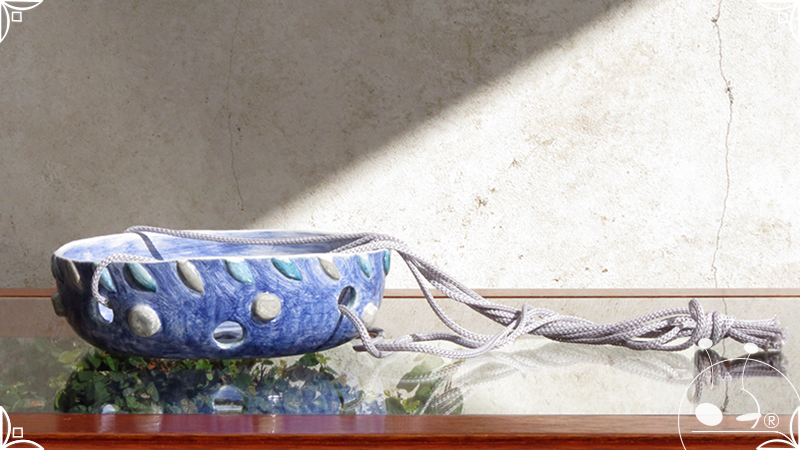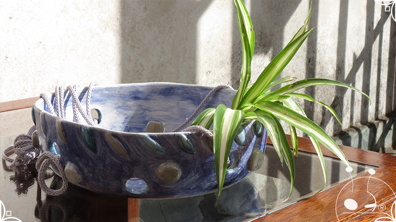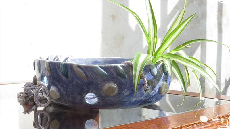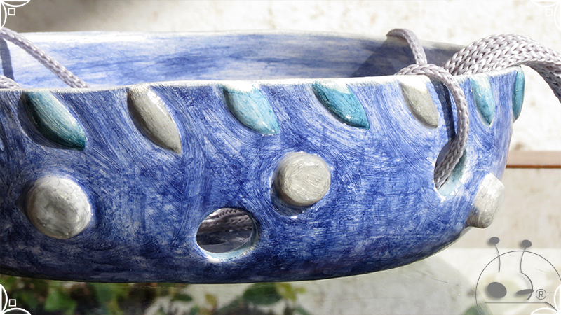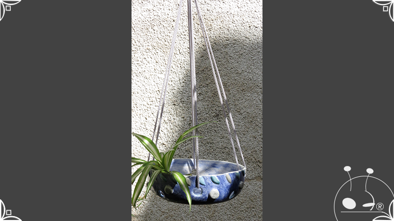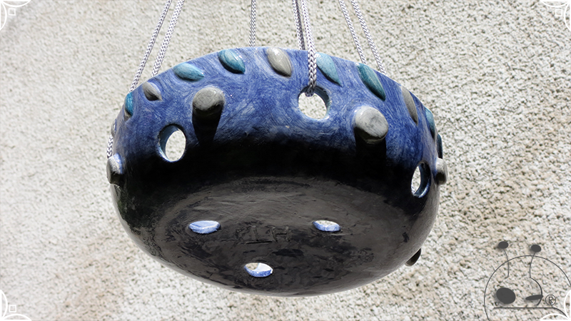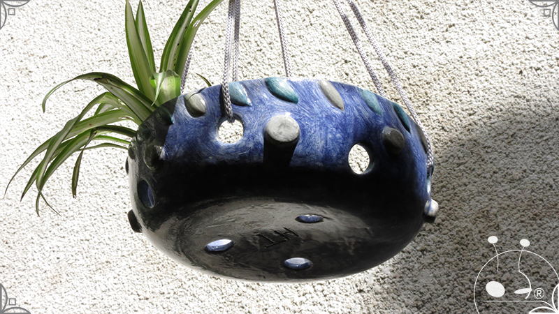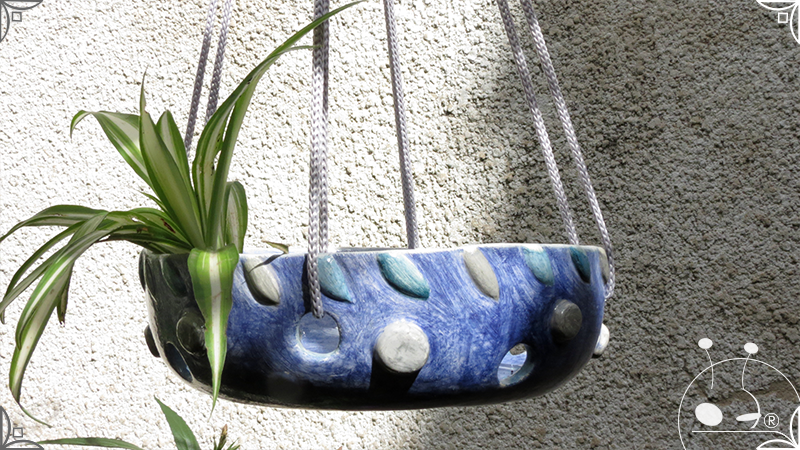 Maceta colgante calada para orquídeas epífitas, realizada en cerámica artesanal en bajorrelieves abstractos y vegetales en tonos azules y grises. Complementada, además, con cordones de nylon gris para su colgado.