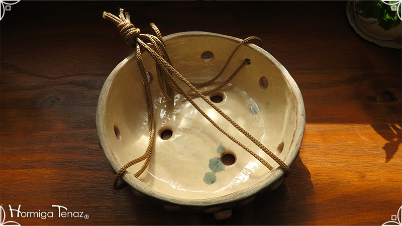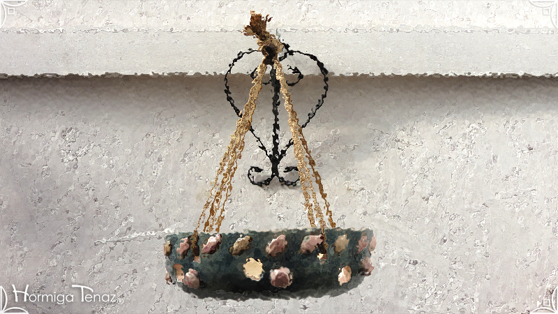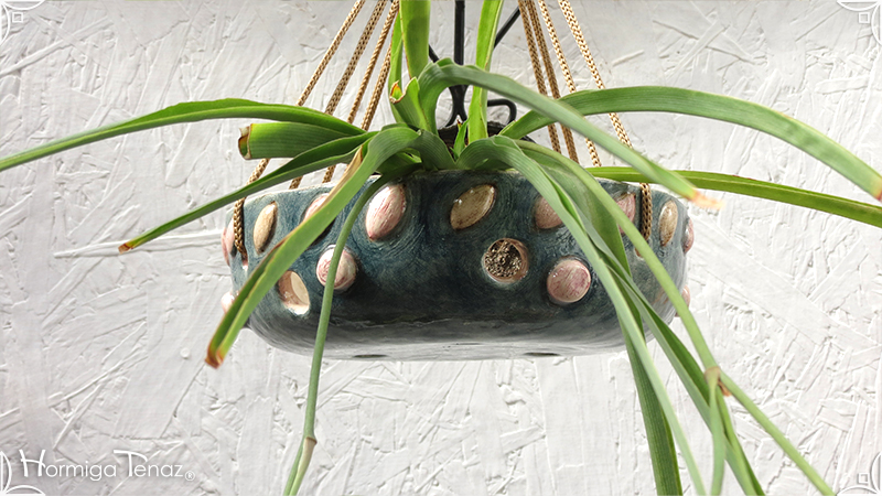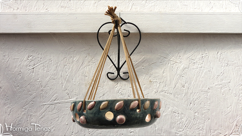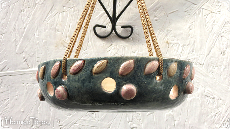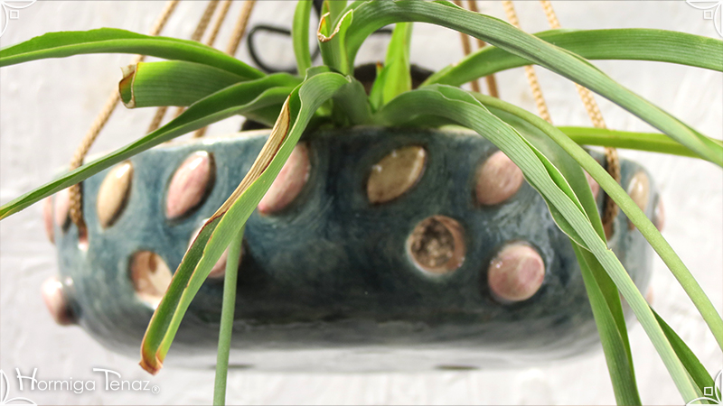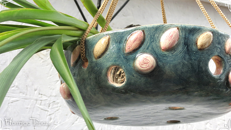 Maceta colgante calada para orquídeas epífitas y plantas que requieran que sus raíces permanezcan ventiladas. Es una pieza realizada en cerámica artesanal con bajorrelieves abstractos y orgánicos en tonos rosa y canela. Complementada, además, con cordones de nylon marrón para su colgado.