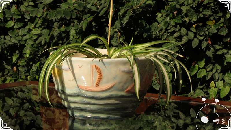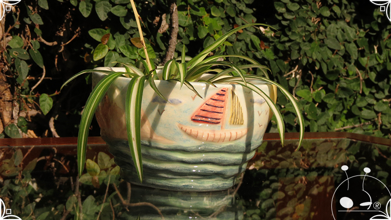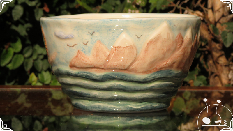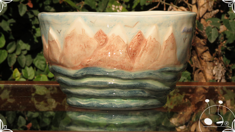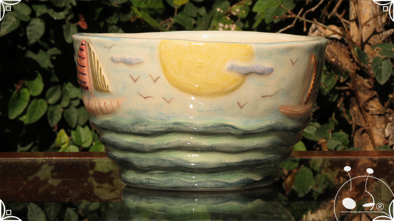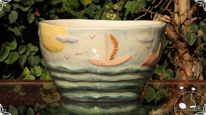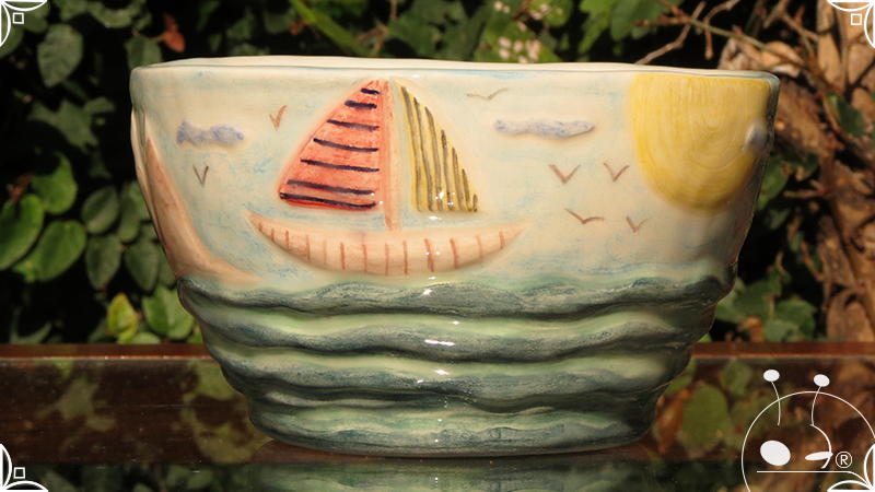 Maceta cónica pequeña realizada en cerámica artesanal, con abundantes bajorrelieves desarrollados en una temática marítima, con una paleta de colores caribeña.