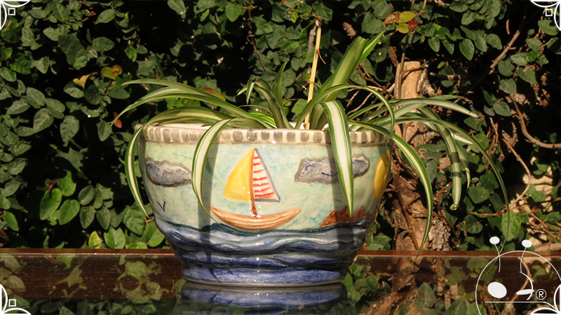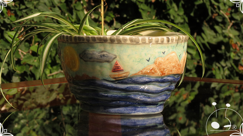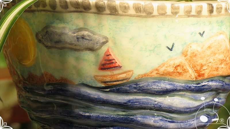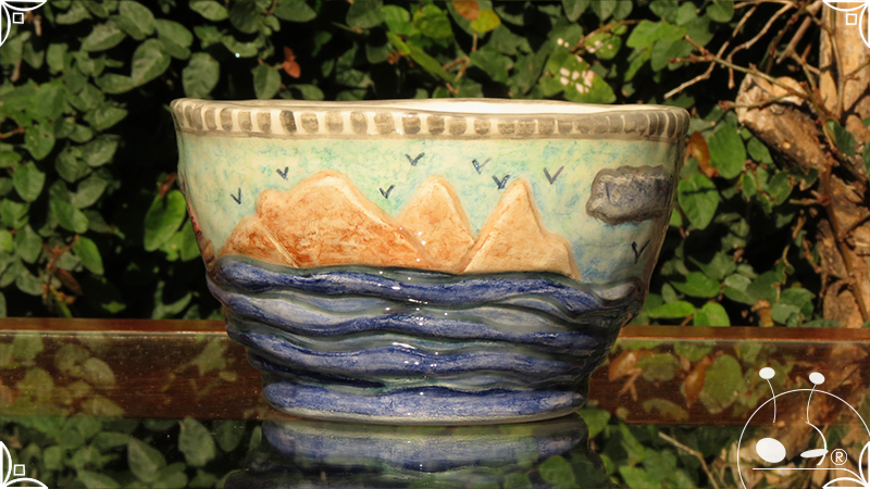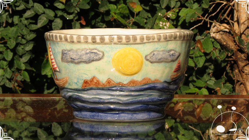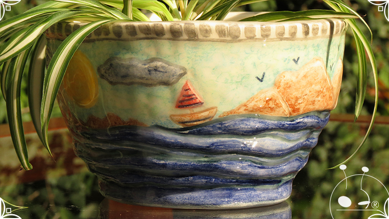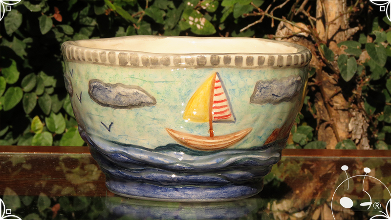 Maceta cónica pequeña realizada en cerámica artesanal, con abundantes bajorrelieves desarrollados en una temática marítima, con una paleta de colores mediterránea.