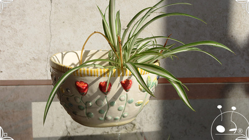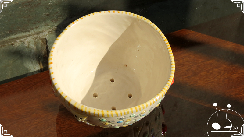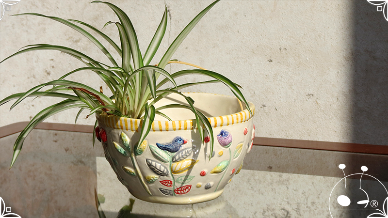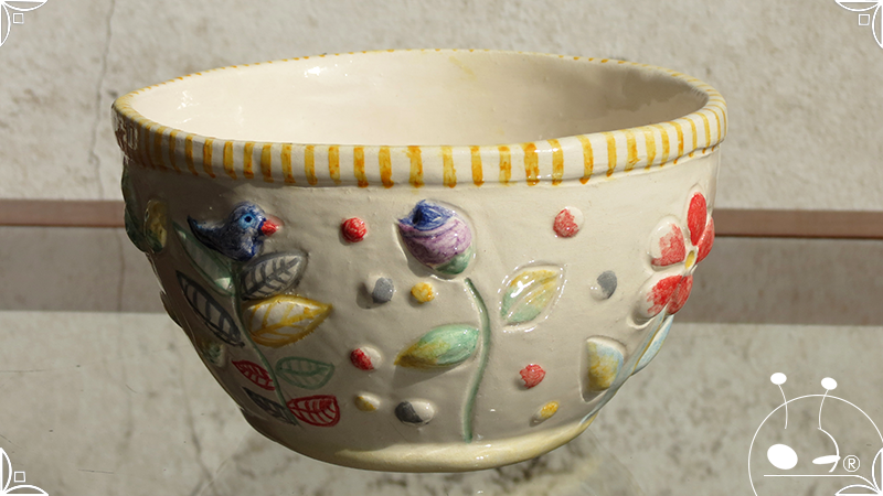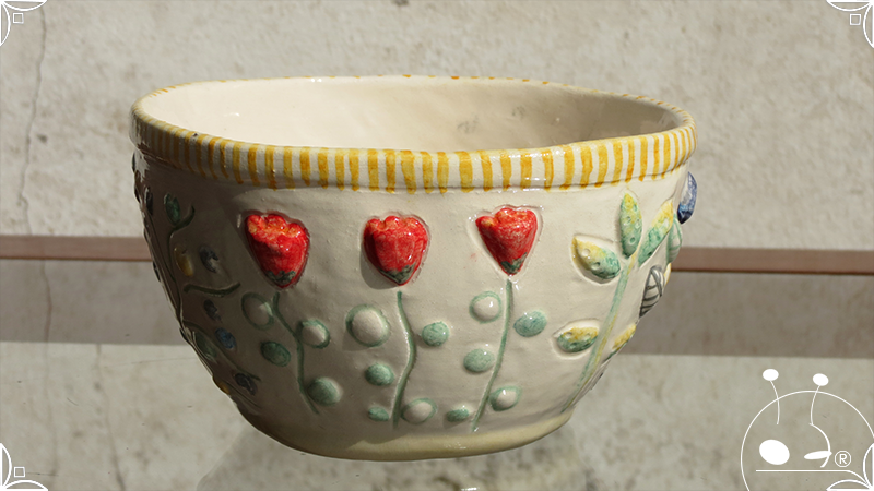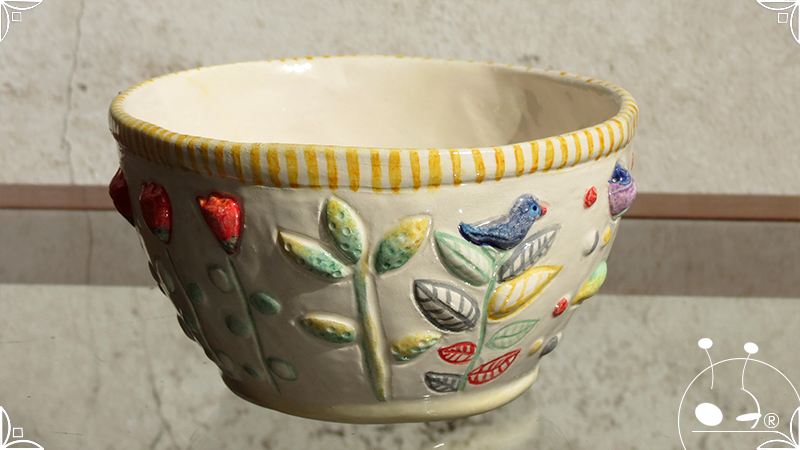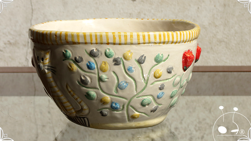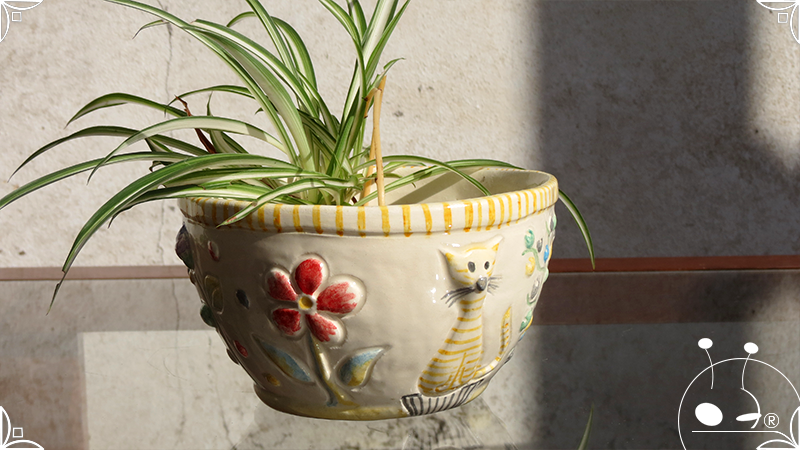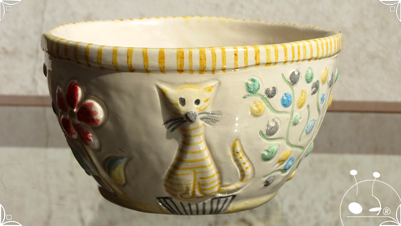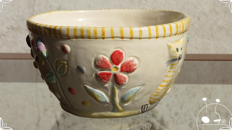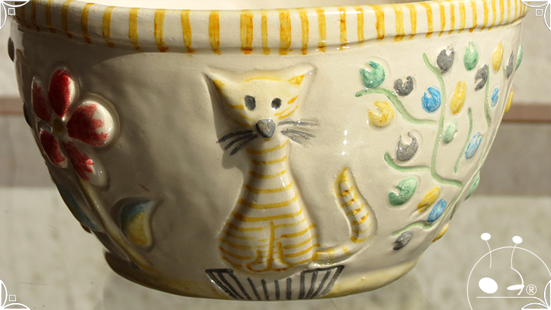 Maceta cónica pequeña realizada en cerámica artesanal, con abundantes bajorrelieves en la temática de un jardín colorido y la apreciada presencia de un analítico gatito.