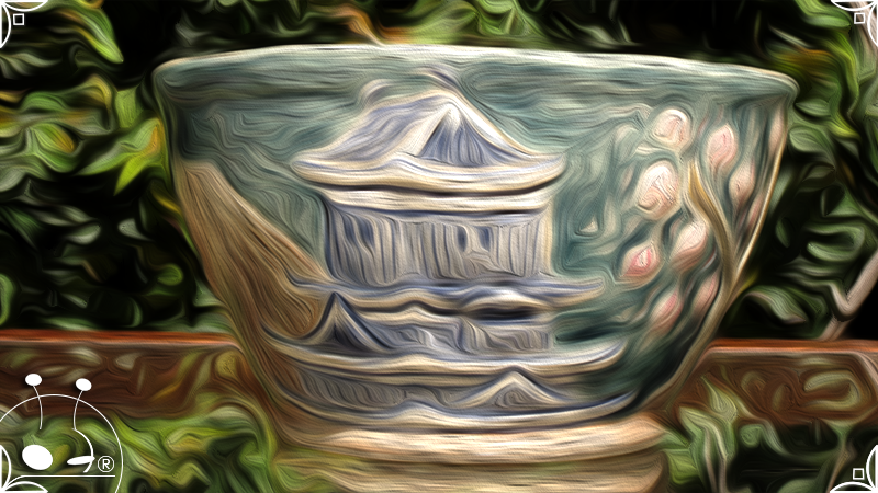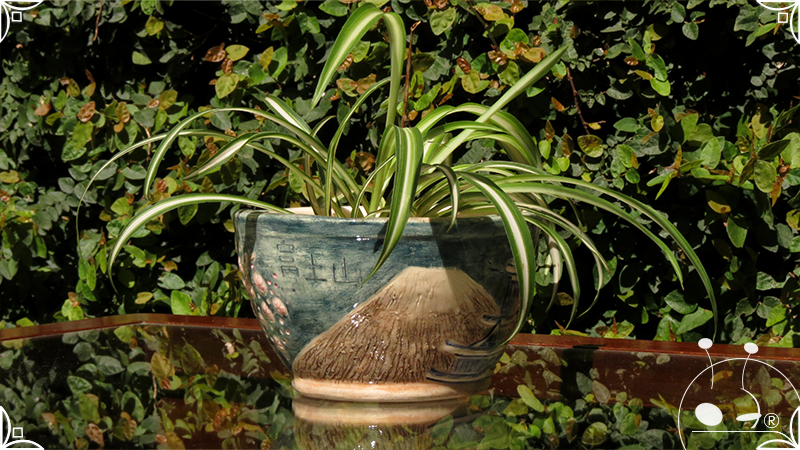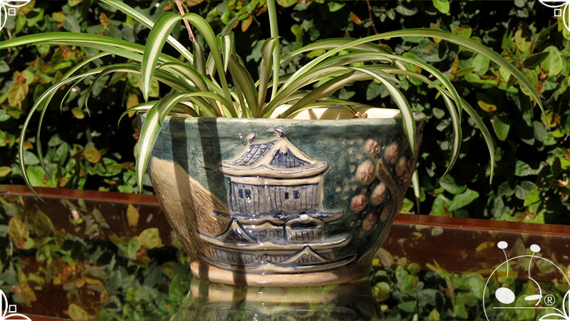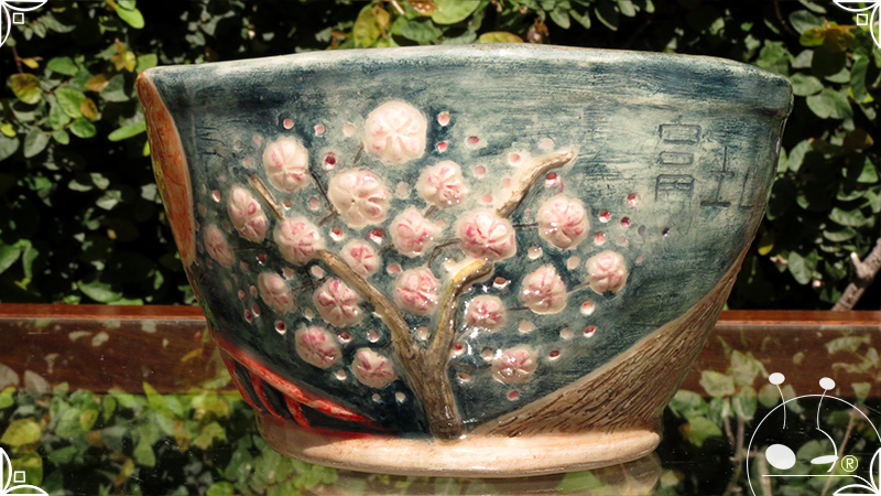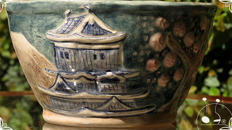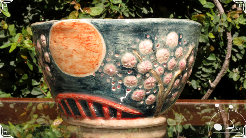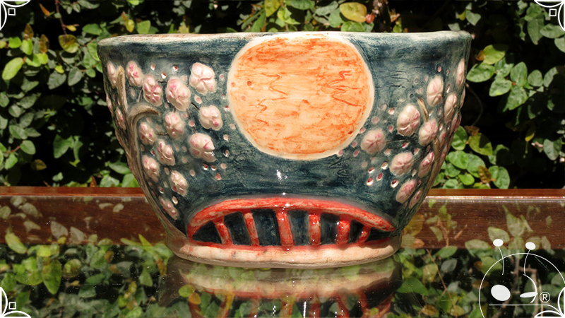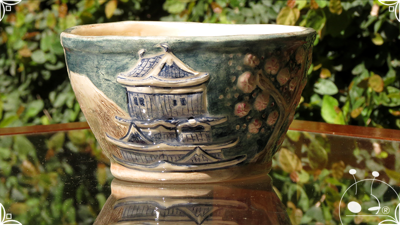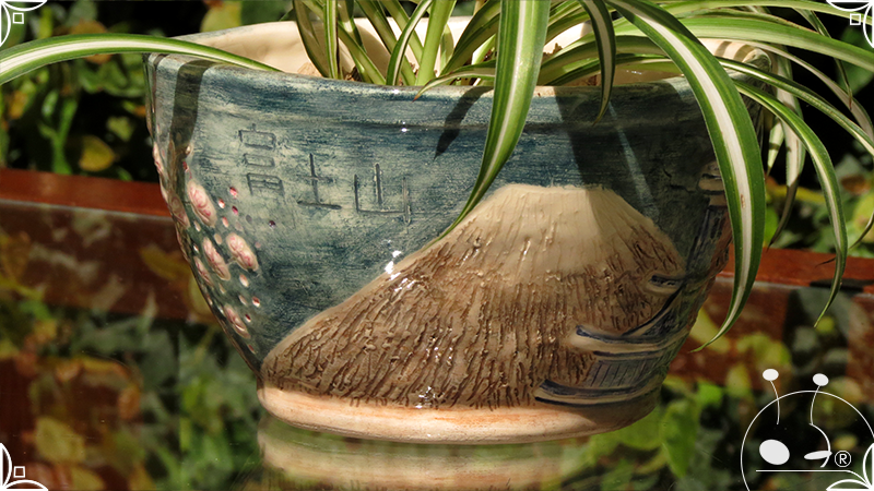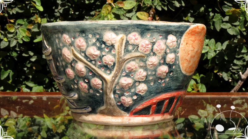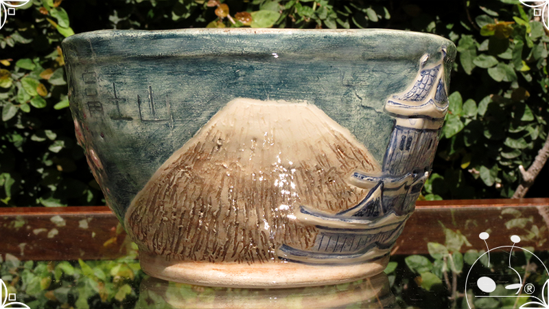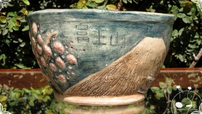 Maceta cónica pequeña realizada en cerámica artesanal, en ella se crearon profusos bajorrelieves para dar forma a una conocida postal de Japón, el Monte Fuji. En la composición destaca la arquitectura única del país, como el palacio Japonés Matsumoto, el puente rojo, cerezos en flor y el mismo imponente monte Fuji con su inscripción en japonés, interactuando con los restantes elementos del paisaje.