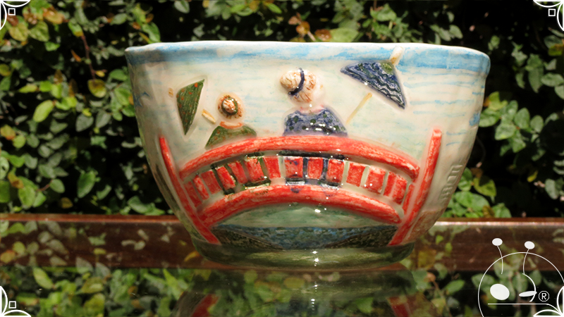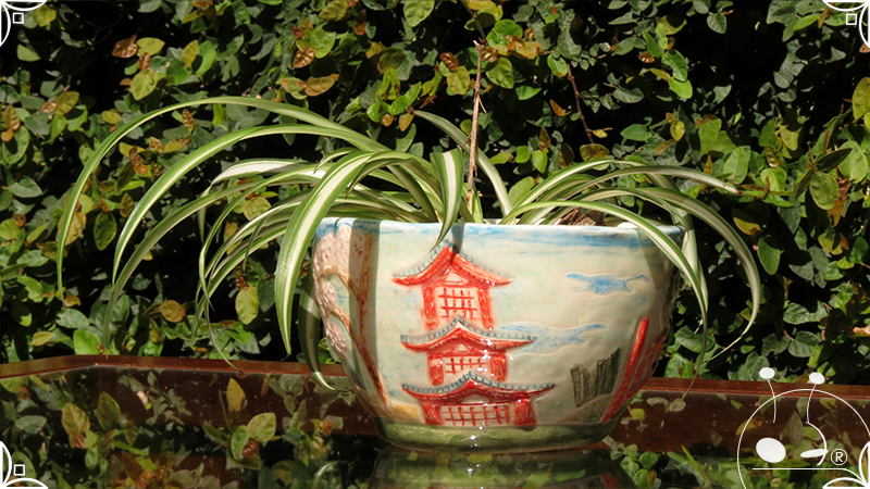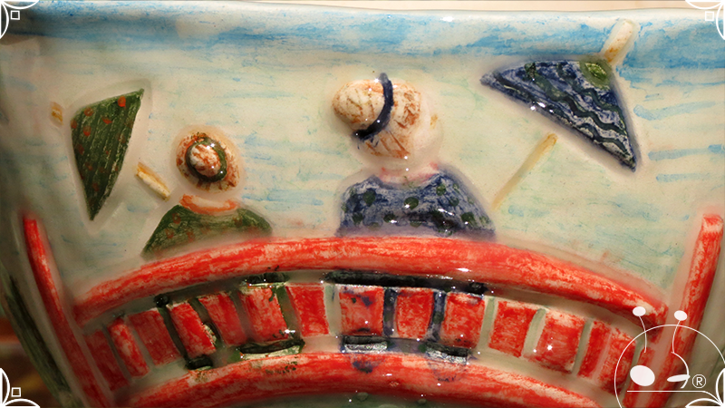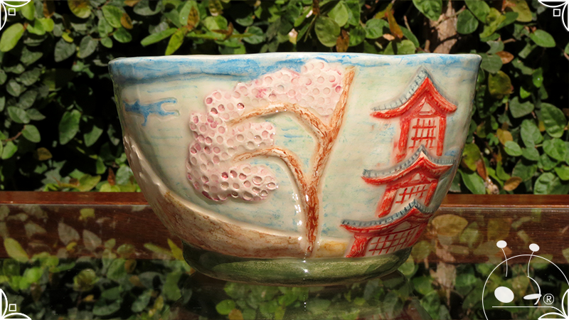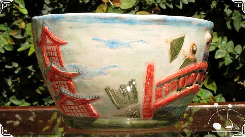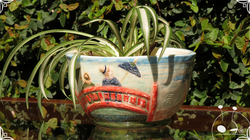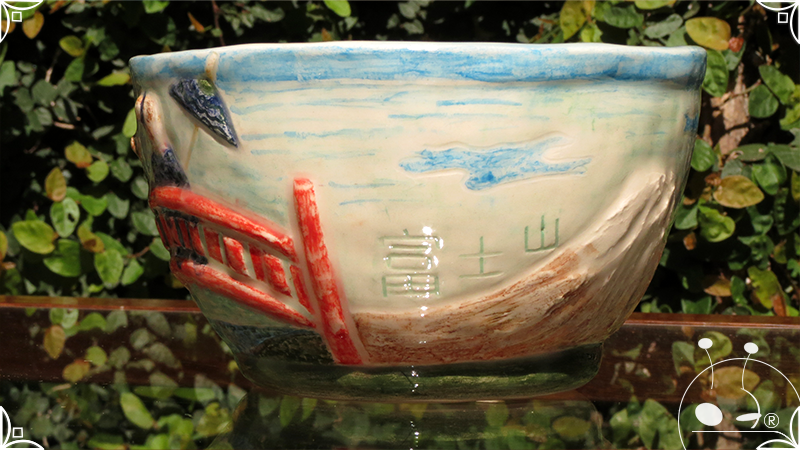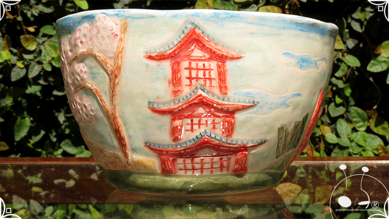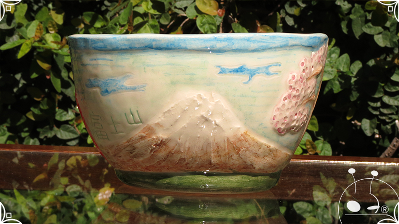 Maceta cónica pequeña realizada en cerámica artesanal, en ella se crearon profusos bajorrelieves para dar forma a una conocida postal de Japón, el Monte Fuji. En la composición destaca la arquitectura única del país, como la pagoda Chureito, el puente rojo con geishas de paseo, cerezos en flor y el mismo imponente monte Fuji con su inscripción en japonés, interactuando con los restantes elementos del paisaje.