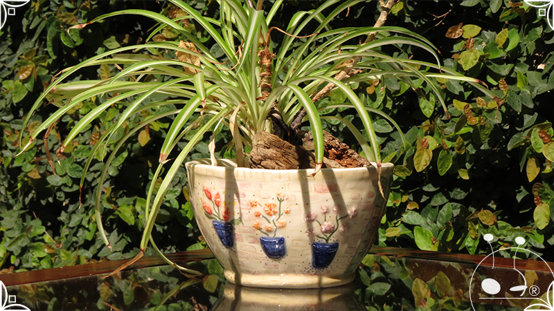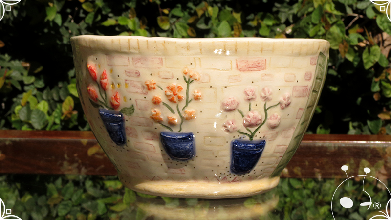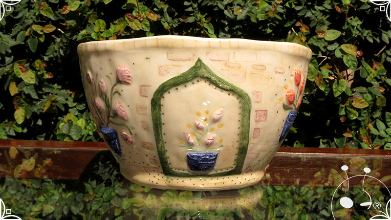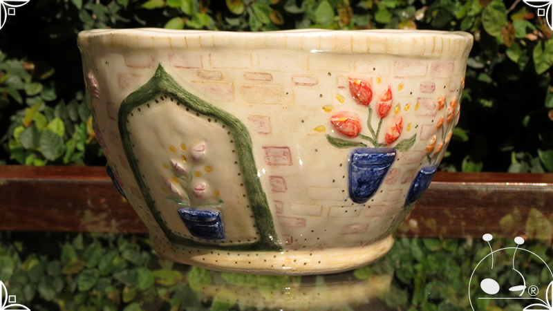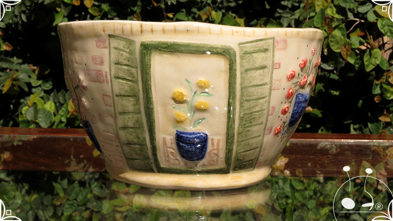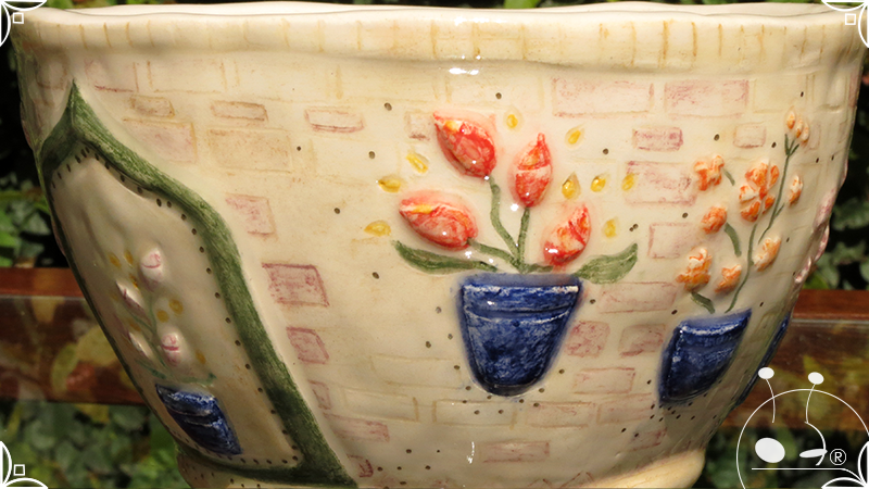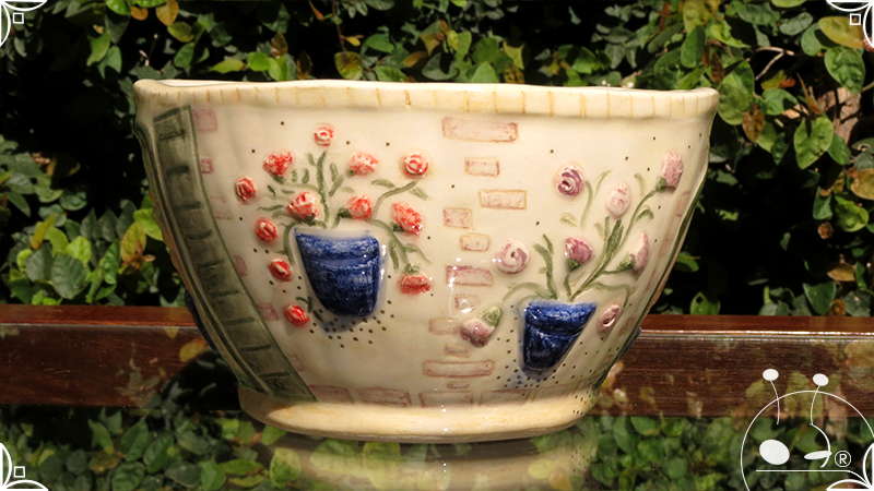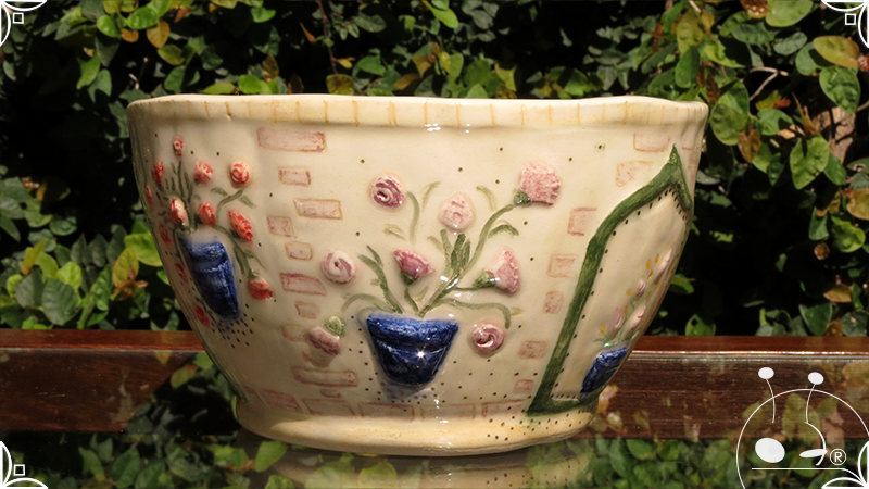 Maceta cónica pequeña realizada en cerámica artesanal, en ella se crearon profusos bajorrelieves inspirados en los Patios de Córdoba, España, evocando así, sus colores contrastados, macetas, sus muchas flores, y la presencia de su historia en elementos únicos y ornamentanciones de las fachadas.