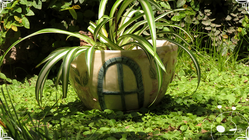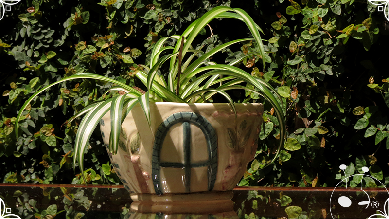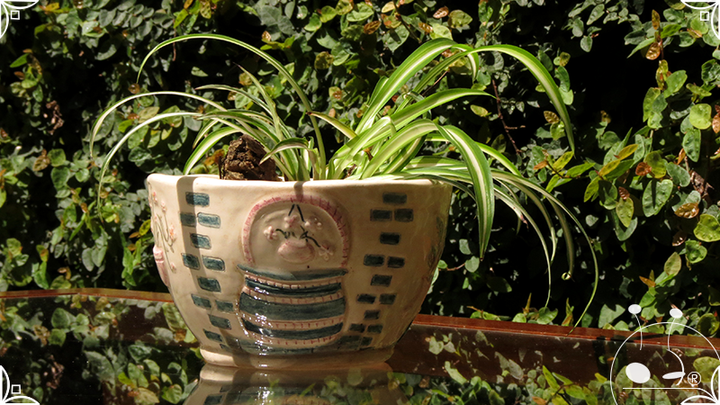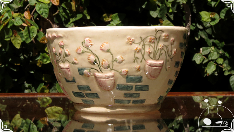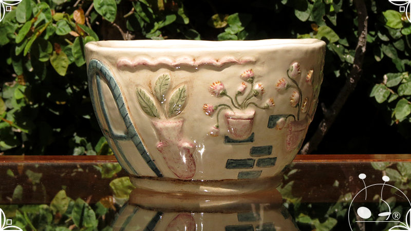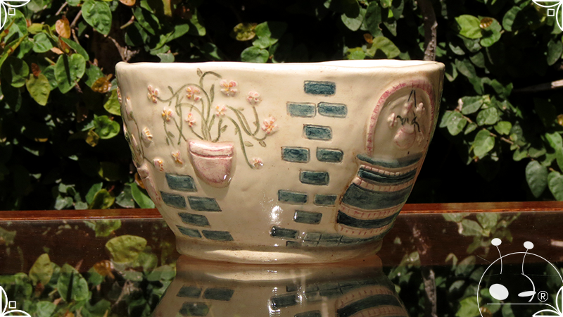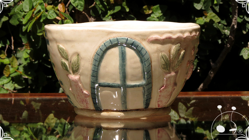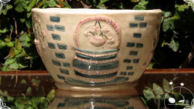 Maceta cónica pequeña realizada en cerámica artesanal, en ella se crearon profusos bajorrelieves inspirados en los Patios de Córdoba, España, evocando así, sus colores contrastados, macetas, sus muchas flores, y la presencia de su historia en elementos únicos y ornamentanciones de las fachadas.