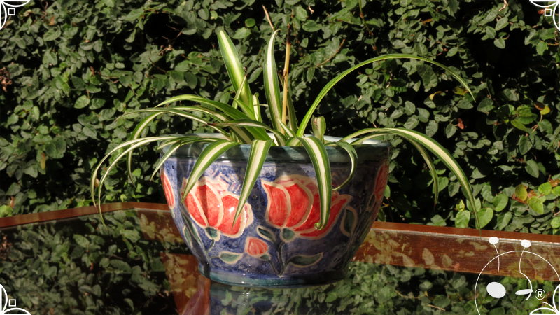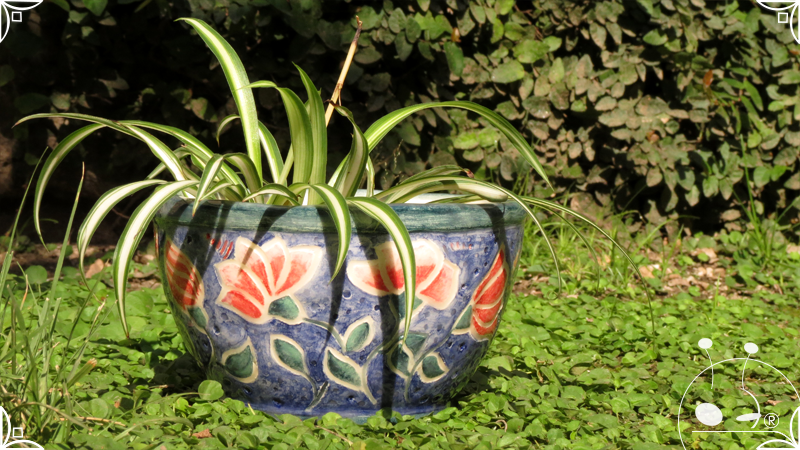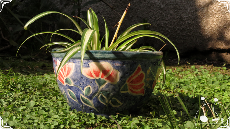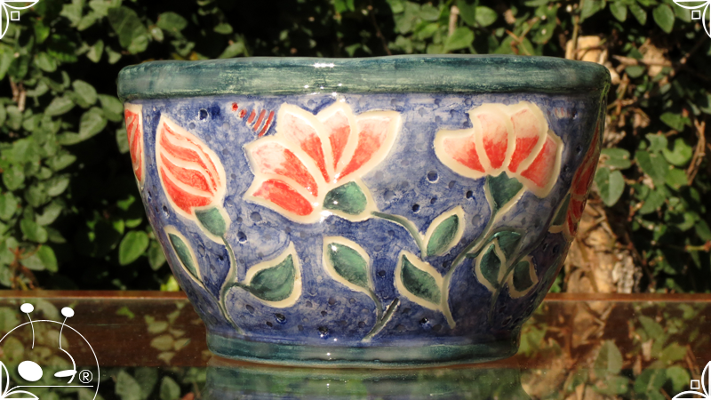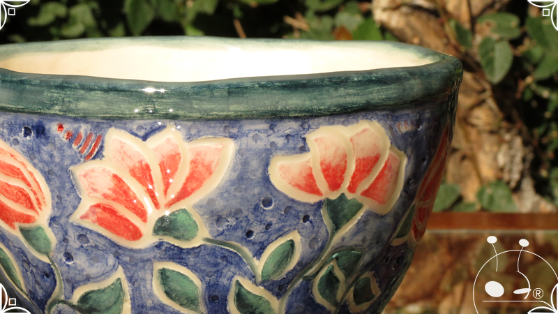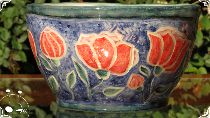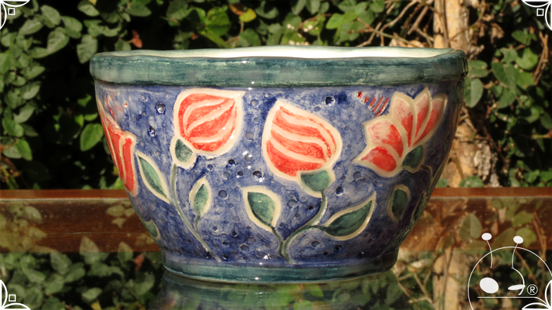 Maceta cónica pequeña realizada en cerámica artesanal, con una temática floral en una técnica de esgrafiado y con una plena paleta de colores.