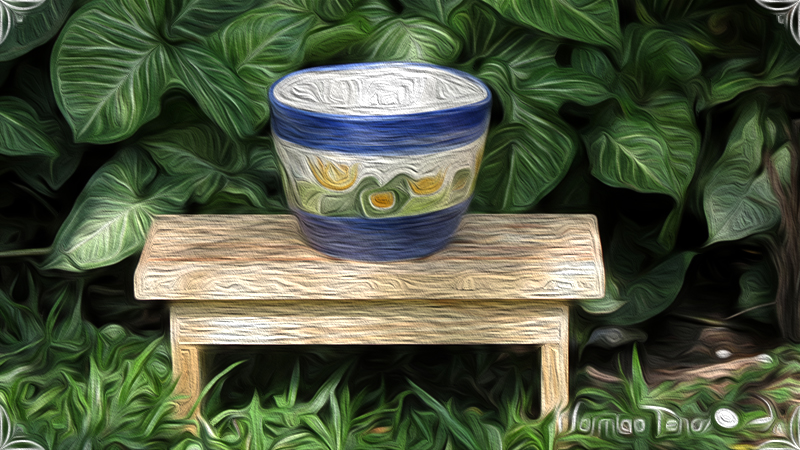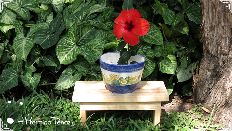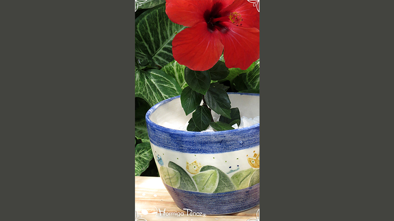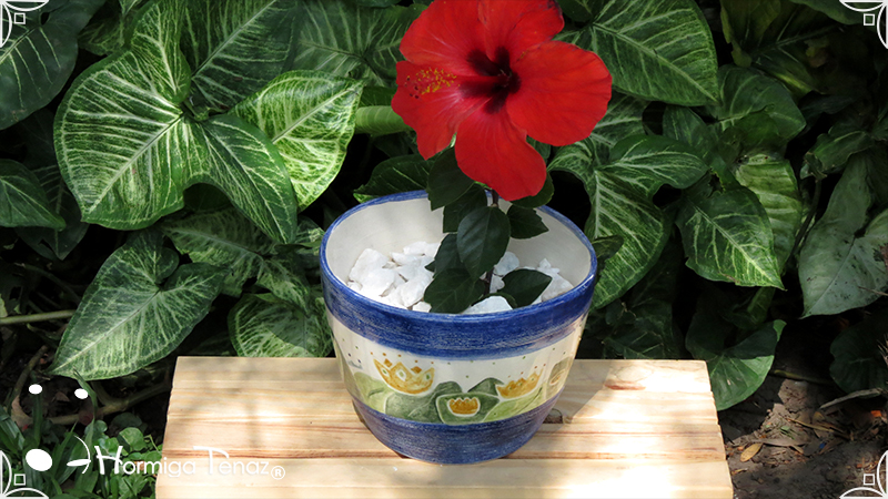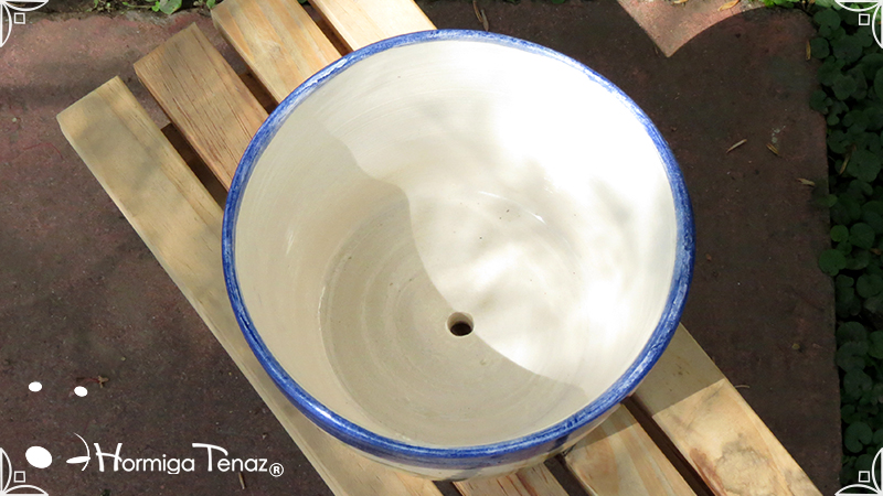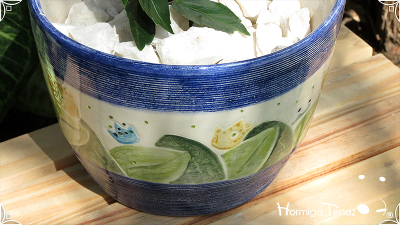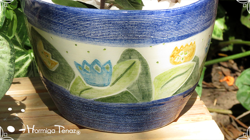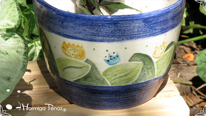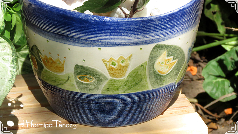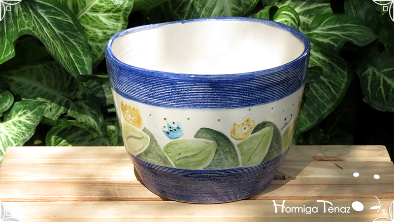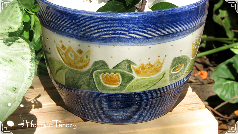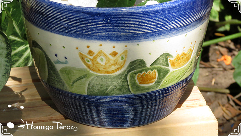 Maceta de cerámica con tenue bajo relieve de vegetales y coronas. Medidas: 16 cm de diámetro x 14 cm de altura.