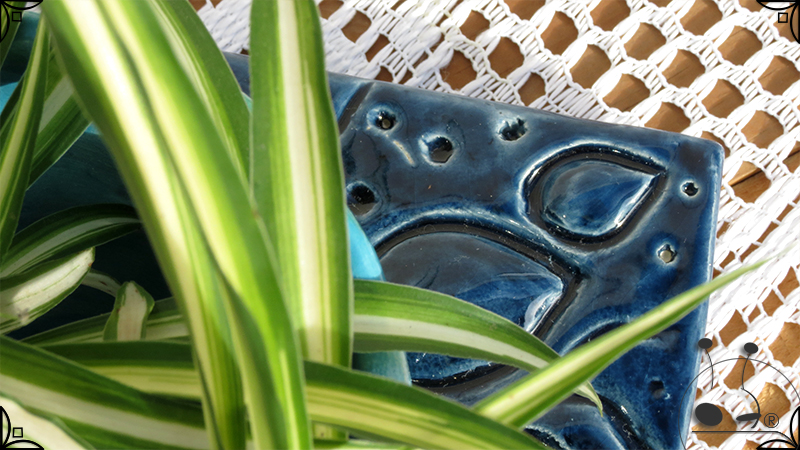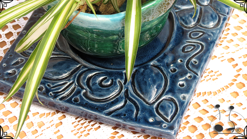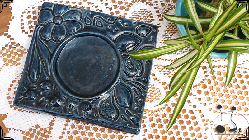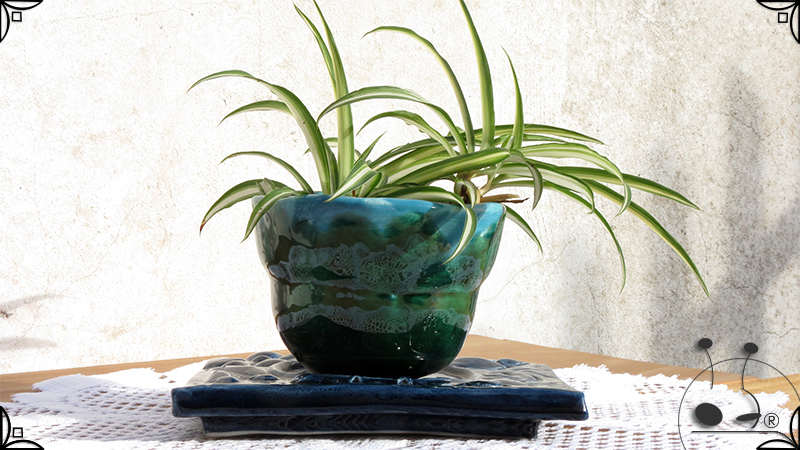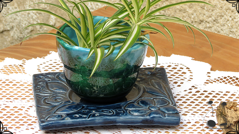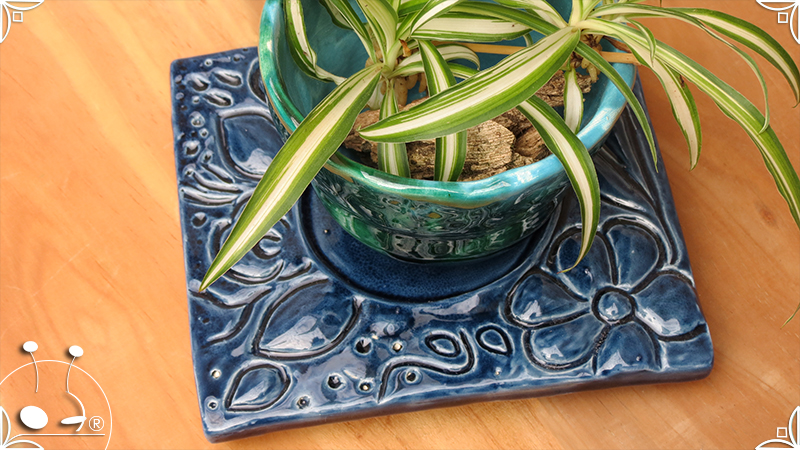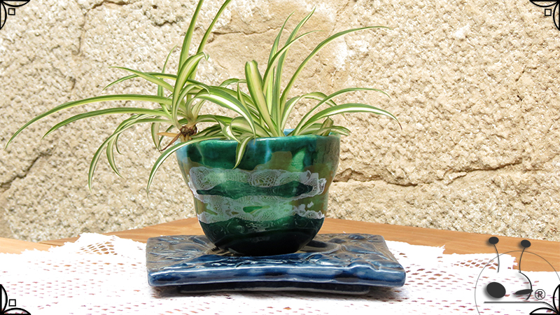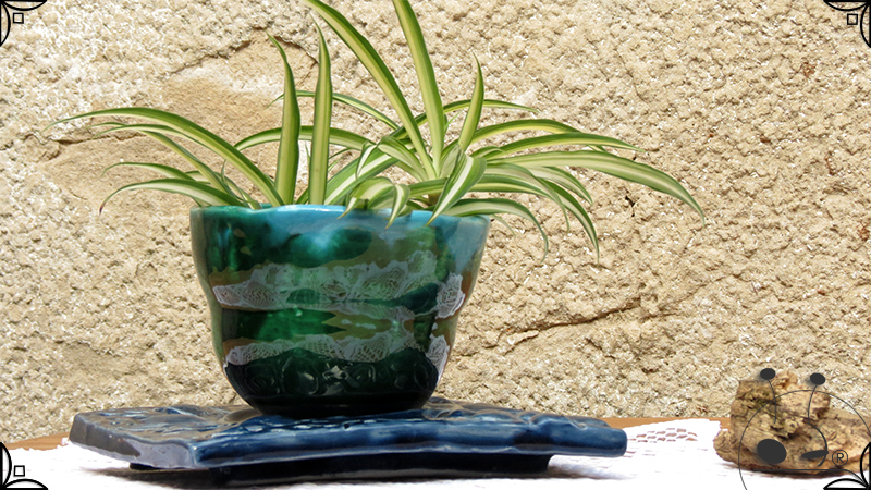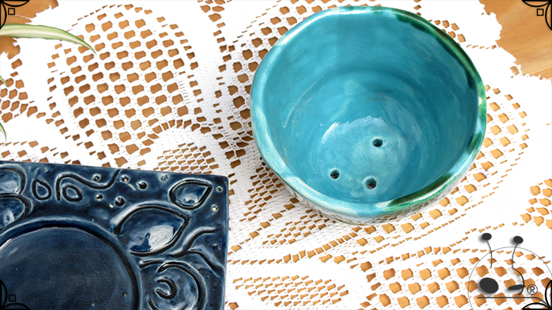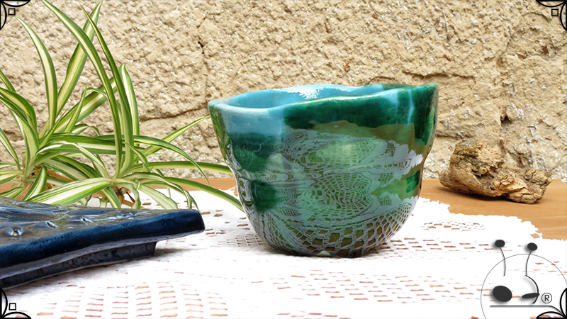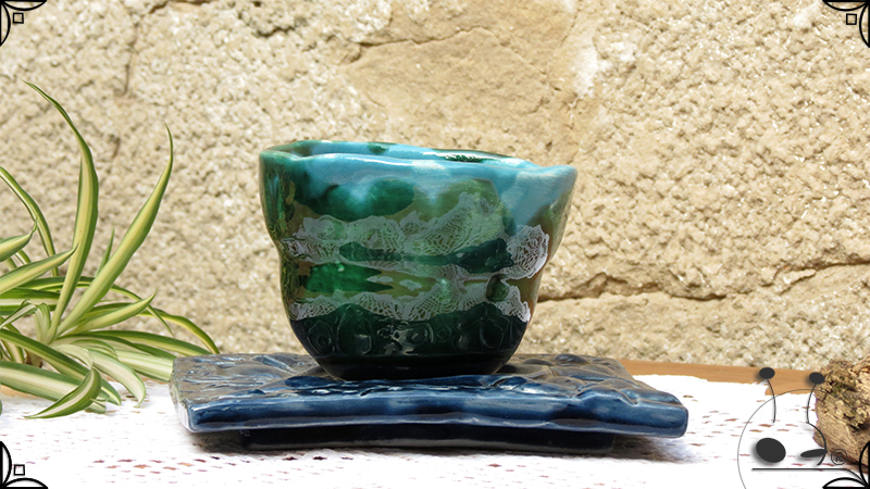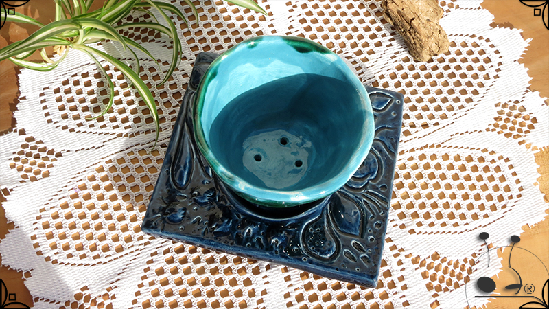 Maceta de dos piezas realizada en cerámica artesanal, por un lado el cuenco que cumple la función de maceta y por otro lado el plato para el drenaje. Ambas piezas fueron esmaltadas en color verde y azules, con el detalle de bajorrelieves vegetales en el plato.