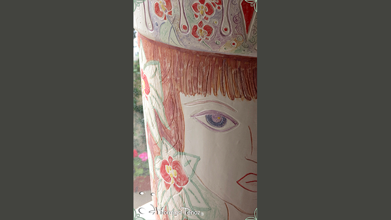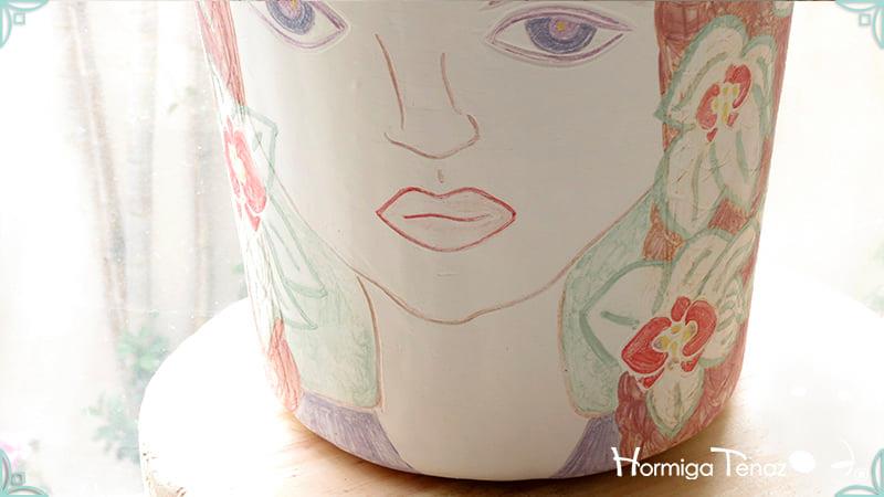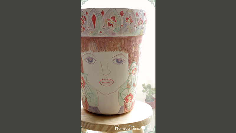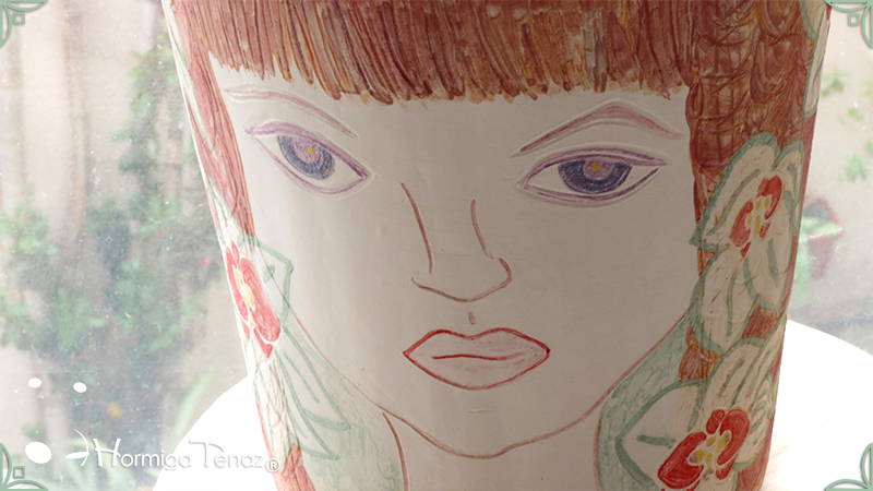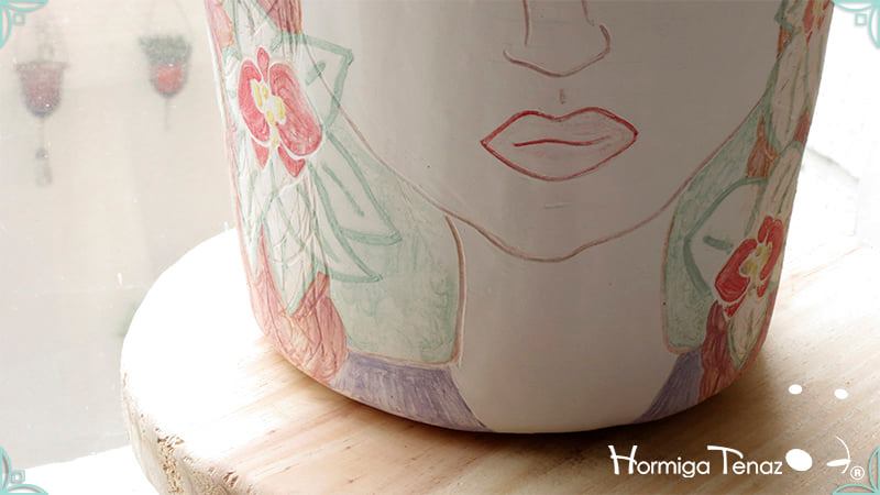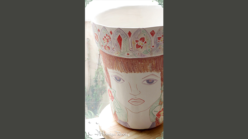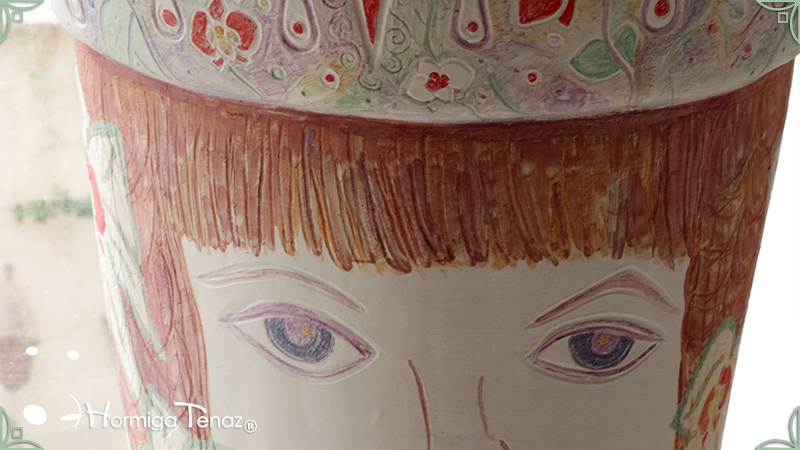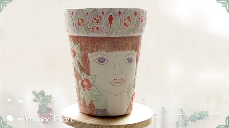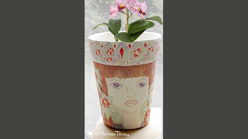 Maceta de cerámica artesanal realizada con un diseño que personifica a la orquídea Reina o Cattleya, plasmado en un retrato tridimensional.