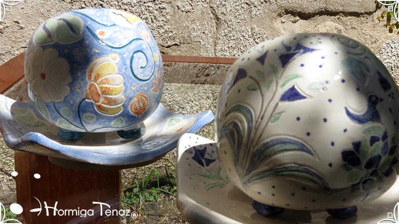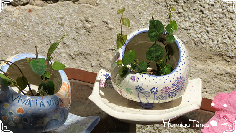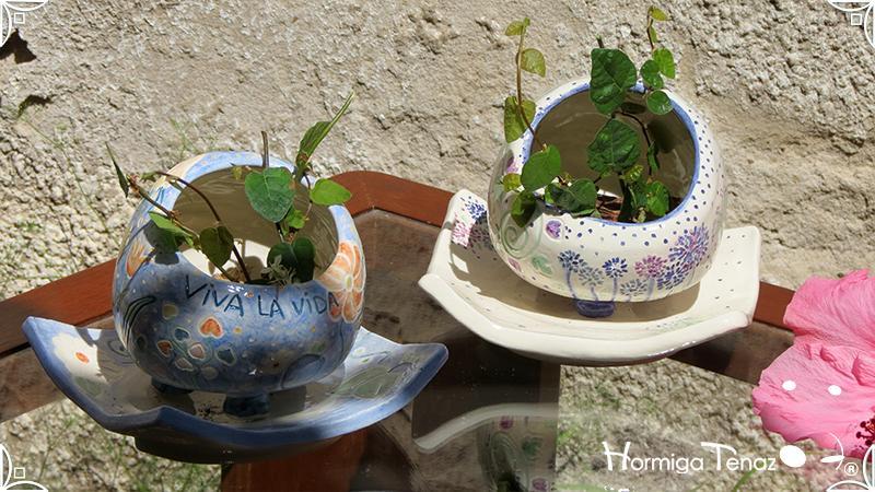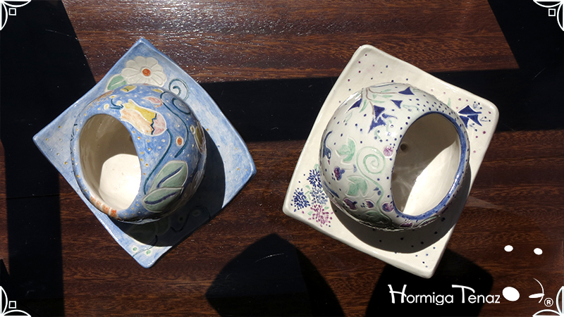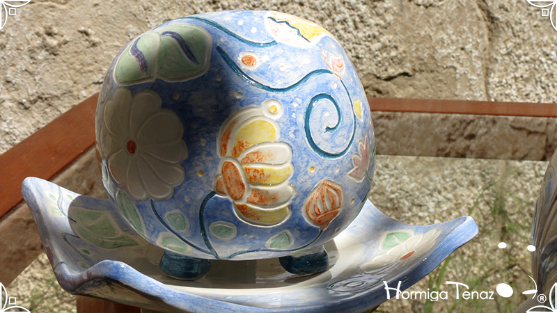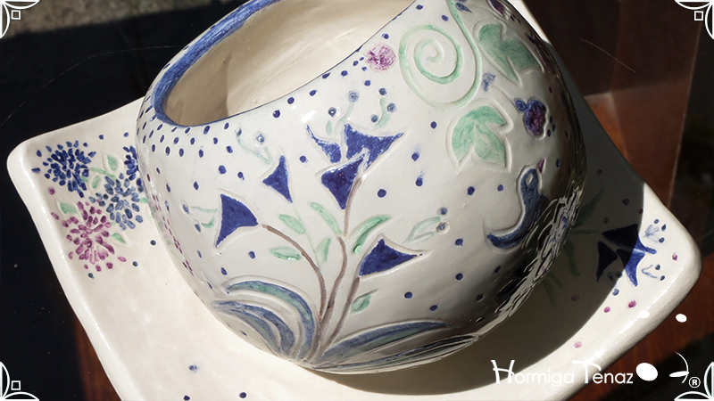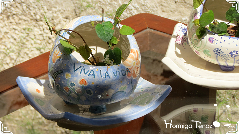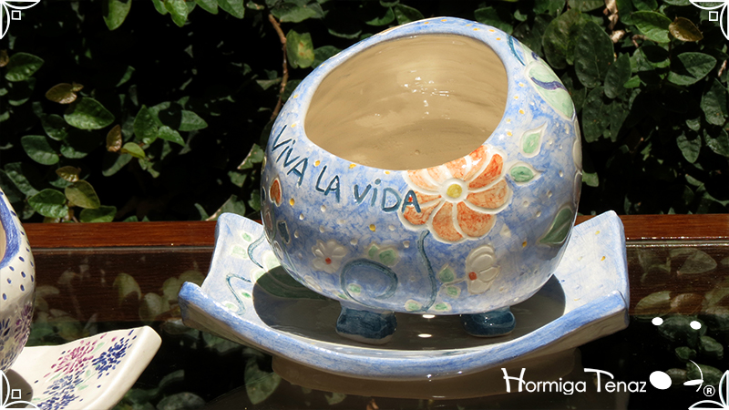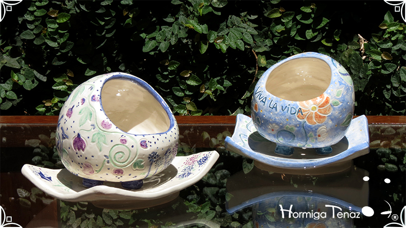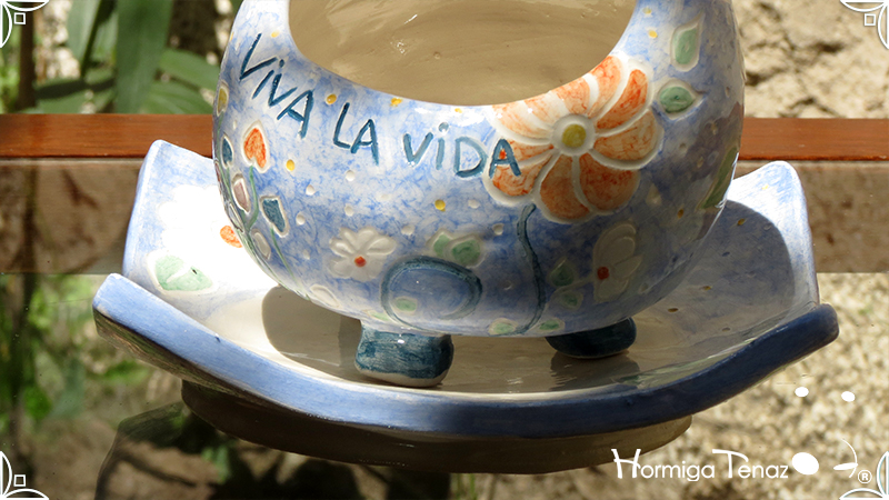 Juego de macetas realizadas en cerámica con forma de esferas y con plato curvo para el drenaje. Bajos relieves con motivos vegetales, fauna y texto. Realizadas en 2 colores, celeste y blanco. Ideal para crasas 𓆹٭⁎.