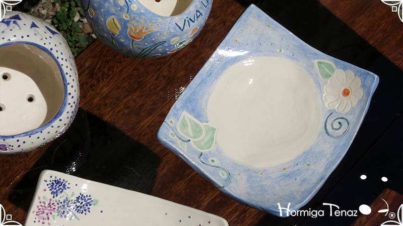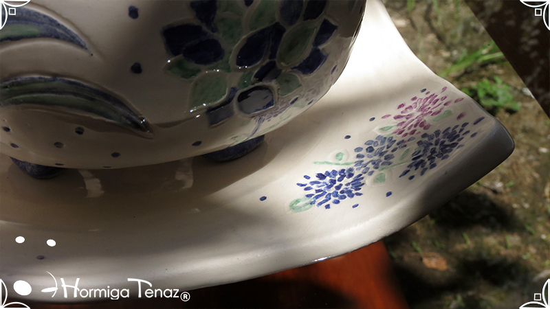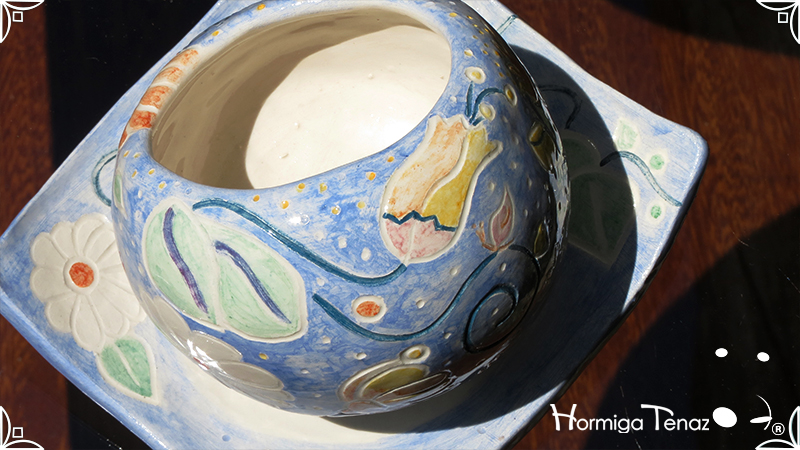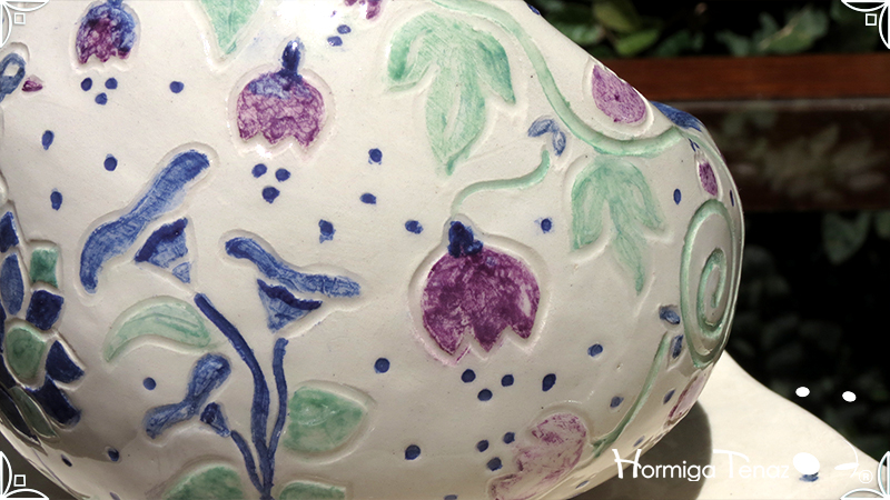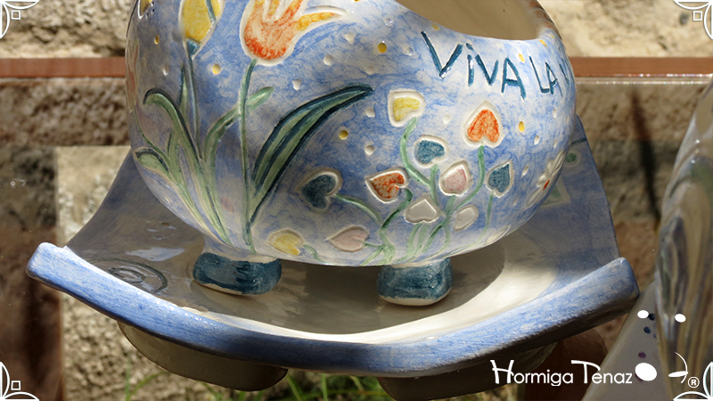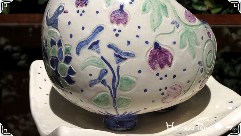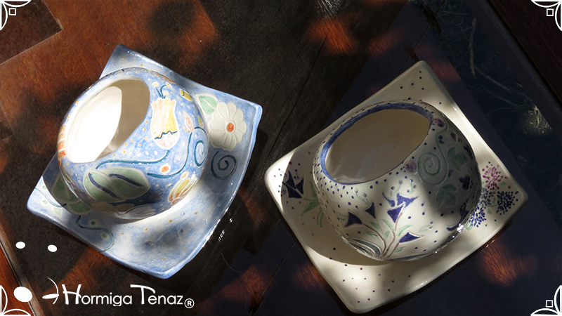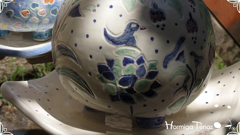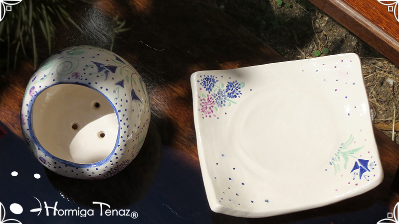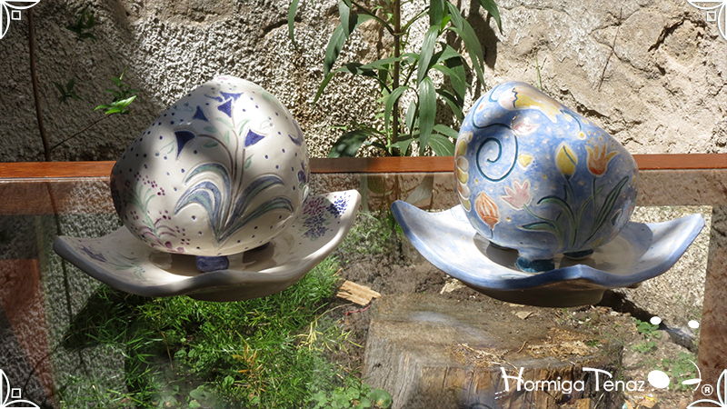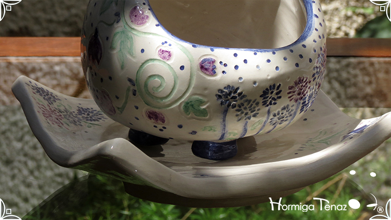 Juego de macetas realizadas en cerámica con forma de esferas y con plato curvo para el drenaje. Bajos relieves con motivos vegetales, fauna y texto. Realizadas en 2 colores, celeste y blanco. Ideal para crasas 𓆹٭⁎.