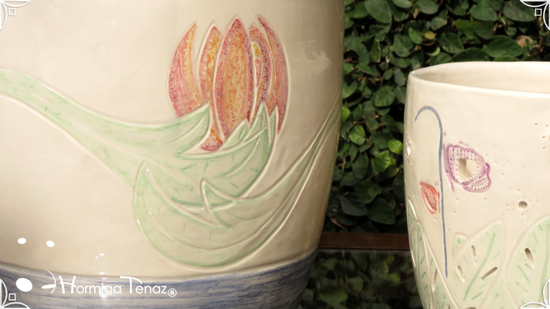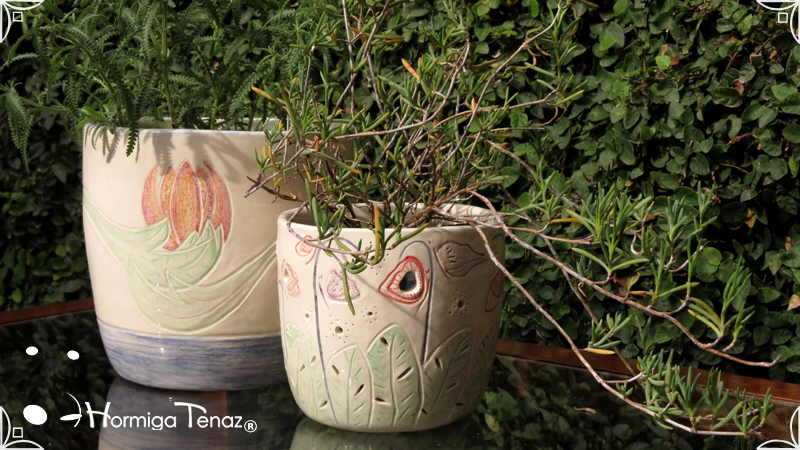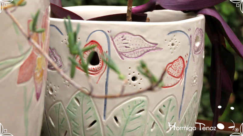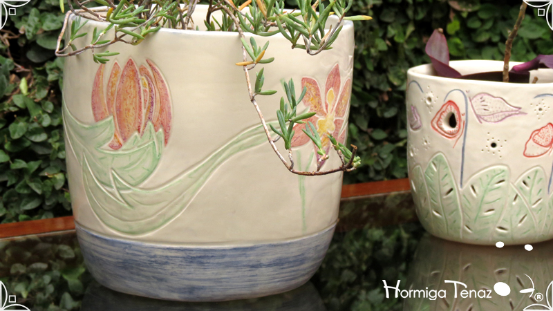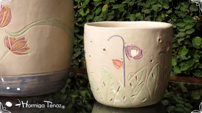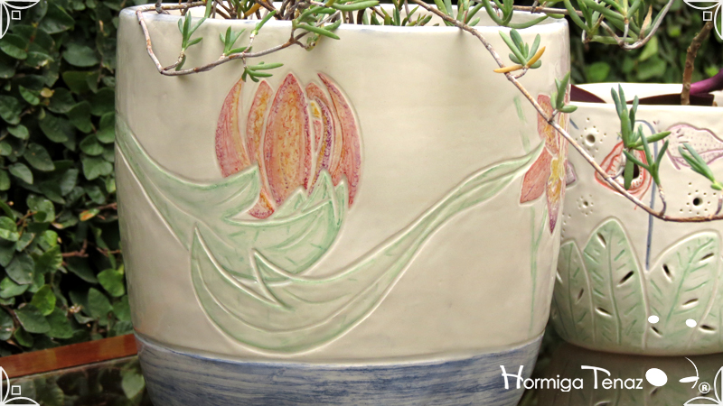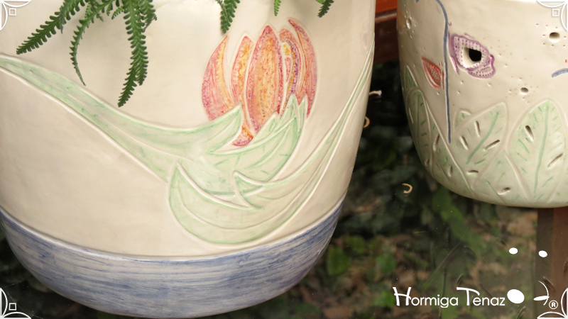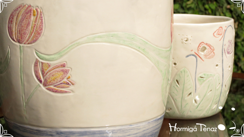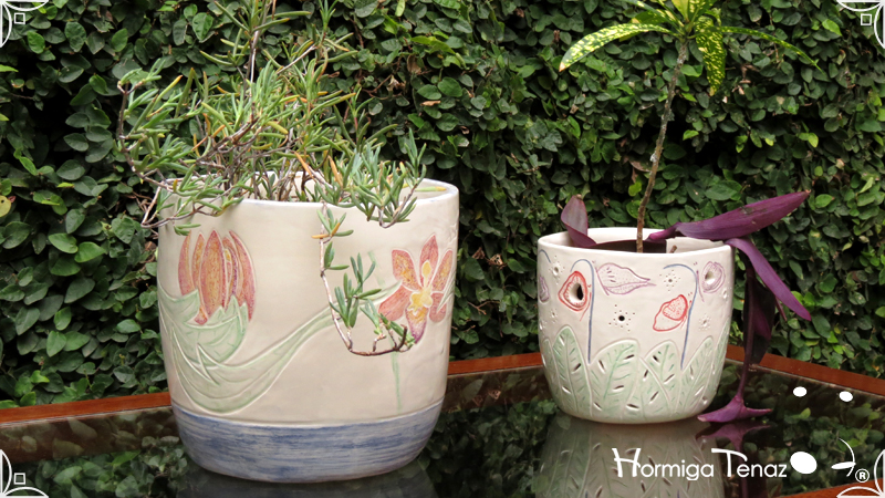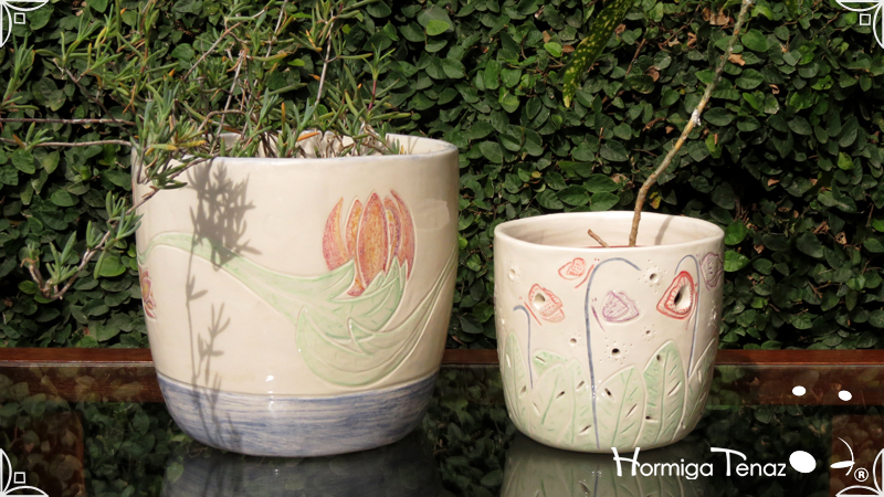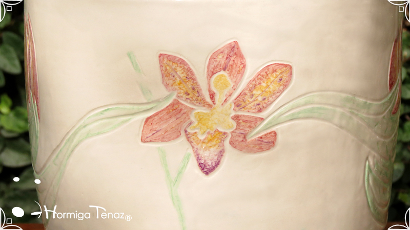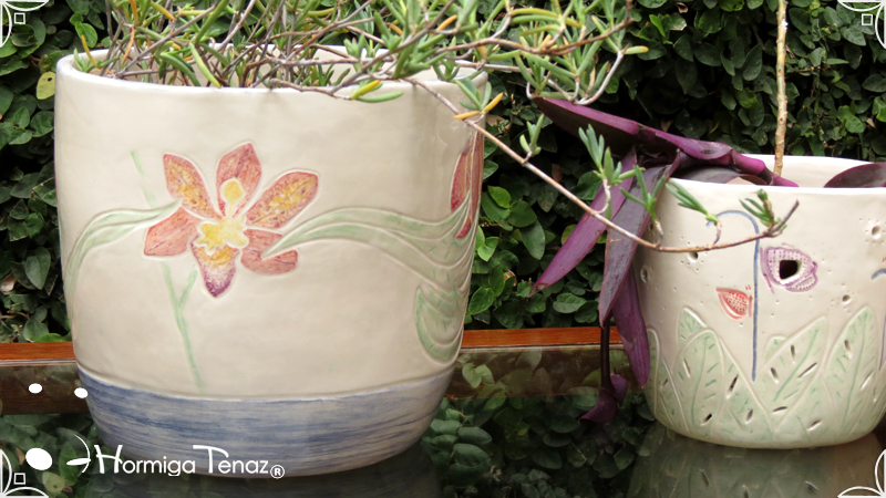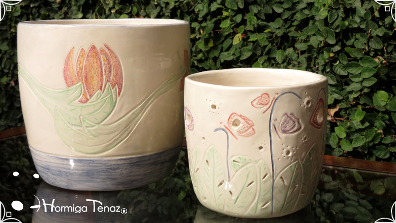 Dos macetas diseñadas en cerámica artesanal realizadas cumpliendo dos temáticas, una basada en la orquídea Madre y la otra en la orquídea Mariposa, con bajos relieves y calados.