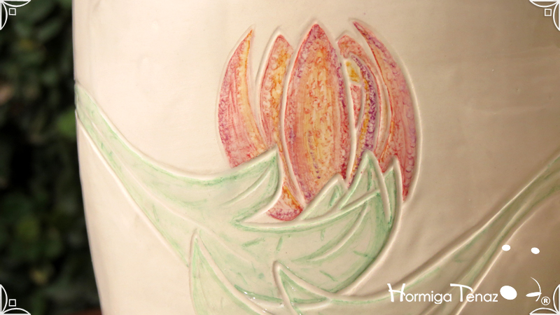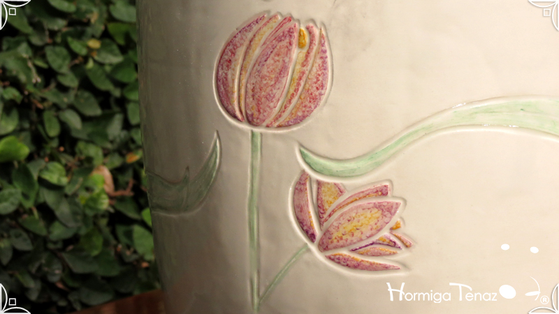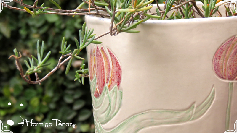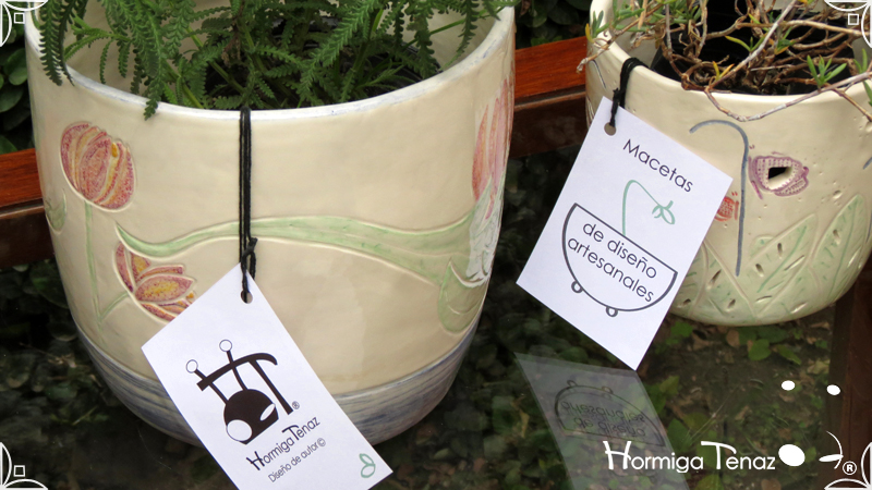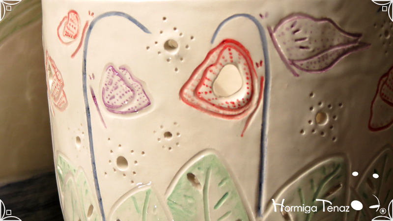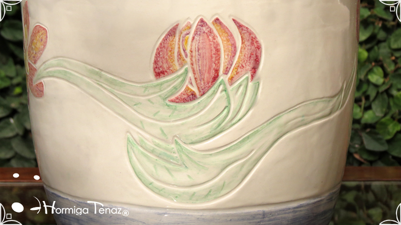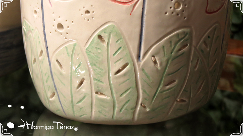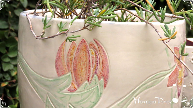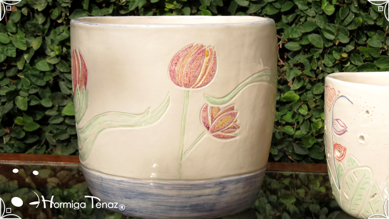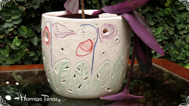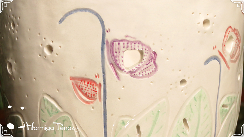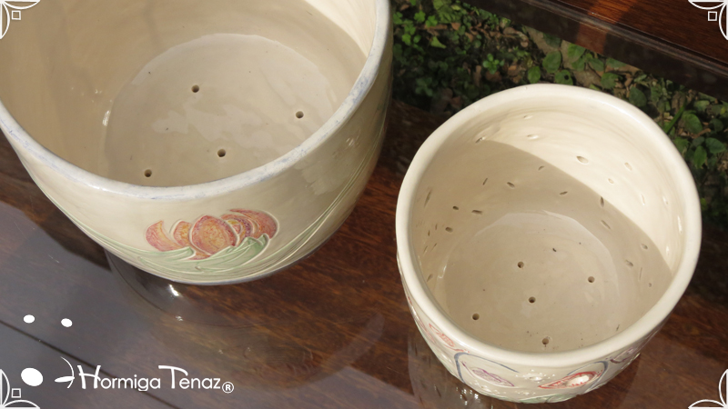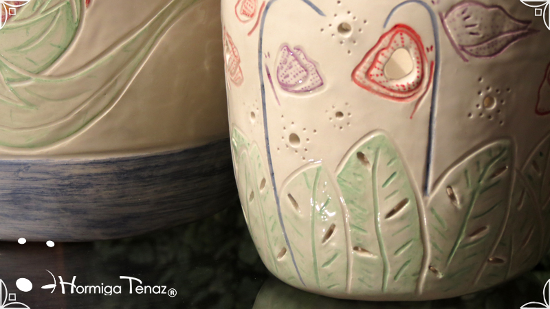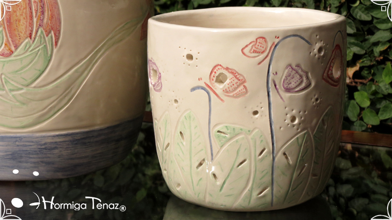 Dos macetas diseñadas en cerámica artesanal realizadas cumpliendo dos temáticas, una basada en la orquídea Madre y la otra en la orquídea Mariposa, con bajos relieves y calados.