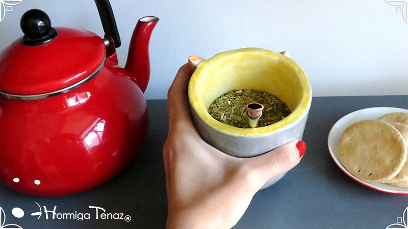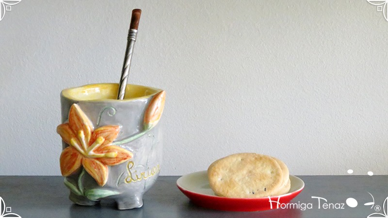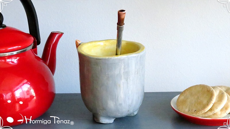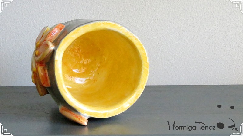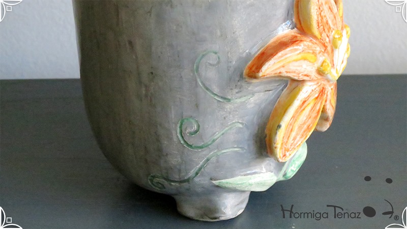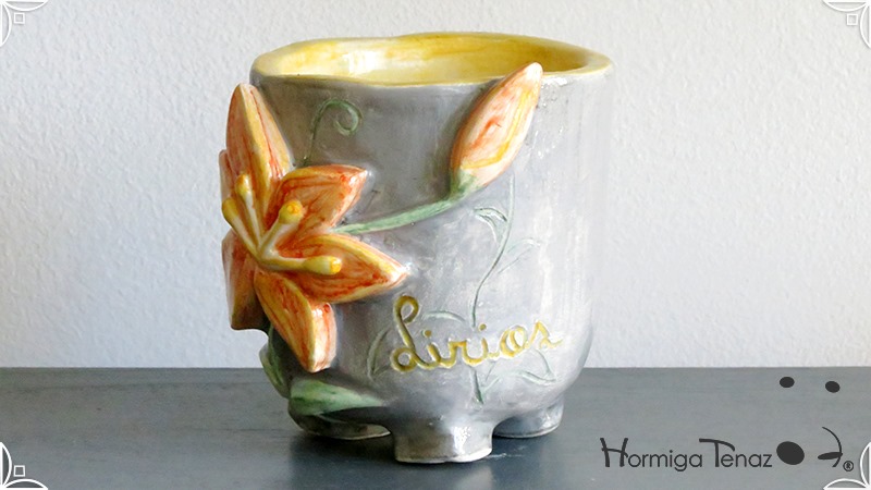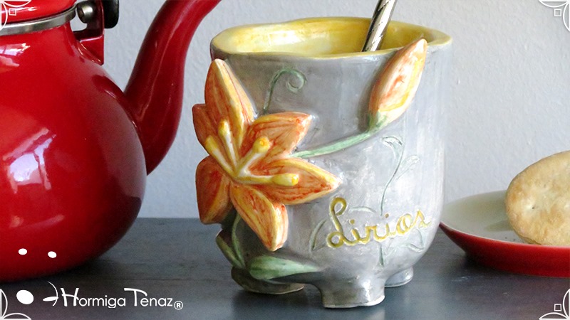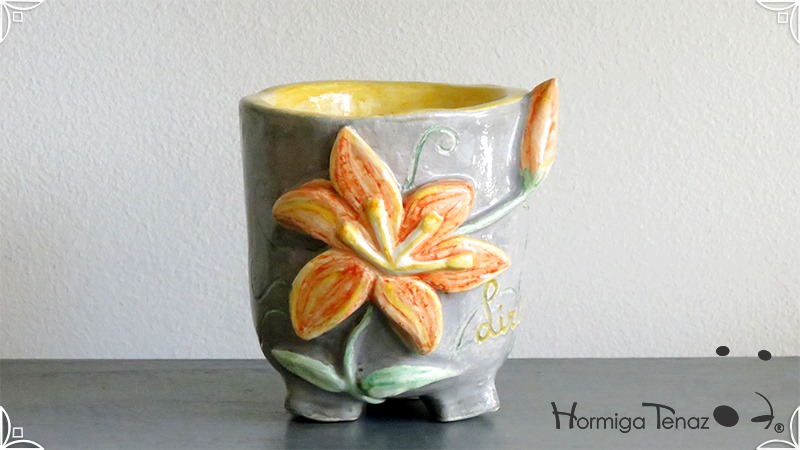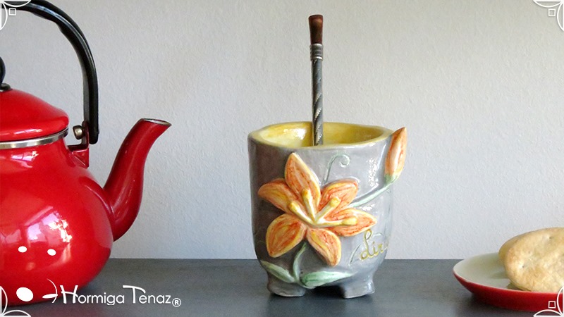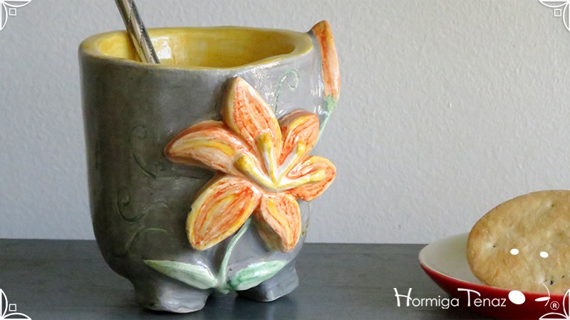 Mate pequeño realizado en cerámica artesanal, con la temática de la flor de Lirio en bajorrelieve.