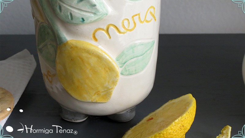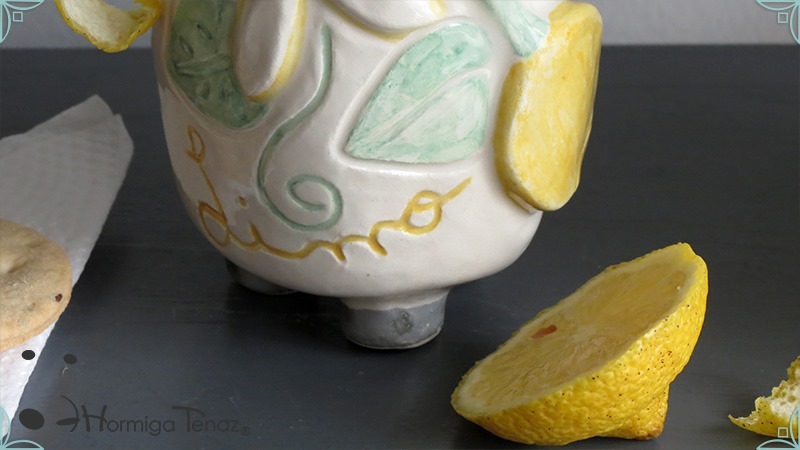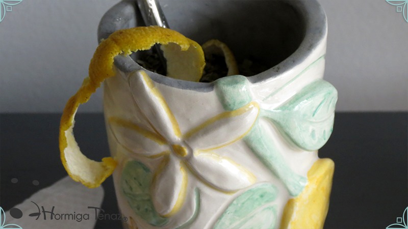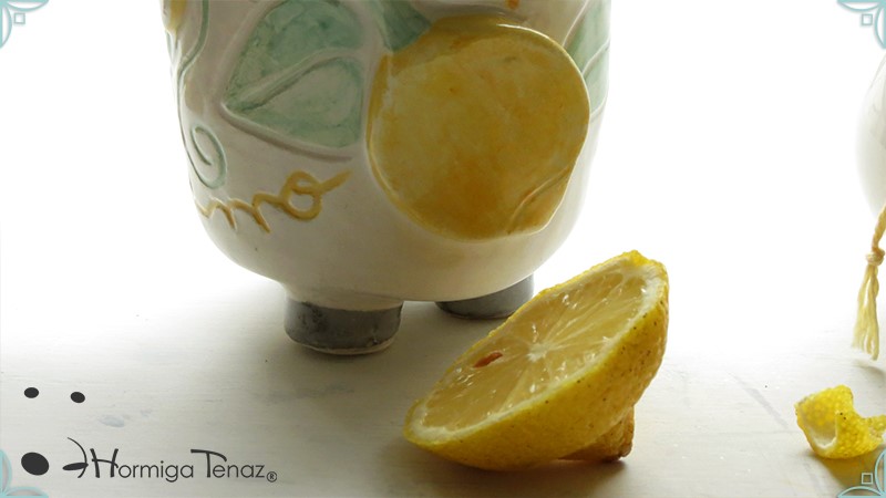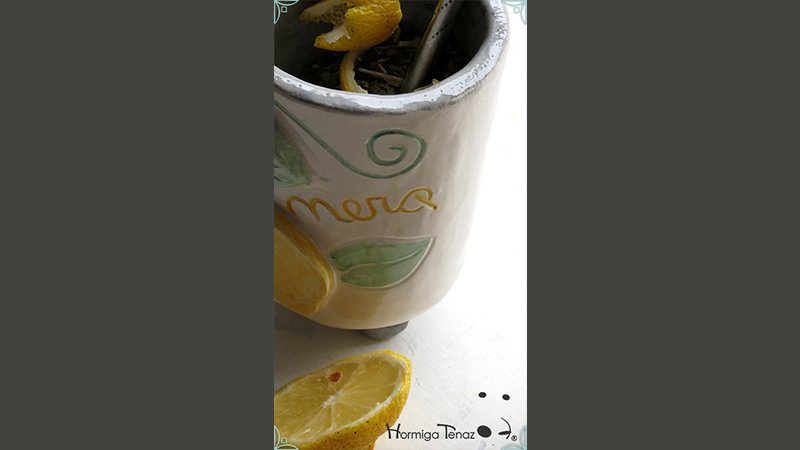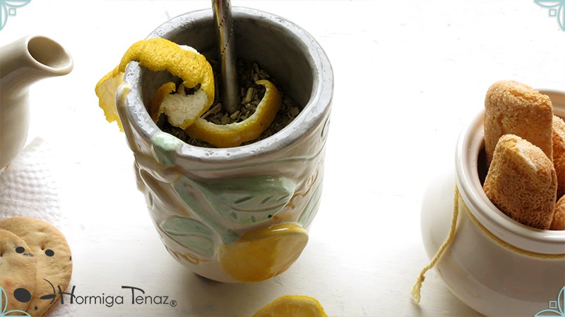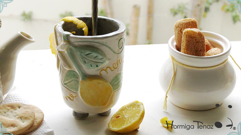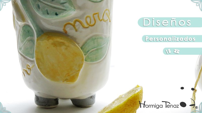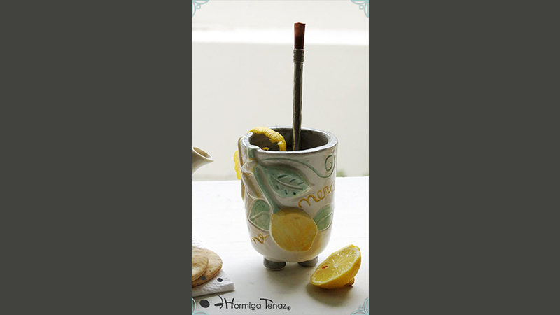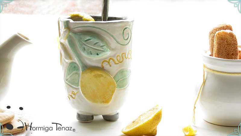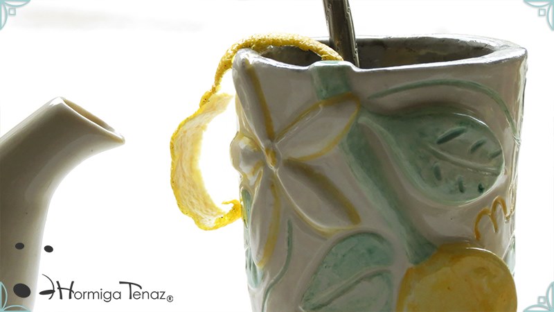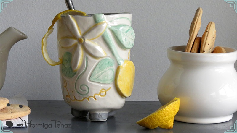 Mate pequeño realizado en cerámica artesanal con un diseño en bajorrelieve, el cual refleja la temática del limonero listo para cosechar y en flor.