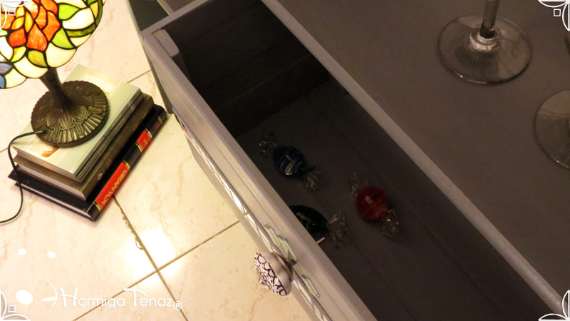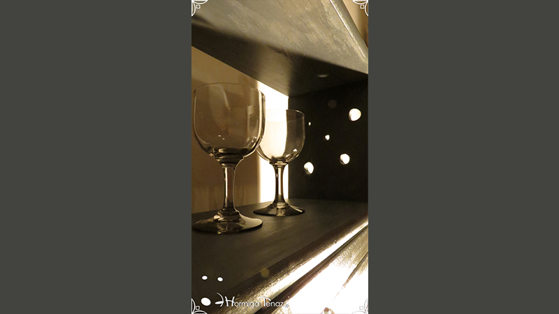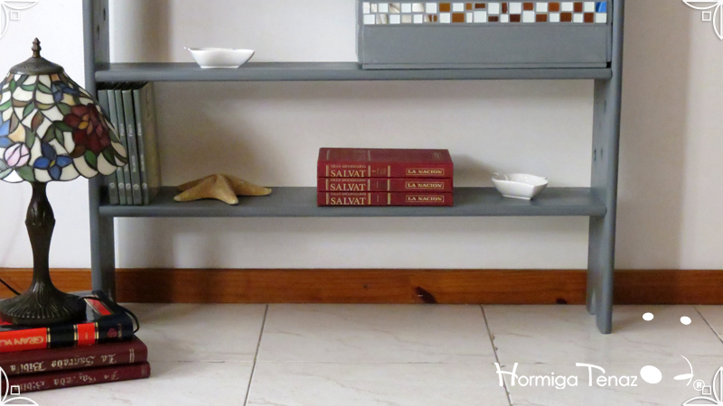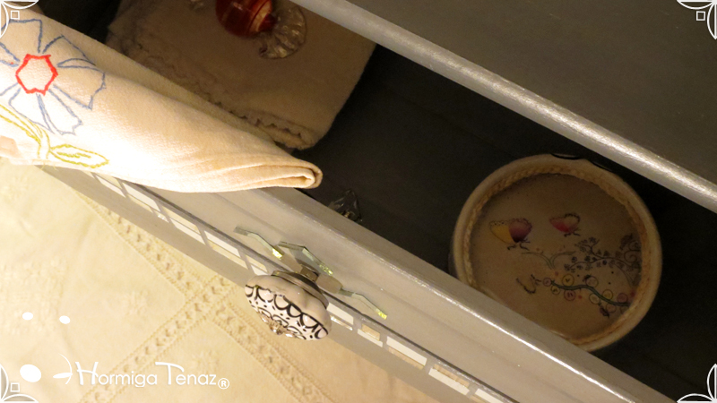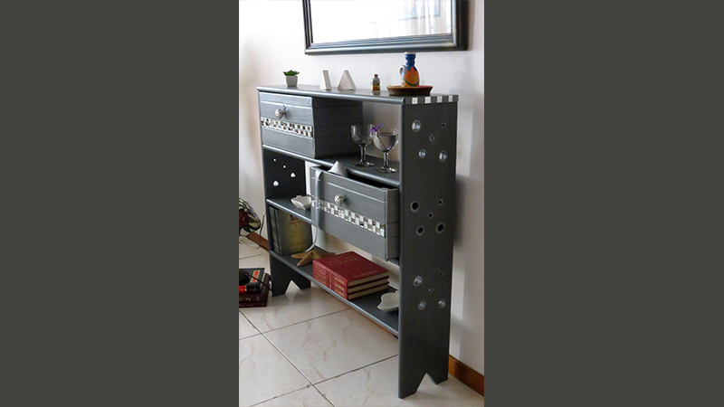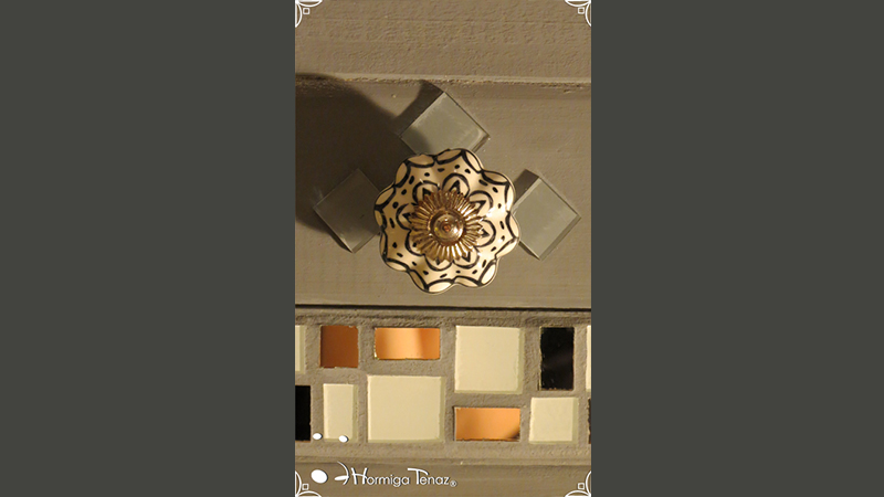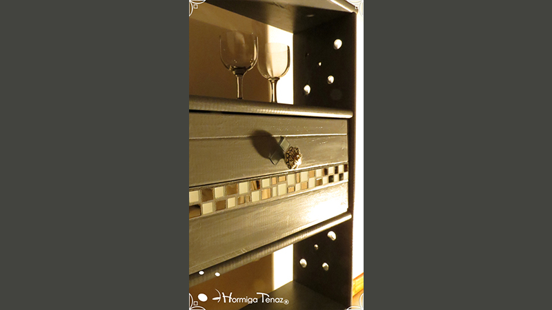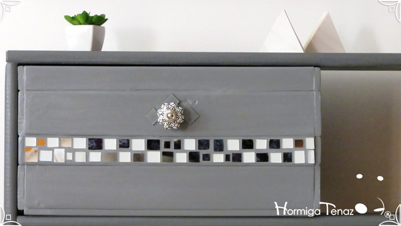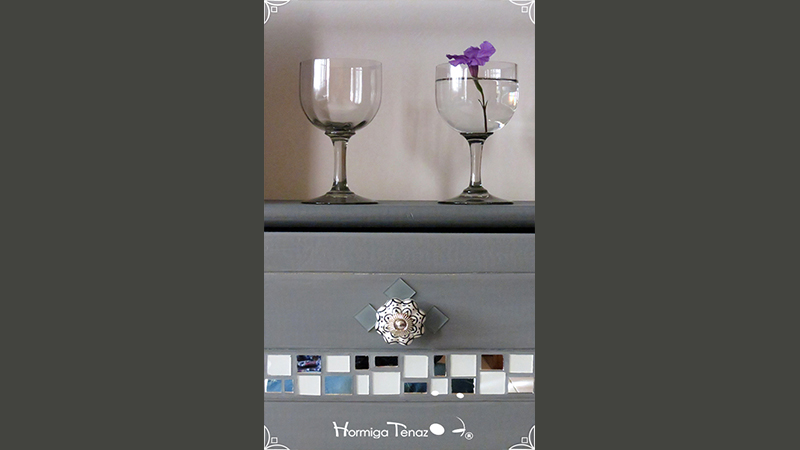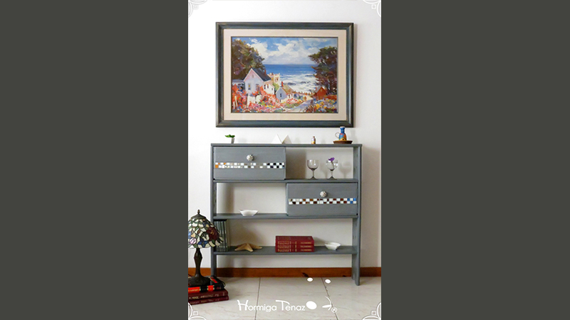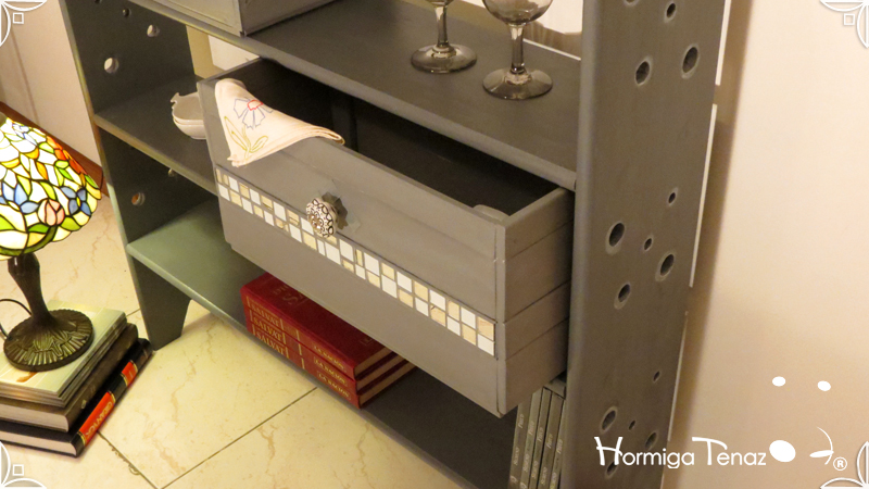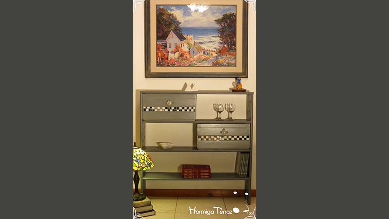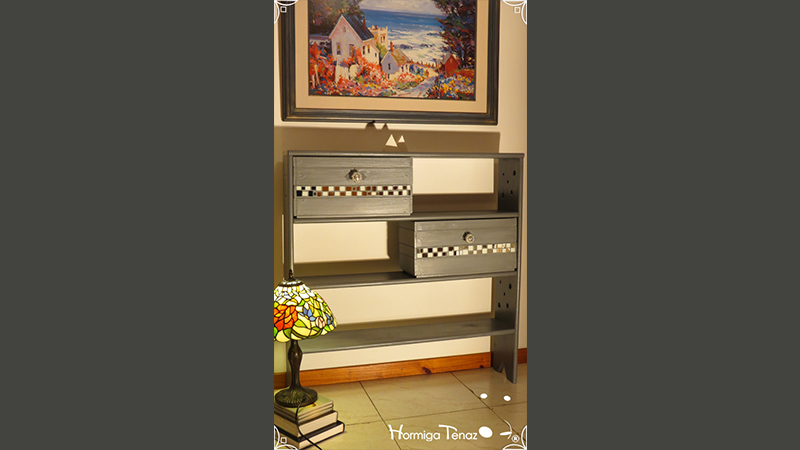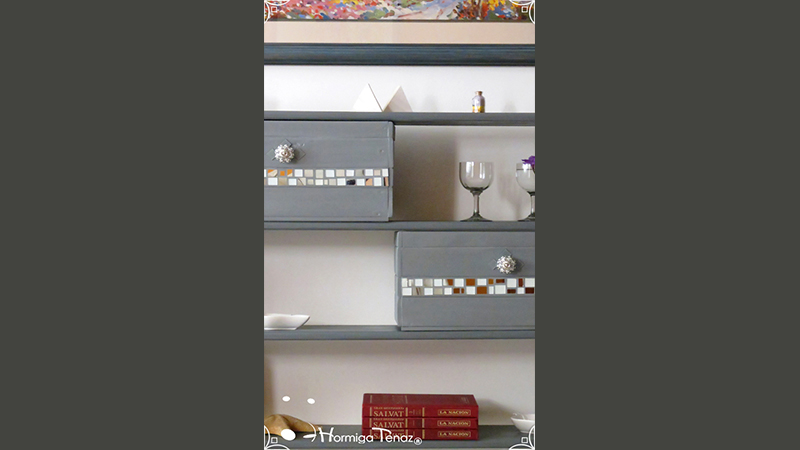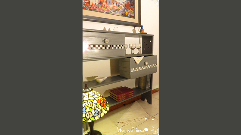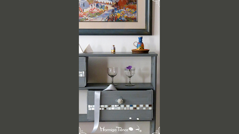 Mueble estilo rústico moderno con estantería y 2 cajones móviles en color gris. Tiradores en porcelana, detalles con mosaicos, y calado sobre el mueble resaltado con pintura plateada. Mueble presentado en las fotos junto con los Posavasos & Posafuente Primavera.