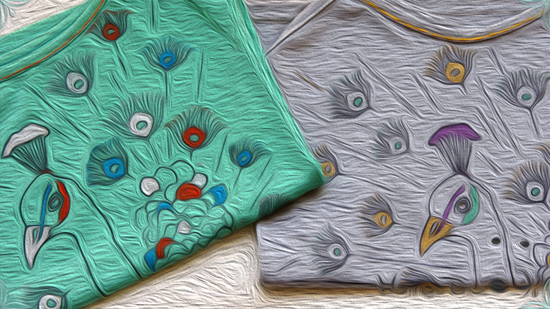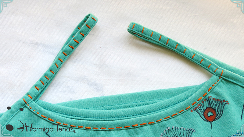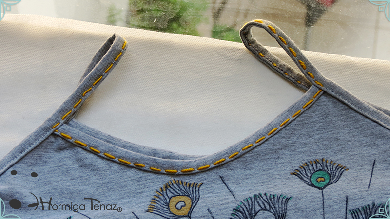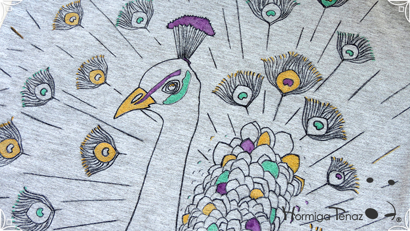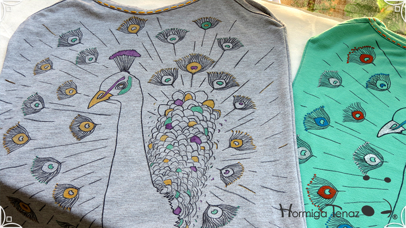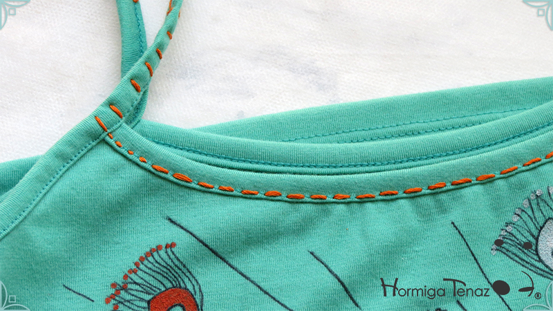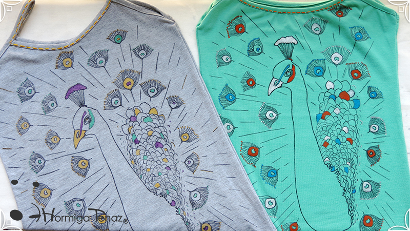 Musculosas de algodón pintadas a mano con los diseños de Aves Exóticas, aplicados en colores vivos, dorados y plateados. Más el detalle de guardas bordadas en el escote y breteles.
