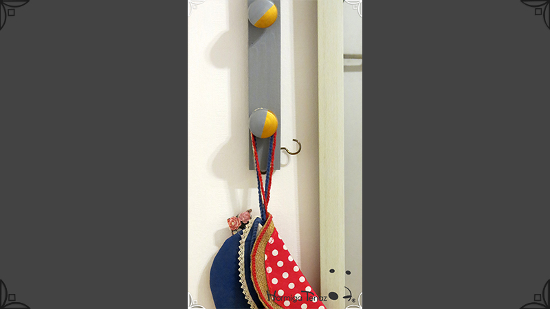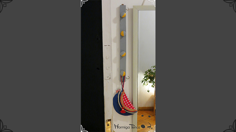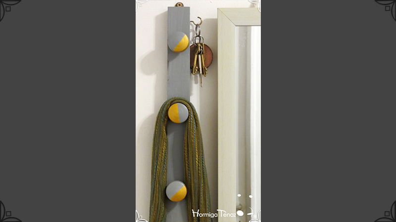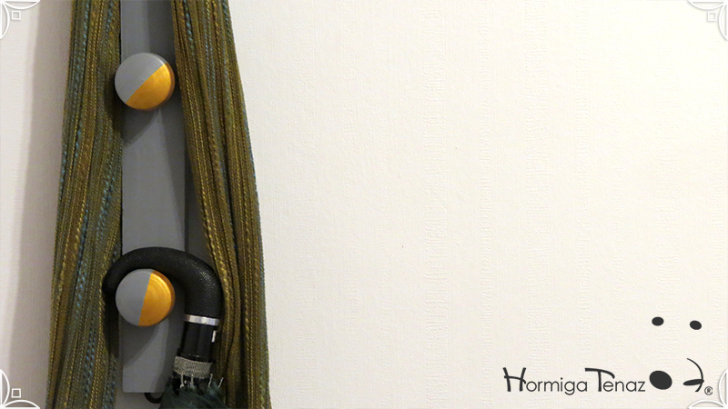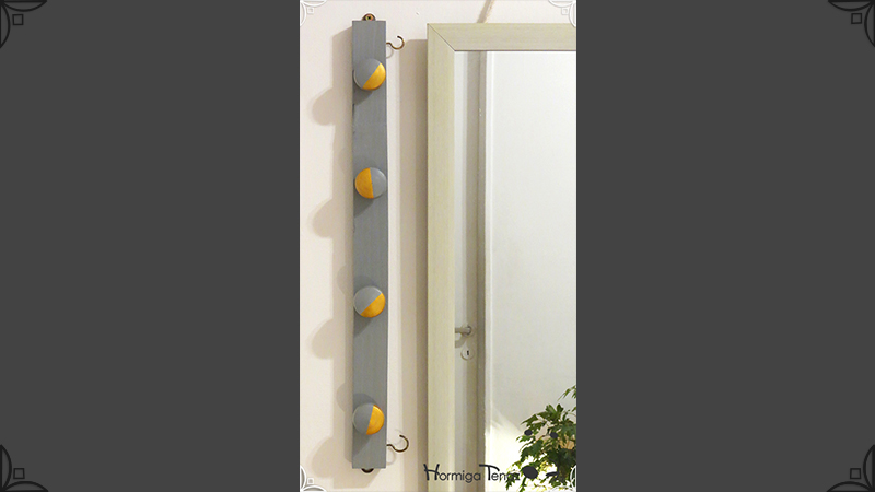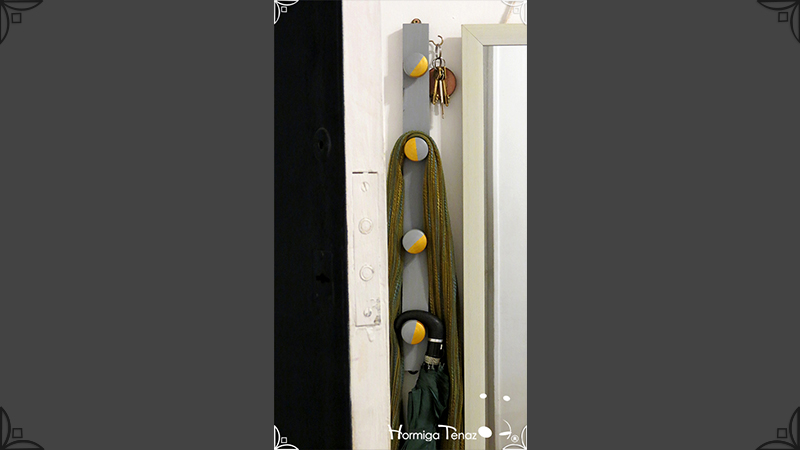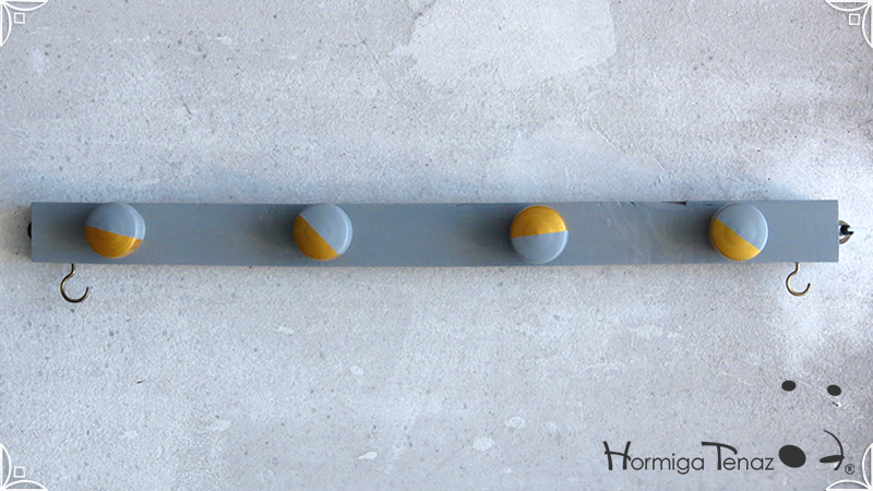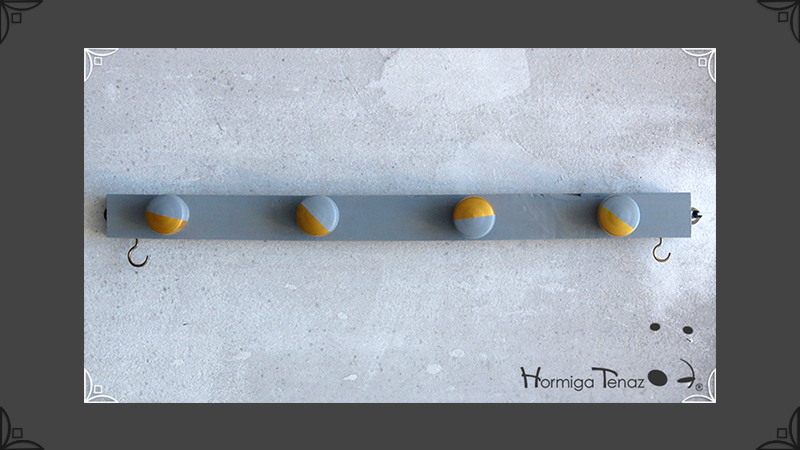 Perchero de madera Low Cost en color gris y dorado, con 6 ganchos para colgar abrigos, bolsos y llaves. De diseño liviano y delgado, ideal para espacios reducidos o para usar detrás de la puerta como un práctico recibidor de entrada. Su uso es posible tanto en vertical como en horizontal, viene con los ganchos al dorso, listo para colgar.