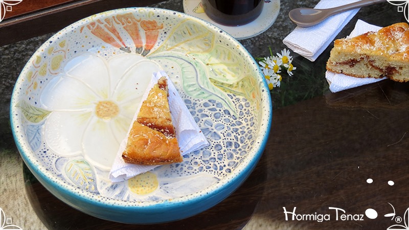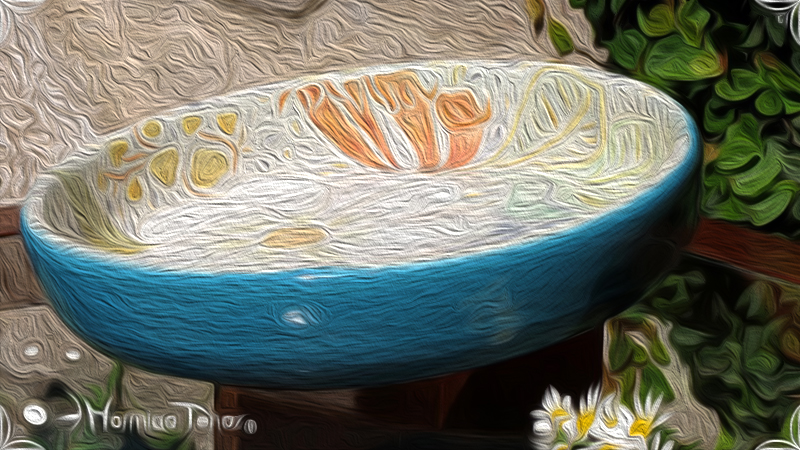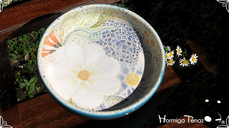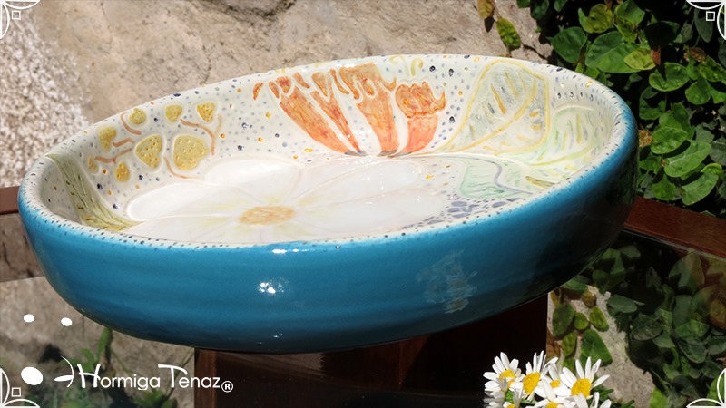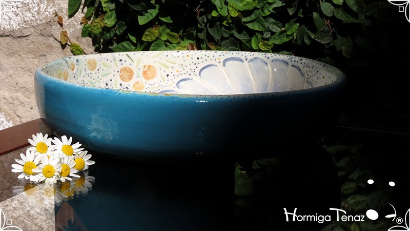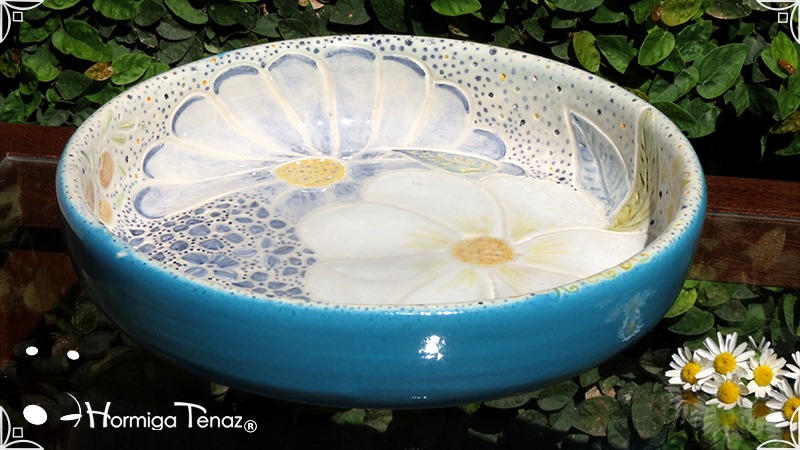 Plato de cerámica con un interior floral realizado en un suave bajo relieve, y de entre toda la variedad de flores asoma una gran margarita, mientras que por fuera un hermoso turquesa cubre el plato. Vasija ideal para centro de mesa o para presentar comida.