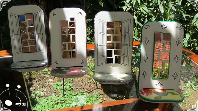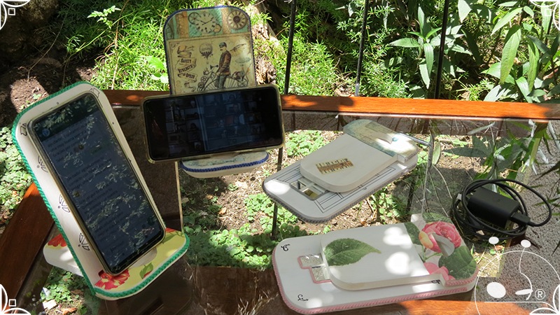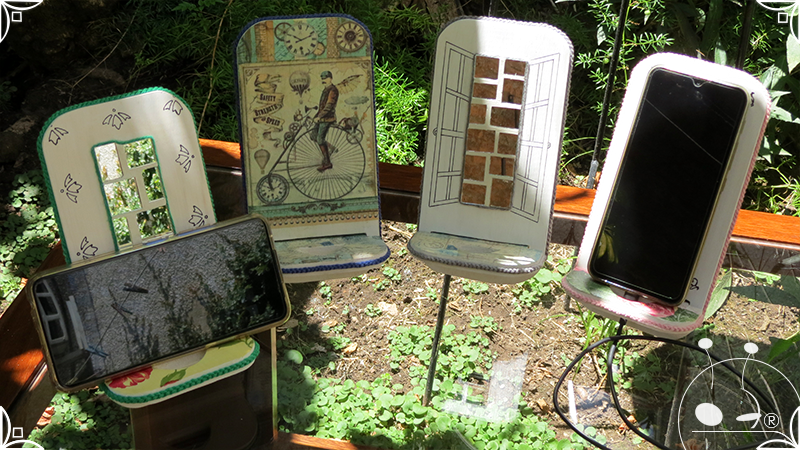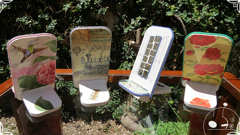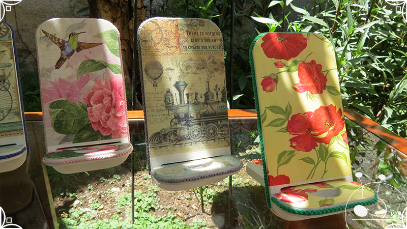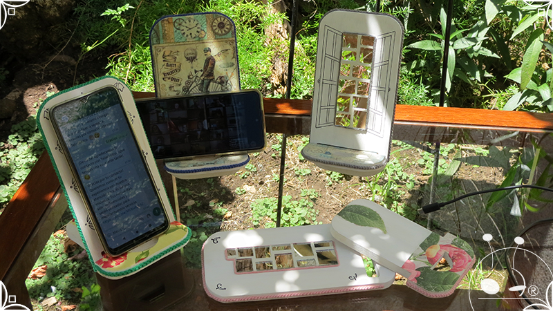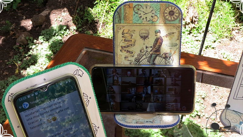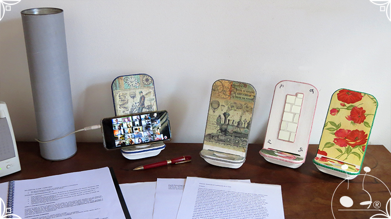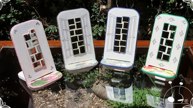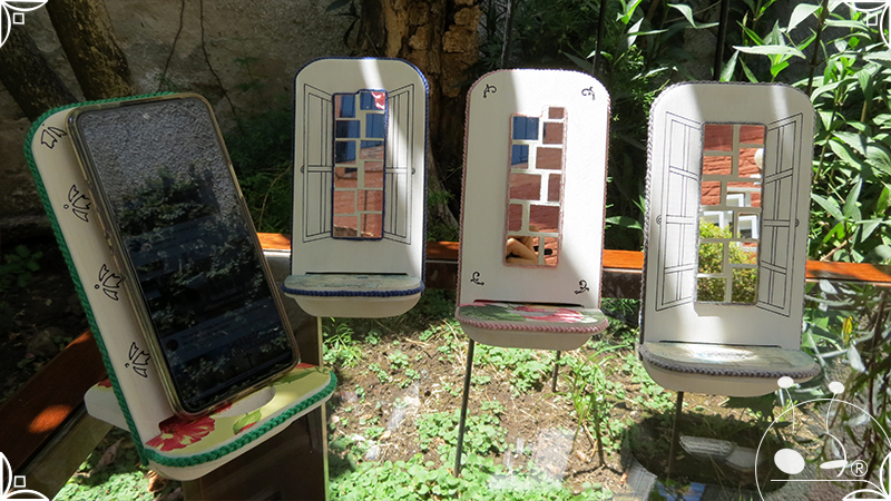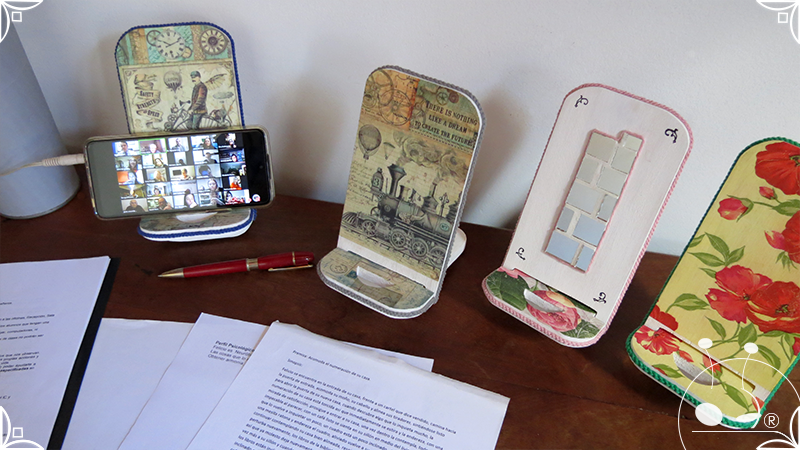 En una cara del porta celular se realizó un espejo mosaico integrado a un diseño de interiorismo emulando un aparador y a un diseño arquitectónico abriendo una ventana, de esta manera se ha aportado luz al accesorio y practicidad al contar con un espejo a mano antes de una reunión online. En la otra cara se intervino con un diseño de decoupage en motivos florales femeninos y vintage masculinos, complementados con cordones de hilo tejido en diferentes colores.