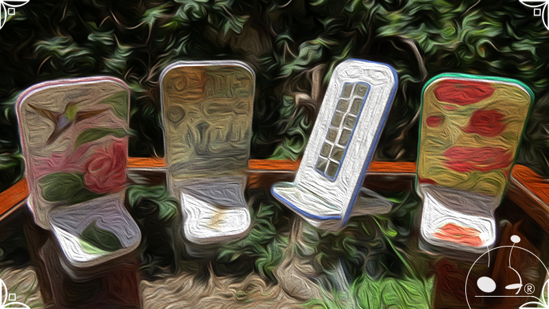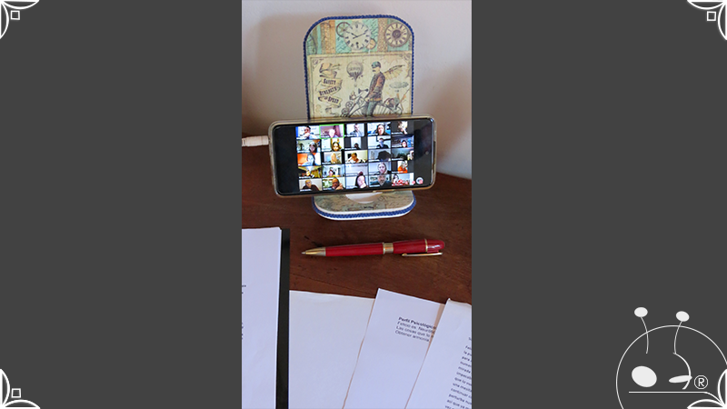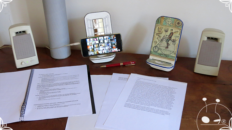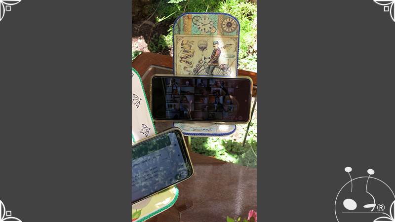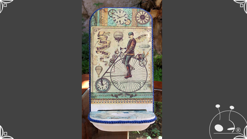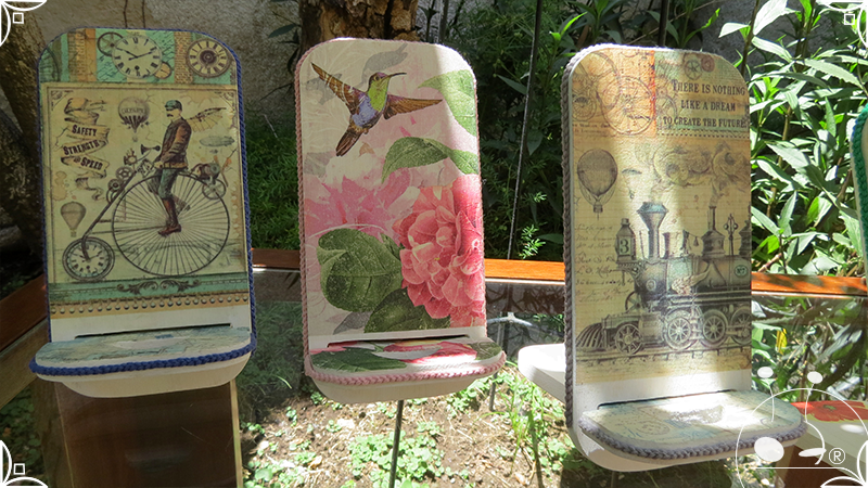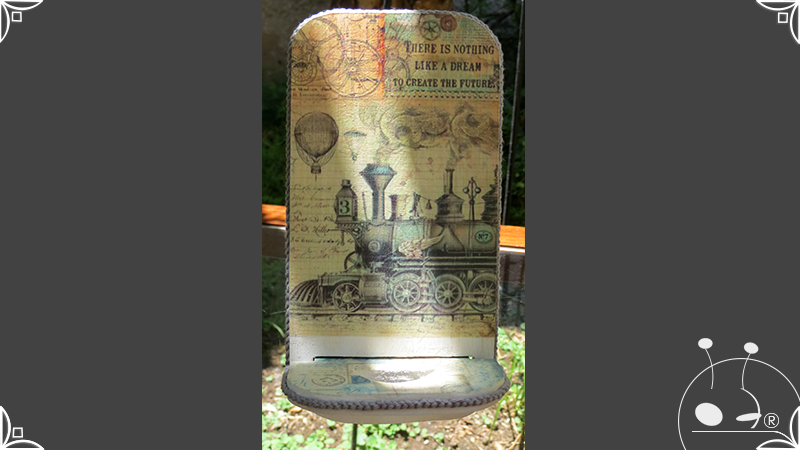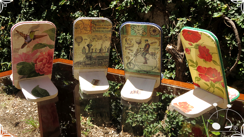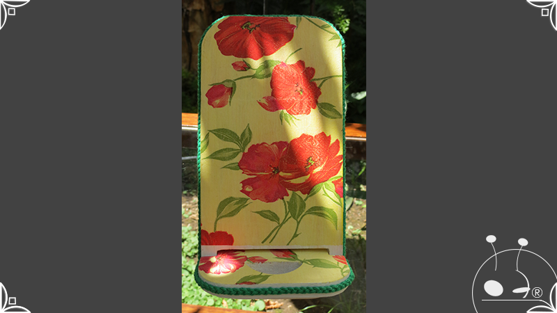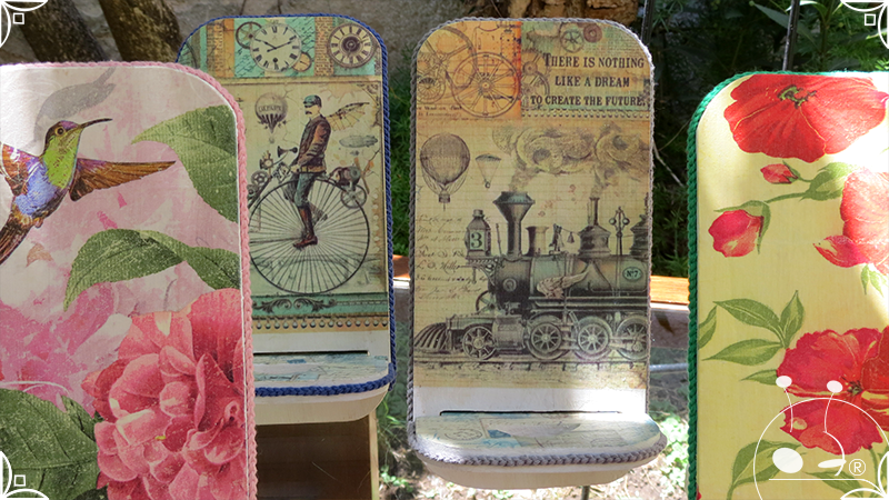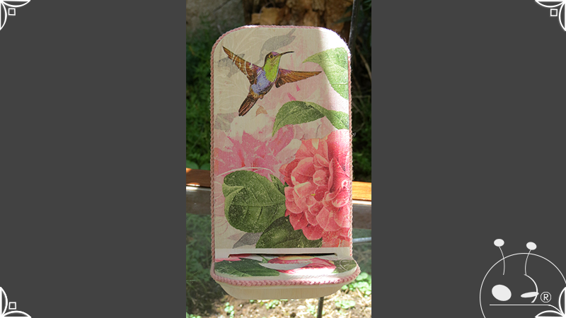 En una cara del porta celular se realizó un espejo mosaico integrado a un diseño de interiorismo emulando un aparador y a un diseño arquitectónico abriendo una ventana, de esta manera se ha aportado luz al accesorio y practicidad al contar con un espejo a mano antes de una reunión online. En la otra cara se intervino con un diseño de decoupage en motivos florales femeninos y vintage masculinos, complementados con cordones de hilo tejido en diferentes colores.