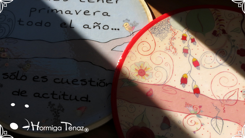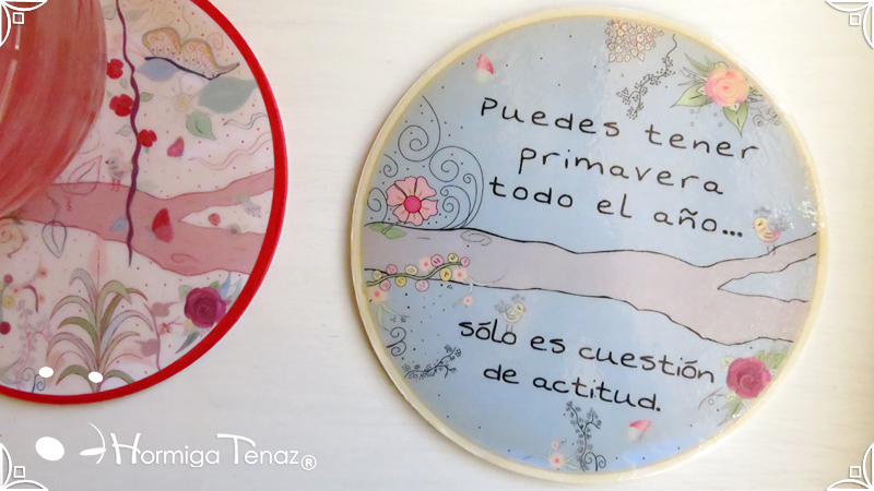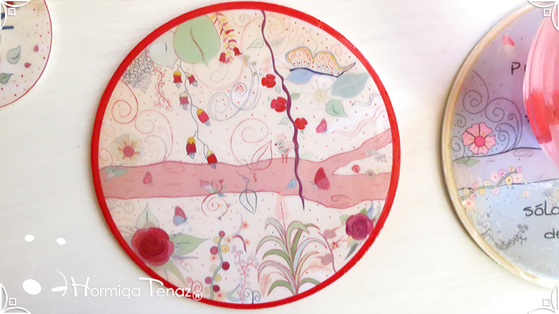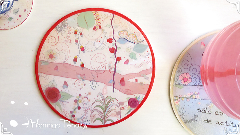 Dos posafuentes de madera realizados a pedido con el mismo diseño de Posavasos & Posafuente Primavera, en color rojo y celeste. Cada pieza fue protegida con barniz brillante. Medidas: 20 cm de diámetro cada pieza. Diseño Personalizado ✎
