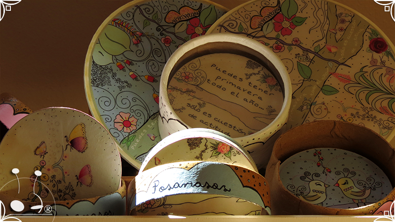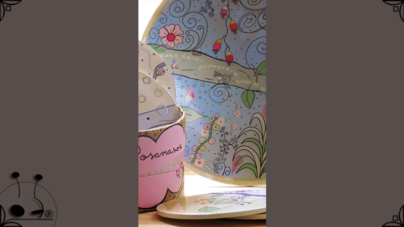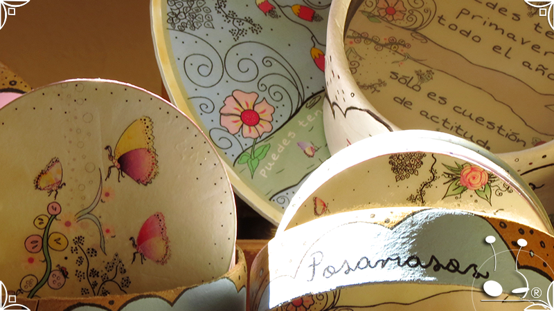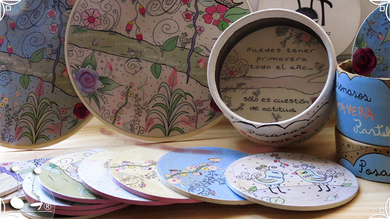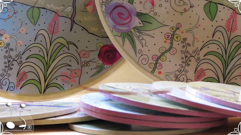 Pack de 4 - 6 y 8 posavasos hechos en madera, con la aplicación de un diseño que abarca la temática de un jardín primaveral. Los posavasos varían en dos paletas de color, una con fondo natural, borde rosa y el otro con fondo celeste y borde blanco + la variedad de colores que conforman el jardín. Además el producto fue protegido con barniz brillante para su función y duración.