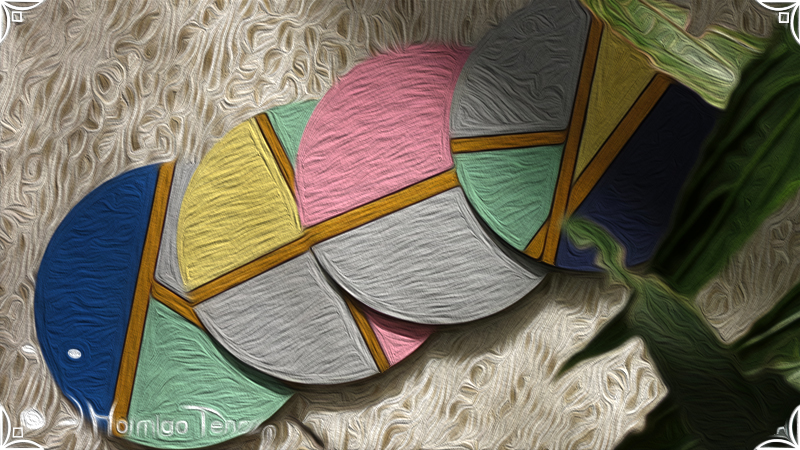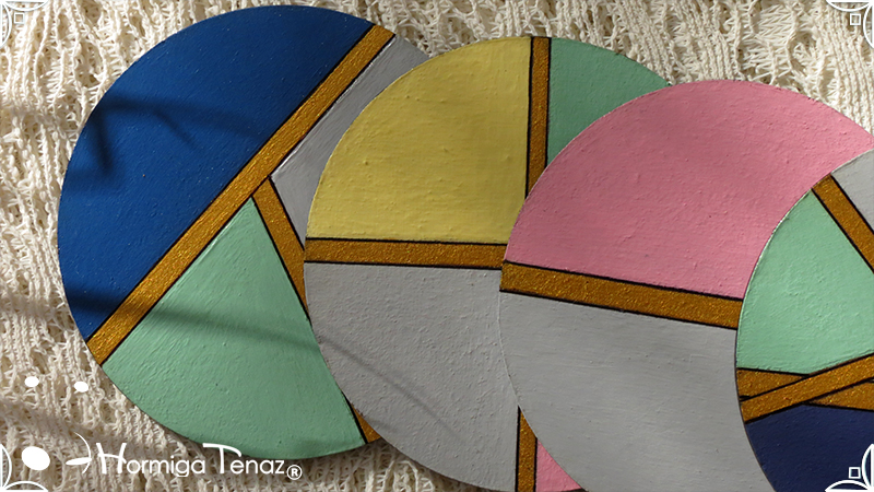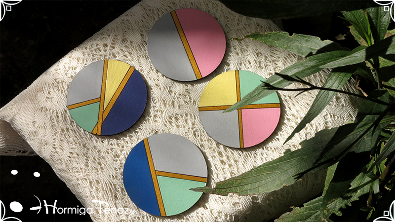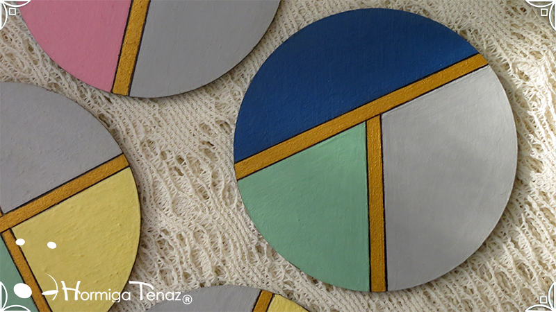 Cuatro posavasos de madera pintados a mano en 7 colores distintos, azul, violeta, rosa, gris claro, amarillo, verde pastel y dorado. Además el producto fue protegido con barniz satinado para su función y duración.