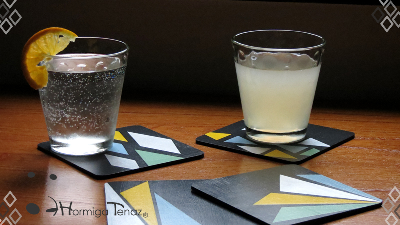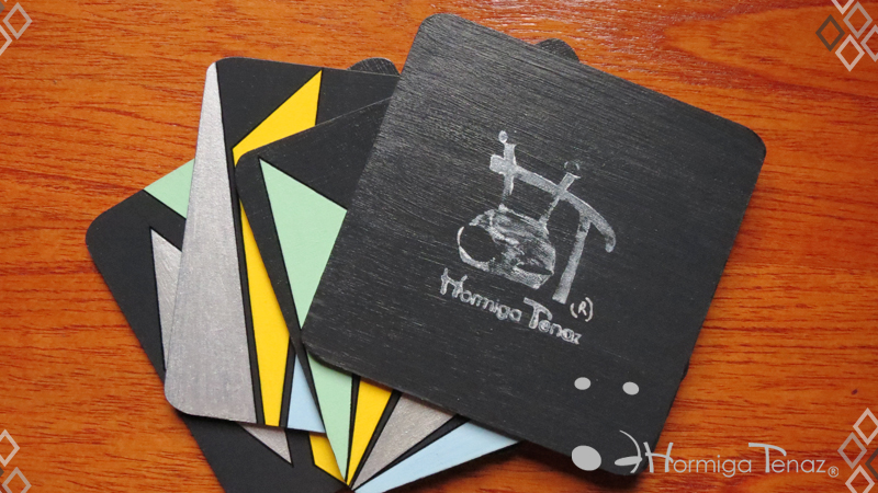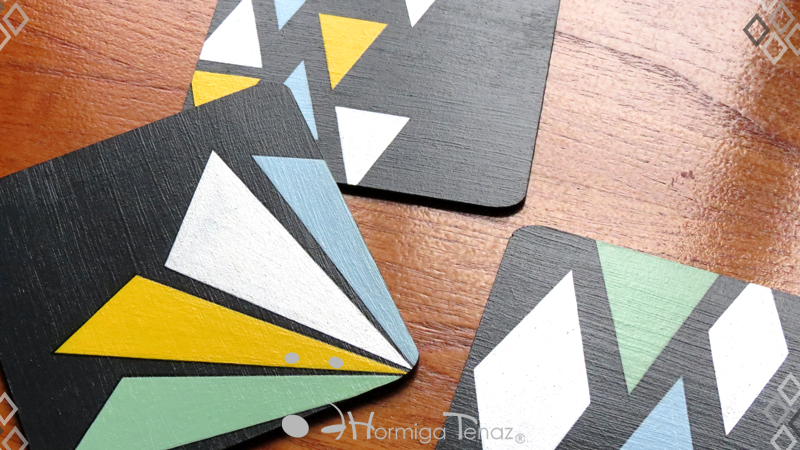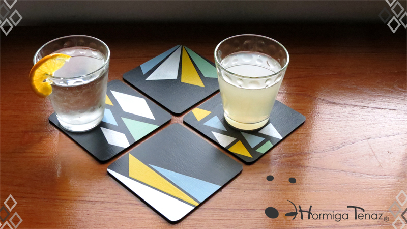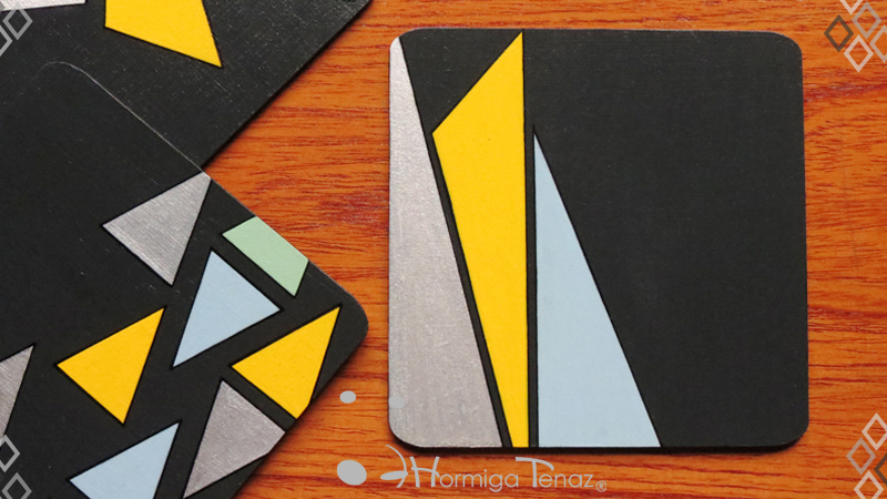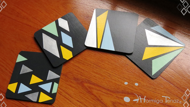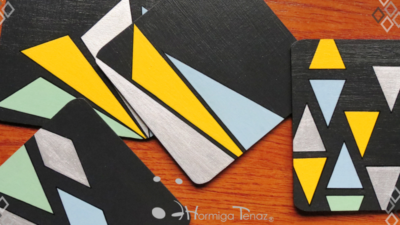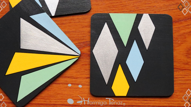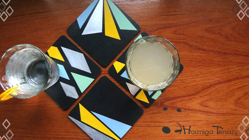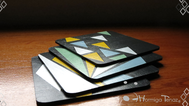 Cuatro posavasos de madera en color negro, decorados con un diseño abstracto pintado a mano usando cuatro colores, amarillo, celeste, verde pastel y plateado. Además cada pieza fue protegida con barniz satinado. Medidas: 12 cm X 12 cm cada posavaso.