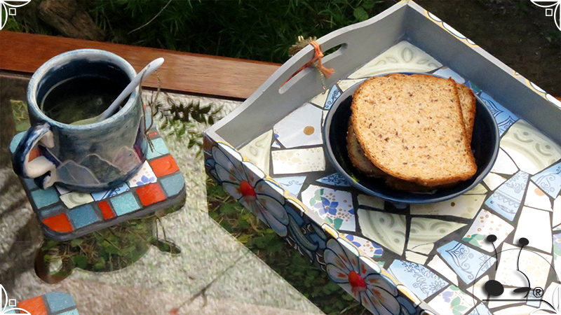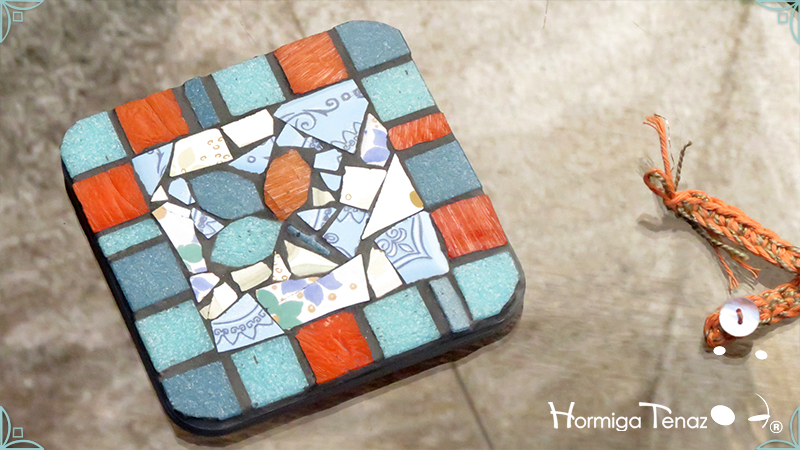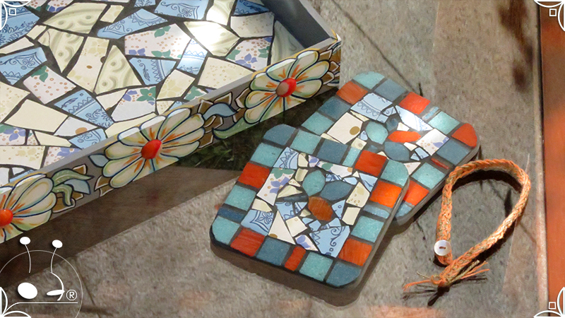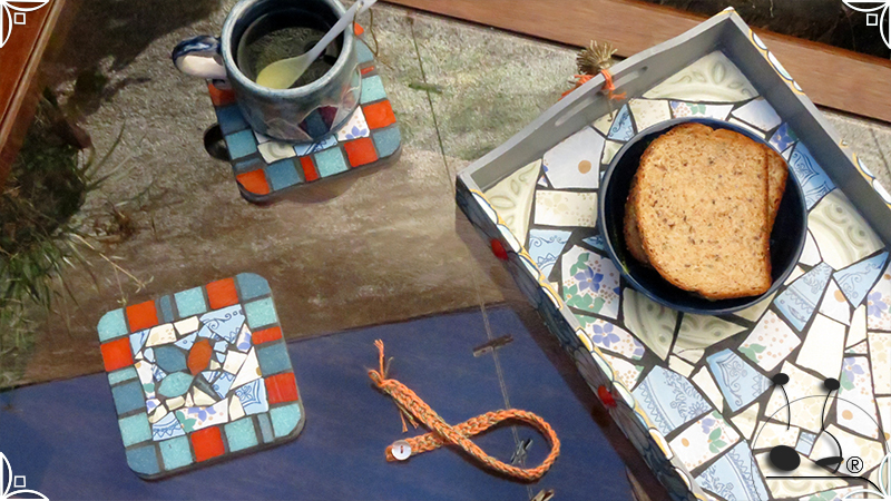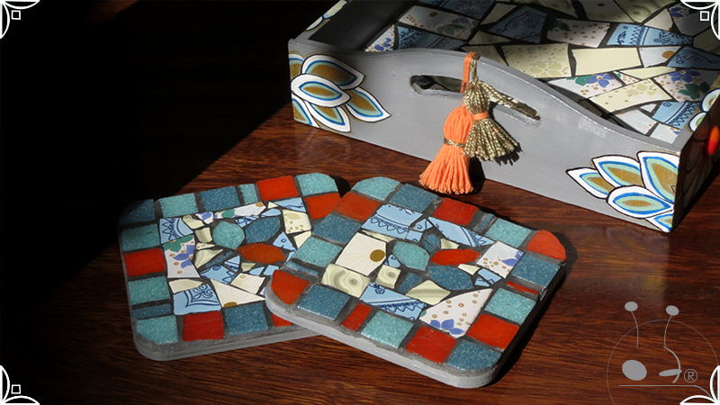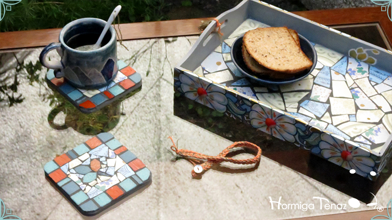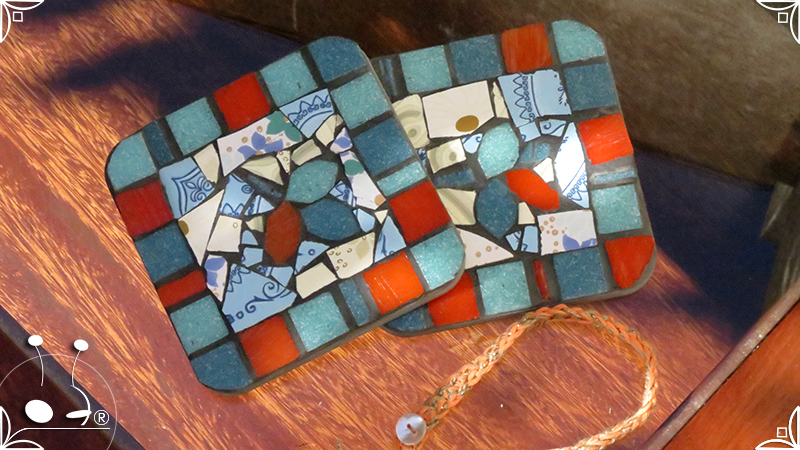 Dos posavasos de madera intervenidos con mosaico de venecitas de azulejo y vidrio, generando motivos naturales. Los posavasos fueron realizados junto con la Bandeja Plaza Floral. Medidas: 12 cm X 12 cm cada posavaso.