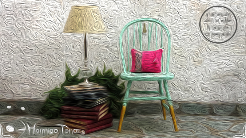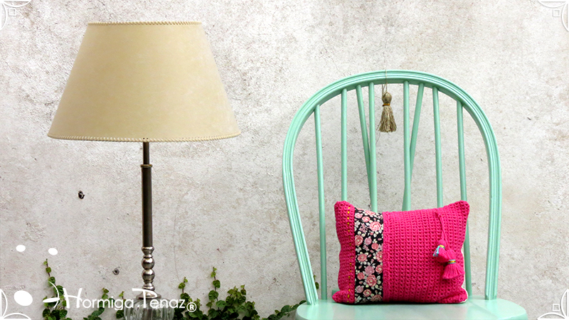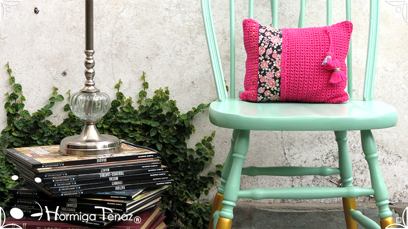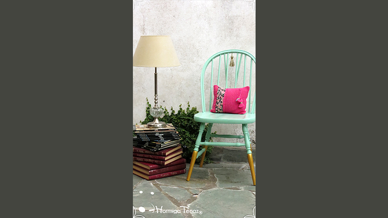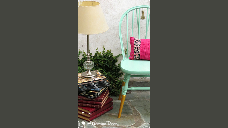 Silla renovada con color, mediante pintura Verde Pastel y dorado + borla de hilo dorado. Con un acabado de barniz semi-mate. Presentada en la foto con Almohadones Étnicos.