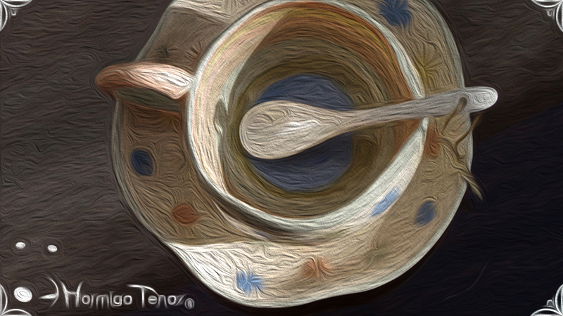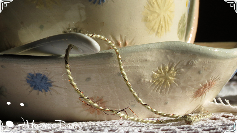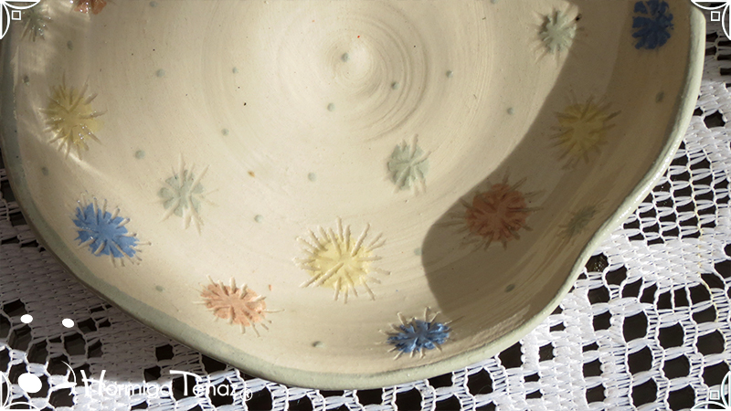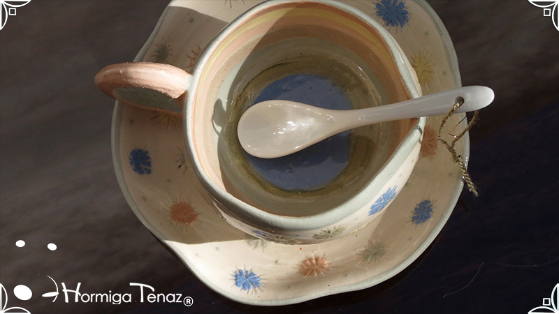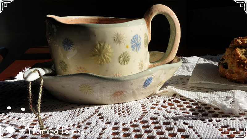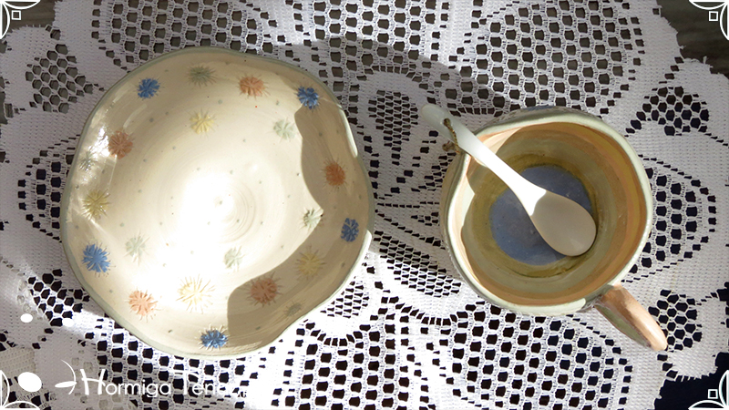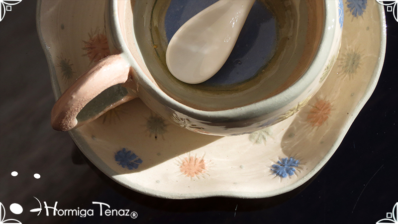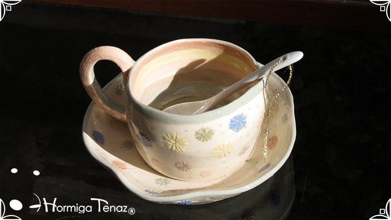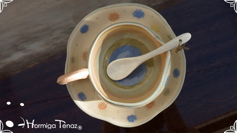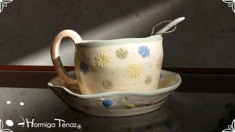Pieza de cerámica artesanal que consta de 3 partes, taza, plato y cuchara realizadas en un estilo orgánico, con formas en movimiento y la asimetría en todas sus piezas recordándonos a la naturaleza misma, junto a los dientes de león con colores imaginativos cubriendo la superficie de las piezas y en el interior de la taza se observa a una geoda con sus muchas capas.