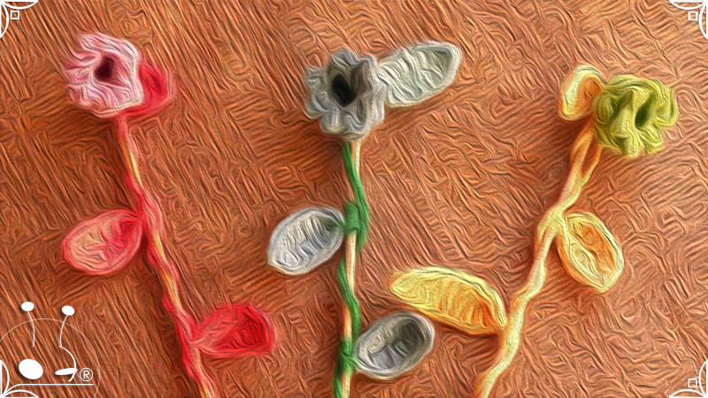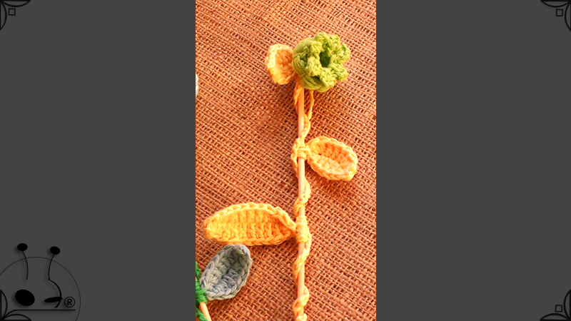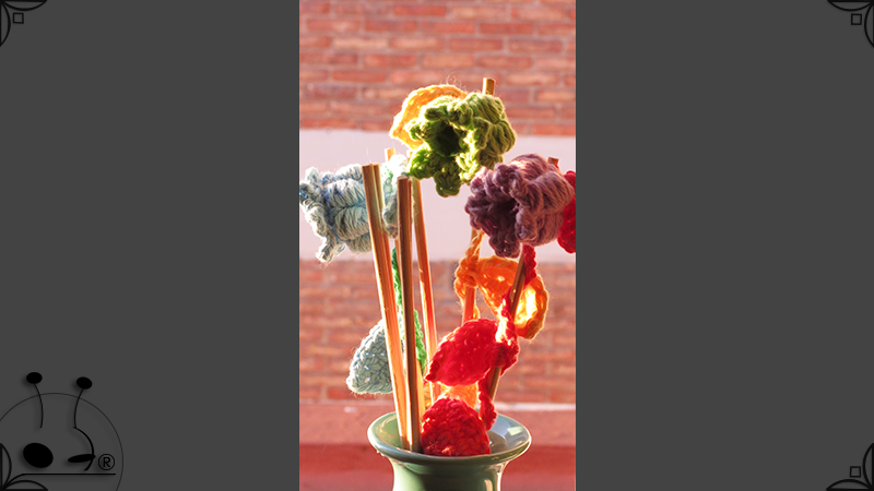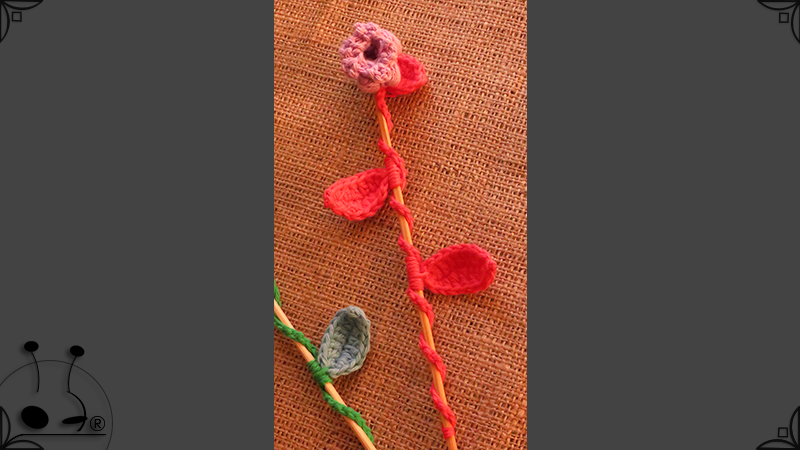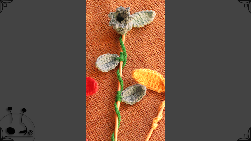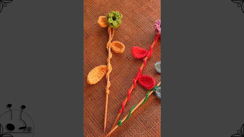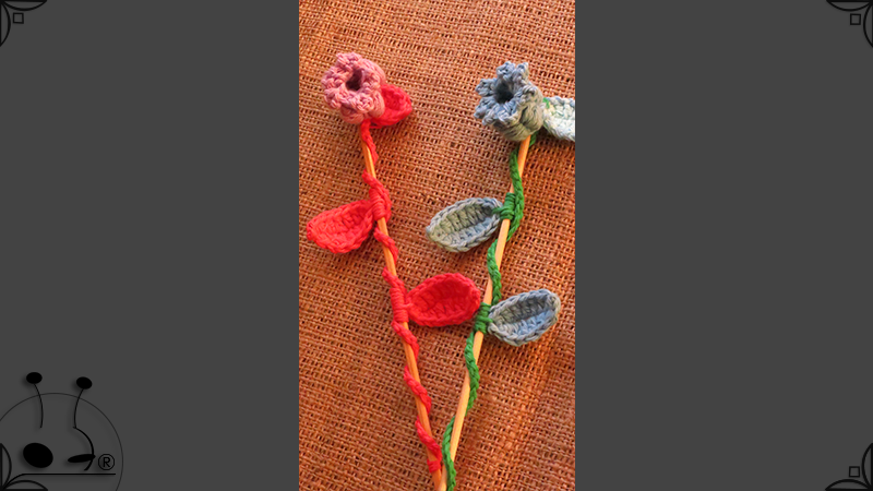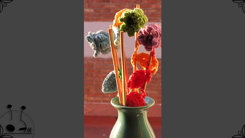Tutores para macetas con diseños de flores campanitas y hojas tejidas en amigurumi, y montadas sobre varillas de madera barnizada.