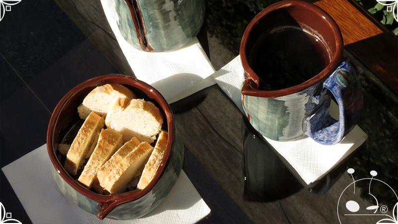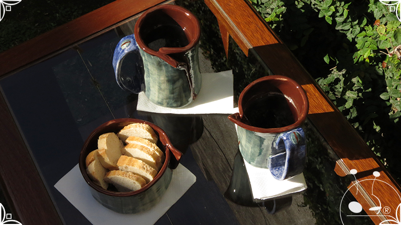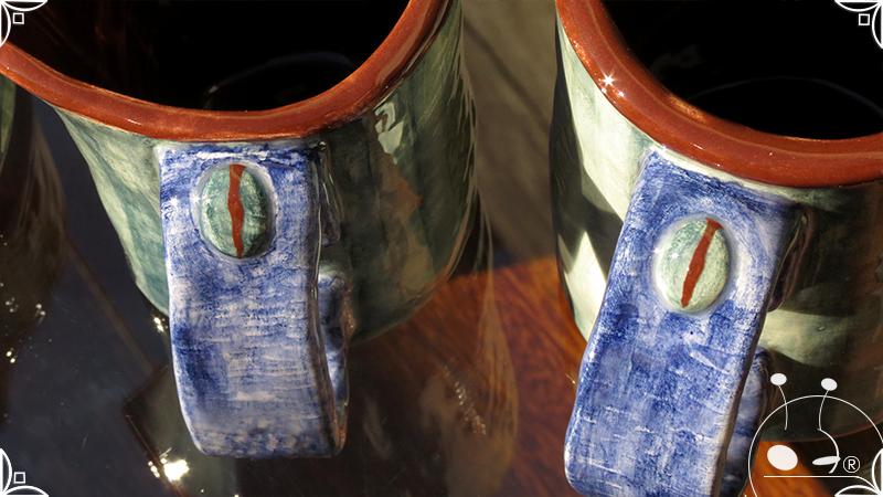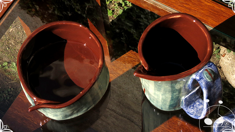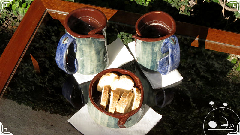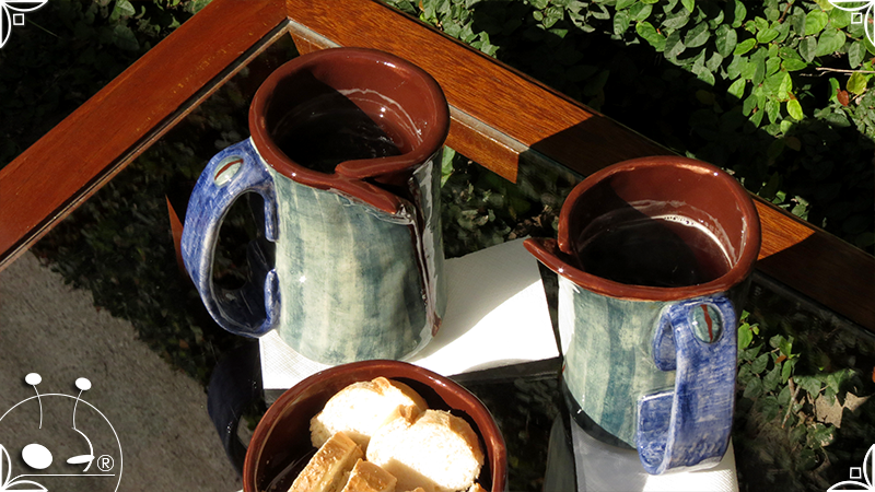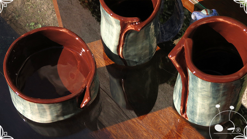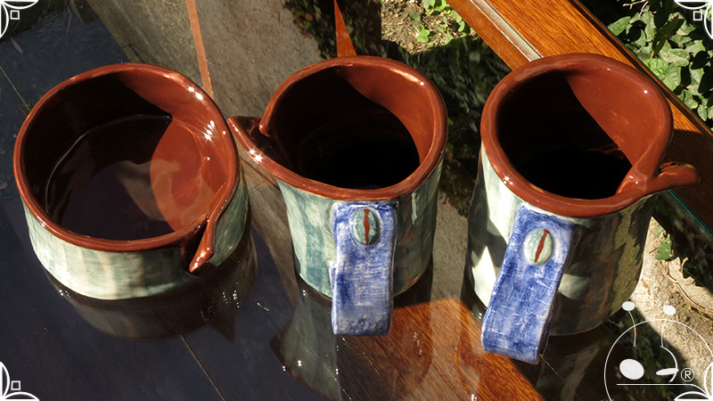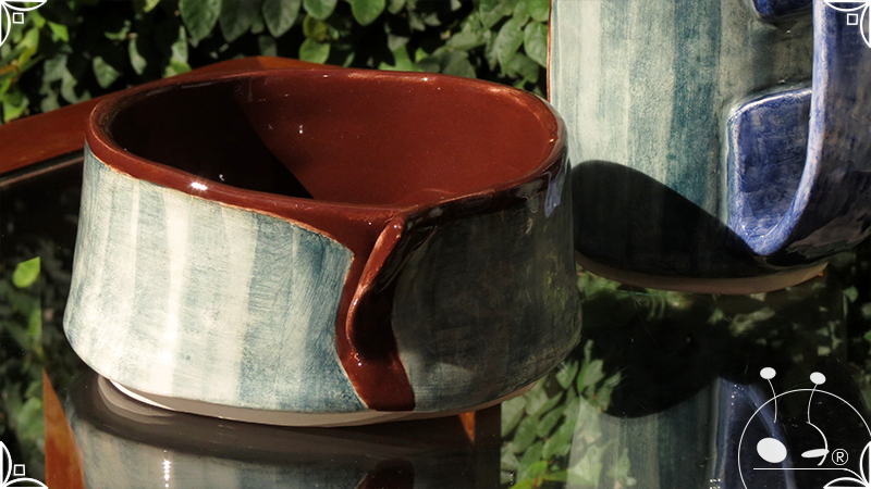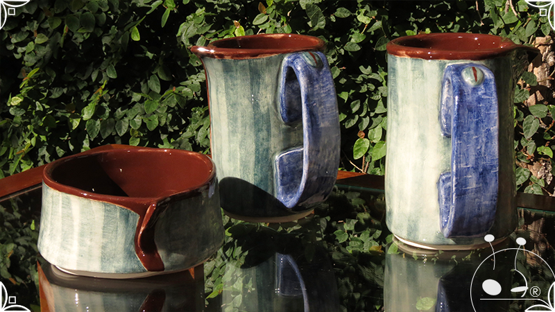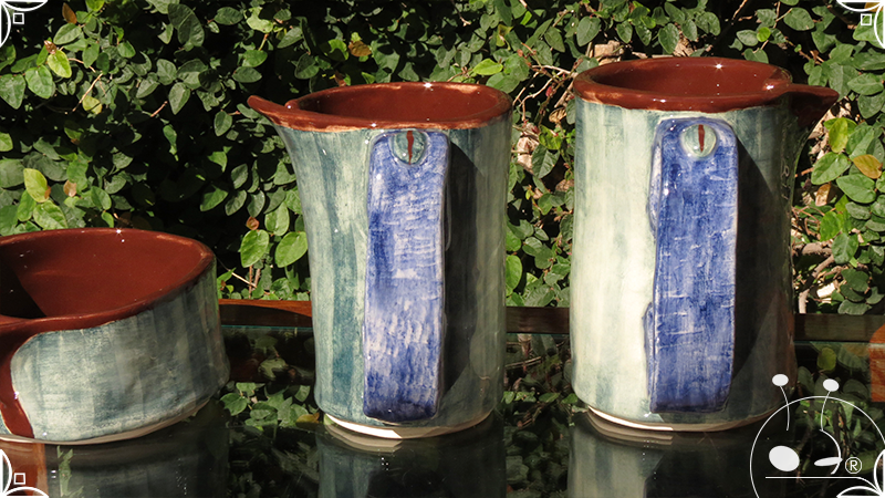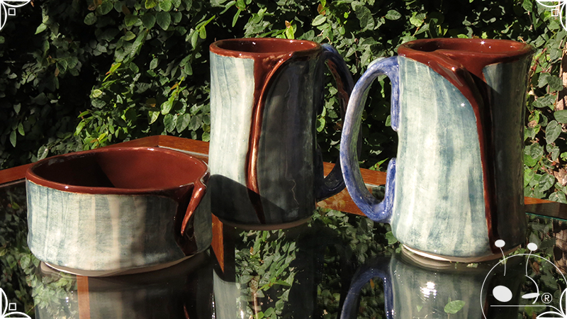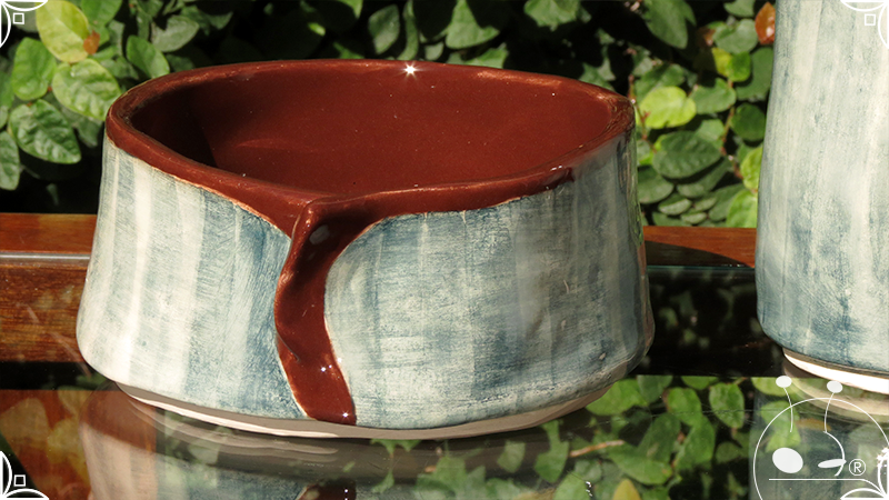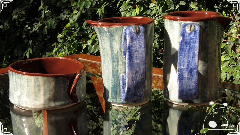 Conjunto de cerámica que integra dos chops y un cuenco, todo realizado en un estilo orgánico, con texturas en preciosos tonos azules y marrón oscuro, más detalle de perla en las asas.